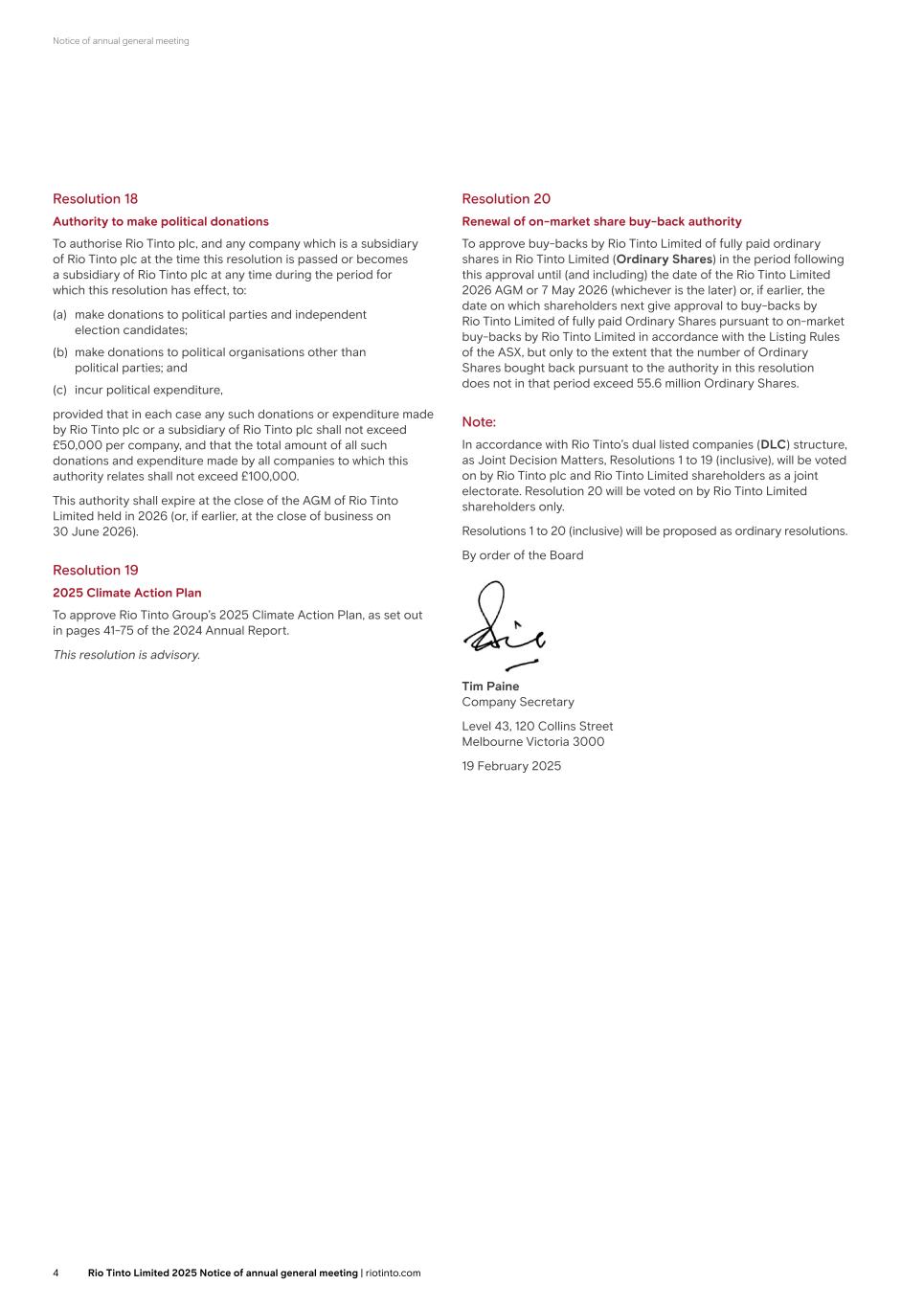 Notice of annual general meeting Resolution 18 Authority to make political donations To authorise Rio Tinto plc, and any company which is a subsidiary of Rio Tinto plc at the time this resolution is passed or becomes a subsidiary of Rio Tinto plc at any time during the period for which this resolution has effect, to: (a) make donations to political parties and independent election candidates; (b) make donations to political organisations other than political parties; and (c) incur political expenditure, provided that in each case any such donations or expenditure made by Rio Tinto plc or a subsidiary of Rio Tinto plc shall not exceed £50,000 per company, and that the total amount of all such donations and expenditure made by all companies to which this authority relates shall not exceed £100,000. This authority shall expire at the close of the AGM of Rio Tinto Limited held in 2026 (or, if earlier, at the close of business on 30 June 2026). Resolution 19 2025 Climate Action Plan To approve Rio Tinto Group’s 2025 Climate Action Plan, as set out in pages 41-75 of the 2024 Annual Report. This resolution is advisory. Resolution 20 Renewal of on-market share buy-back authority To approve buy-backs by Rio Tinto Limited of fully paid ordinary shares in Rio Tinto Limited (Ordinary Shares) in the period following this approval until (and including) the date of the Rio Tinto Limited 2026 AGM or 7 May 2026 (whichever is the later) or, if earlier, the date on which shareholders next give approval to buy-backs by Rio Tinto Limited of fully paid Ordinary Shares pursuant to on-market buy-backs by Rio Tinto Limited in accordance with the Listing Rules of the ASX, but only to the extent that the number of Ordinary Shares bought back pursuant to the authority in this resolution does not in that period exceed 55.6 million Ordinary Shares. Note: In accordance with Rio Tinto’s dual listed companies (DLC) structure, as Joint Decision Matters, Resolutions 1 to 19 (inclusive), will be voted on by Rio Tinto plc and Rio Tinto Limited shareholders as a joint electorate. Resolution 20 will be voted on by Rio Tinto Limited shareholders only. Resolutions 1 to 20 (inclusive) will be proposed as ordinary resolutions. By order of the Board Tim Paine Company Secretary Level 43, 120 Collins Street Melbourne Victoria 3000 19 February 2025 4 Rio Tinto Limited 2025 Notice of annual general meeting | riotinto.com