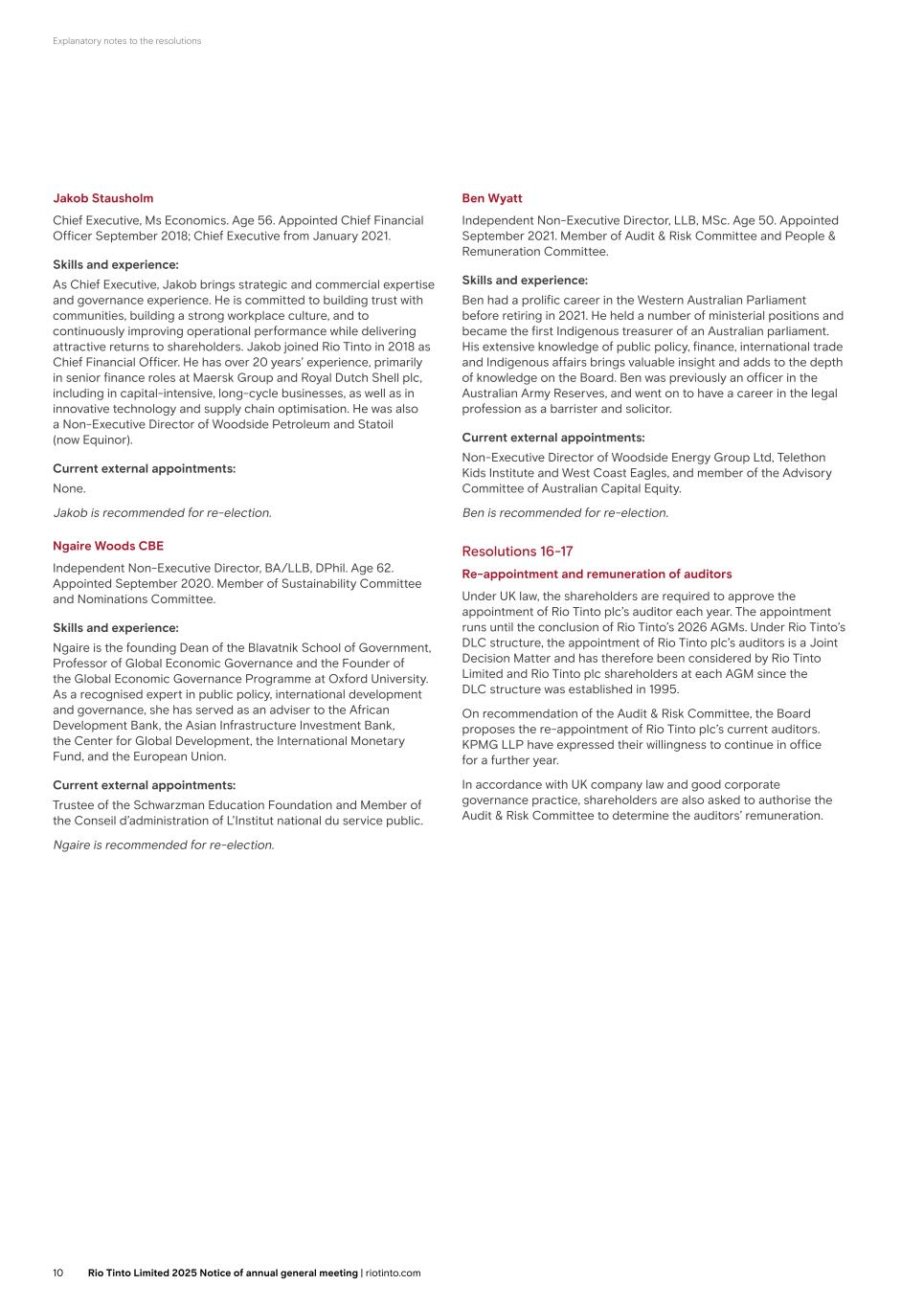 Explanatory notes to the resolutions Jakob Stausholm Chief Executive, Ms Economics. Age 56. Appointed Chief Financial Officer September 2018; Chief Executive from January 2021. Skills and experience: As Chief Executive, Jakob brings strategic and commercial expertise and governance experience. He is committed to building trust with communities, building a strong workplace culture, and to continuously improving operational performance while delivering attractive returns to shareholders. Jakob joined Rio Tinto in 2018 as Chief Financial Officer. He has over 20 years’ experience, primarily in senior finance roles at Maersk Group and Royal Dutch Shell plc, including in capital-intensive, long-cycle businesses, as well as in innovative technology and supply chain optimisation. He was also a Non-Executive Director of Woodside Petroleum and Statoil (now Equinor). Current external appointments: None. Jakob is recommended for re-election. Ngaire Woods CBE Independent Non-Executive Director, BA/LLB, DPhil. Age 62. Appointed September 2020. Member of Sustainability Committee and Nominations Committee. Skills and experience: Ngaire is the founding Dean of the Blavatnik School of Government, Professor of Global Economic Governance and the Founder of the Global Economic Governance Programme at Oxford University. As a recognised expert in public policy, international development and governance, she has served as an adviser to the African Development Bank, the Asian Infrastructure Investment Bank, the Center for Global Development, the International Monetary Fund, and the European Union. Current external appointments: Trustee of the Schwarzman Education Foundation and Member of the Conseil d’administration of L’Institut national du service public. Ngaire is recommended for re-election. Ben Wyatt Independent Non-Executive Director, LLB, MSc. Age 50. Appointed September 2021. Member of Audit & Risk Committee and People & Remuneration Committee. Skills and experience: Ben had a prolific career in the Western Australian Parliament before retiring in 2021. He held a number of ministerial positions and became the first Indigenous treasurer of an Australian parliament. His extensive knowledge of public policy, finance, international trade and Indigenous affairs brings valuable insight and adds to the depth of knowledge on the Board. Ben was previously an officer in the Australian Army Reserves, and went on to have a career in the legal profession as a barrister and solicitor. Current external appointments: Non-Executive Director of Woodside Energy Group Ltd, Telethon Kids Institute and West Coast Eagles, and member of the Advisory Committee of Australian Capital Equity. Ben is recommended for re-election. Resolutions 16-17 Re-appointment and remuneration of auditors Under UK law, the shareholders are required to approve the appointment of Rio Tinto plc’s auditor each year. The appointment runs until the conclusion of Rio Tinto’s 2026 AGMs. Under Rio Tinto’s DLC structure, the appointment of Rio Tinto plc’s auditors is a Joint Decision Matter and has therefore been considered by Rio Tinto Limited and Rio Tinto plc shareholders at each AGM since the DLC structure was established in 1995. On recommendation of the Audit & Risk Committee, the Board proposes the re-appointment of Rio Tinto plc’s current auditors. KPMG LLP have expressed their willingness to continue in office for a further year. In accordance with UK company law and good corporate governance practice, shareholders are also asked to authorise the Audit & Risk Committee to determine the auditors’ remuneration. 10 Rio Tinto Limited 2025 Notice of annual general meeting | riotinto.com