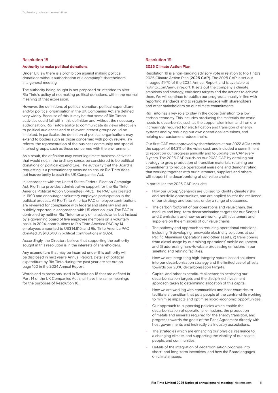 Explanatory notes to the resolutions Resolution 18 Authority to make political donations Under UK law there is a prohibition against making political donations without authorisation of a company’s shareholders in a general meeting. The authority being sought is not proposed or intended to alter Rio Tinto’s policy of not making political donations, within the normal meaning of that expression. However, the definitions of political donation, political expenditure and/or political organisation in the UK Companies Act are defined very widely. Because of this, it may be that some of Rio Tinto’s activities could fall within this definition and, without the necessary authorisation, Rio Tinto’s ability to communicate its views effectively to political audiences and to relevant interest groups could be inhibited. In particular, the definition of political organisations may extend to bodies such as those concerned with policy review, law reform, the representation of the business community and special interest groups, such as those concerned with the environment. As a result, the definition may cover legitimate business activities that would not, in the ordinary sense, be considered to be political donations or political expenditure. The authority that the Board is requesting is a precautionary measure to ensure Rio Tinto does not inadvertently breach the UK Companies Act. In accordance with the United States Federal Election Campaign Act, Rio Tinto provides administrative support for the Rio Tinto America Political Action Committee (PAC). The PAC was created in 1990 and encourages voluntary employee participation in the political process. All Rio Tinto America PAC employee contributions are reviewed for compliance with federal and state law and are publicly reported in accordance with US election laws. The PAC is controlled by neither Rio Tinto nor any of its subsidiaries but instead by a governing board of five employee members on a voluntary basis. In 2024, contributions to Rio Tinto America PAC by 14 employees amounted to US$14,815, and Rio Tinto America PAC donated US$10,500 in political contributions in 2024. Accordingly, the Directors believe that supporting the authority sought in this resolution is in the interests of shareholders. Any expenditure that may be incurred under this authority will be disclosed in next year’s Annual Report. Details of political expenditure by Rio Tinto during the past year are set out on page 150 in the 2024 Annual Report. Words and expressions used in Resolution 18 that are defined in Part 14 of the UK Companies Act shall have the same meanings for the purposes of Resolution 18. Resolution 19 2025 Climate Action Plan Resolution 19 is a non-binding advisory vote in relation to Rio Tinto’s 2025 Climate Action Plan (2025 CAP). The 2025 CAP is set out in pages 41-75 of the 2024 Annual Report and is available at riotinto.com/annualreport. It sets out the company’s climate ambitions and strategy, emissions targets and the actions to achieve them. We will continue to publish our progress annually in line with reporting standards and to regularly engage with shareholders and other stakeholders on our climate commitments. Rio Tinto has a key role to play in the global transition to a low carbon economy. This includes producing the materials the world needs to decarbonise such as the copper, aluminium and iron ore increasingly required for electrification and transition of energy systems and by reducing our own operational emissions, and helping our customers reduce theirs. Our first CAP was approved by shareholders at our 2022 AGMs with the support of 84.3% of the votes cast, and included a commitment to report on our progress annually and to update the CAP every 3 years. The 2025 CAP builds on our 2022 CAP by detailing our strategy to grow production of transition materials, retaining our commitments to reduce operational emissions and demonstrating that working together with our customers, suppliers and others will support the decarbonising of our value chains. In particular, the 2025 CAP includes: – How our Group Scenarios are utilised to identify climate risks and portfolio opportunities, and are applied to test the resilience of our strategy and business under a range of outcomes. – The carbon footprint of our operations and value chain, the medium and long-term decarbonisation targets for our Scope 1 and 2 emissions and how we are working with customers and suppliers on the emissions of our value chains. – The pathway and approach to reducing operational emissions including: 1) developing renewable electricity solutions at our Pacific Aluminium Operations and other assets, 2) transitioning from diesel usage by our mining operations’ mobile equipment, and 3) addressing hard-to-abate processing emissions in our smelting and refining facilities. – How we are integrating high-integrity nature-based solutions into our decarbonisation strategy and the limited use of offsets towards our 2030 decarbonisation targets. – Capital and other expenditure allocated to achieving our decarbonisation targets and the disciplined investment approach taken to determining allocation of this capital. – How we are working with communities and host countries to facilitate a transition that puts people at the centre while working to minimise impacts and optimise socio-economic opportunities. – Our approach to supporting policies which enable the decarbonisation of operational emissions, the production of metals and minerals required for the energy transition, and progress towards the goals of the Paris Agreement directly with host governments and indirectly via industry associations. – The strategies which are enhancing our physical resilience to a changing climate, and supporting the viability of our assets, people, and communities. – Details of the integration of decarbonisation progress into short- and long-term incentives, and how the Board engag