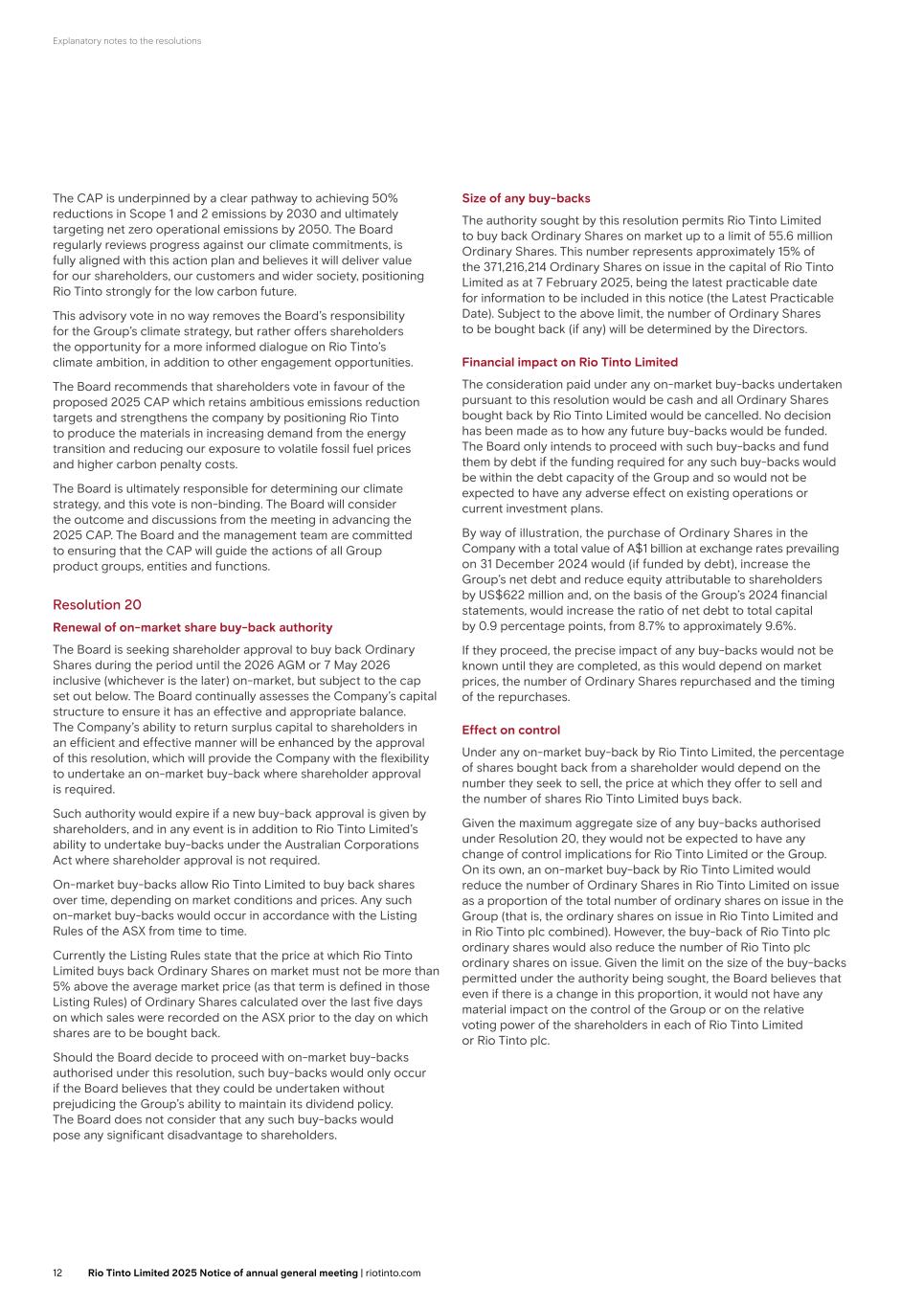 Explanatory notes to the resolutions The CAP is underpinned by a clear pathway to achieving 50% reductions in Scope 1 and 2 emissions by 2030 and ultimately targeting net zero operational emissions by 2050. The Board regularly reviews progress against our climate commitments, is fully aligned with this action plan and believes it will deliver value for our shareholders, our customers and wider society, positioning Rio Tinto strongly for the low carbon future. This advisory vote in no way removes the Board’s responsibility for the Group’s climate strategy, but rather offers shareholders the opportunity for a more informed dialogue on Rio Tinto’s climate ambition, in addition to other engagement opportunities. The Board recommends that shareholders vote in favour of the proposed 2025 CAP which retains ambitious emissions reduction targets and strengthens the company by positioning Rio Tinto to produce the materials in increasing demand from the energy transition and reducing our exposure to volatile fossil fuel prices and higher carbon penalty costs. The Board is ultimately responsible for determining our climate strategy, and this vote is non-binding. The Board will consider the outcome and discussions from the meeting in advancing the 2025 CAP. The Board and the management team are committed to ensuring that the CAP will guide the actions of all Group product groups, entities and functions. Resolution 20 Renewal of on-market share buy-back authority The Board is seeking shareholder approval to buy back Ordinary Shares during the period until the 2026 AGM or 7 May 2026 inclusive (whichever is the later) on-market, but subject to the cap set out below. The Board continually assesses the Company’s capital structure to ensure it has an effective and appropriate balance. The Company’s ability to return surplus capital to shareholders in an efficient and effective manner will be enhanced by the approval of this resolution, which will provide the Company with the flexibility to undertake an on-market buy-back where shareholder approval is required. Such authority would expire if a new buy-back approval is given by shareholders, and in any event is in addition to Rio Tinto Limited’s ability to undertake buy-backs under the Australian Corporations Act where shareholder approval is not required. On-market buy-backs allow Rio Tinto Limited to buy back shares over time, depending on market conditions and prices. Any such on-market buy-backs would occur in accordance with the Listing Rules of the ASX from time to time. Currently the Listing Rules state that the price at which Rio Tinto Limited buys back Ordinary Shares on market must not be more than 5% above the average market price (as that term is defined in those Listing Rules) of Ordinary Shares calculated over the last five days on which sales were recorded on the ASX prior to the day on which shares are to be bought back. Should the Board decide to proceed with on-market buy-backs authorised under this resolution, such buy-backs would only occur if the Board believes that they could be undertaken without prejudicing the Group’s ability to maintain its dividend policy. The Board does not consider that any such buy-backs would pose any significant disadvantage to shareholders. Size of any buy-backs The authority sought by this resolution permits Rio Tinto Limited to buy back Ordinary Shares on market up to a limit of 55.6 million Ordinary Shares. This number represents approximately 15% of the 371,216,214 Ordinary Shares on issue in the capital of Rio Tinto Limited as at 7 February 2025, being the latest practicable date for information to be included in this notice (the Latest Practicable Date). Subject to the above limit, the number of Ordinary Shares to be bought back (if any) will be determined by the Directors. Financial impact on Rio Tinto Limited The consideration paid under any on-market buy-backs undertaken pursuant to this resolution would be cash and all Ordinary Shares bought back by Rio Tinto Limited would be cancelled. No decision has been made as to how any future buy-backs would be funded. The Board only intends to proceed with such buy-backs and fund them by debt if the funding required for any such buy-backs would be within the debt capacity of the Group and so would not be expected to have any adverse effect on existing operations or current investment plans. By way of illustration, the purchase of Ordinary Shares in the Company with a total value of A$1 billion at exchange rates prevailing on 31 December 2024 would (if funded by debt), increase the Group’s net debt and reduce equity attributable to shareholders by US$622 million and, on the basis of the Group’s 2024 financial statements, would increase the ratio of net debt to total capital by 0.9 percentage points, from 8.7% to approximately 9.6%. If they proceed, the precise impact of any buy-backs would not be known until they are completed, as this would depend on market prices, the number of Ordinary Shares repurchased and the timing of the repurchases. Effect on control Under any on-market buy-back by Rio Tinto Limited, the percentage of shares bought back from a shareholder would depend on the number they seek to sell, the price at which they offer to sell and the number of shares Rio Tinto Limited buys back. Given the maximum aggregate size of any buy-backs authorised under Resolution 20, they would not be expected to have any change of control implications for Rio Tinto Limited or the Group. On its own, an on-market buy-back by Rio Tinto Limited would reduce the number of Ordinary Shares in Rio Tinto Limited on issue as a proportion of the total number of ordinary shares on issue in the Group (that is, the ordinary shares on issue in Rio Tinto Limited and in Rio Tinto plc combined). However, the buy-back of Rio Tinto plc ordinary shares would also reduce the number of Rio Tinto plc ordinary shares on issue. Given the limit on the size of the buy-bac