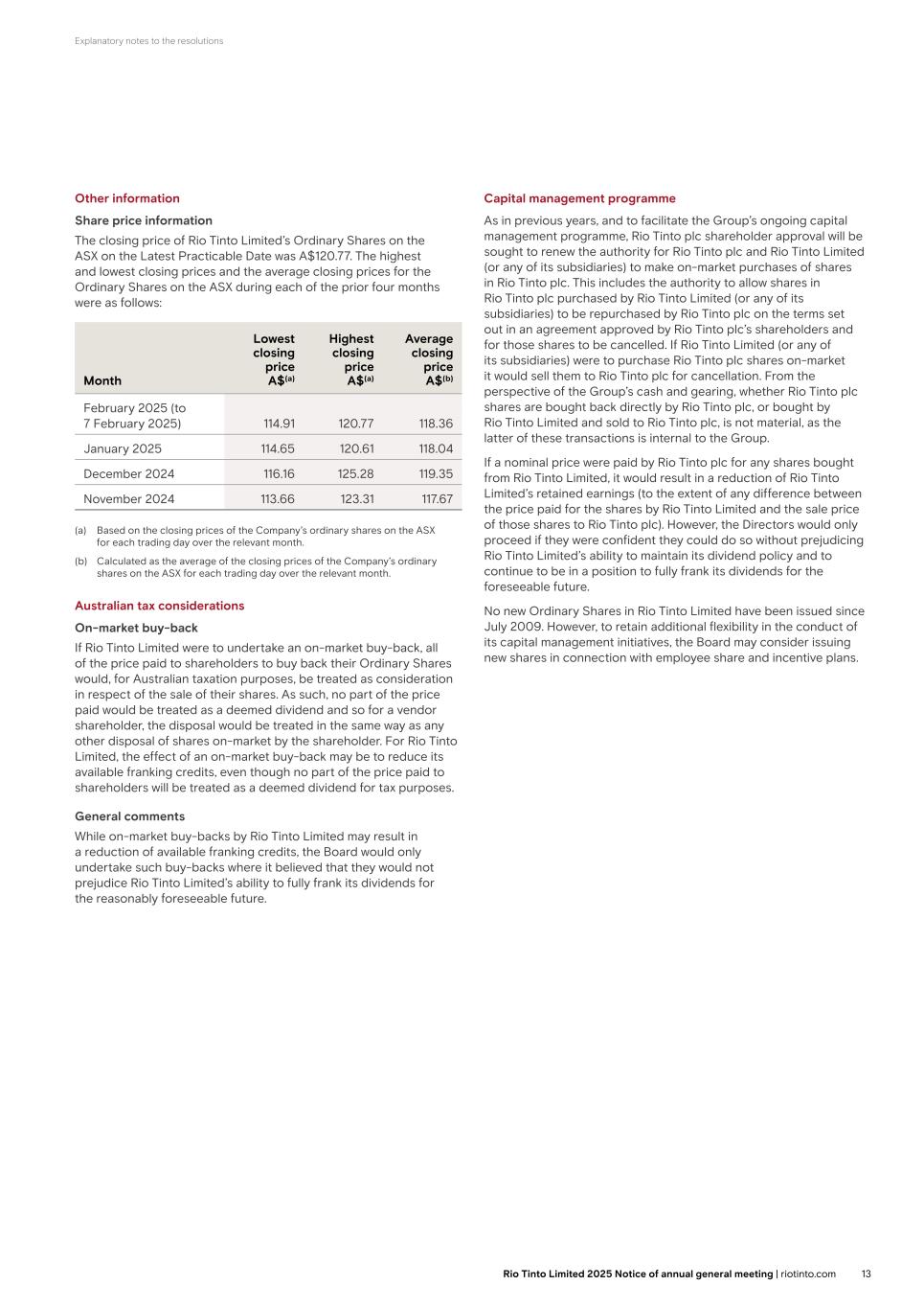 Explanatory notes to the resolutions Other information Share price information The closing price of Rio Tinto Limited’s Ordinary Shares on the ASX on the Latest Practicable Date was A$120.77. The highest and lowest closing prices and the average closing prices for the Ordinary Shares on the ASX during each of the prior four months were as follows: Month Lowest closing price A$(a) Highest closing price A$(a) Average closing price A$(b) February 2025 (to 7 February 2025) 114.91 120.77 118.36 January 2025 114.65 120.61 118.04 December 2024 116.16 125.28 119.35 November 2024 113.66 123.31 117.67 (a) Based on the closing prices of the Company’s ordinary shares on the ASX for each trading day over the relevant month. (b) Calculated as the average of the closing prices of the Company’s ordinary shares on the ASX for each trading day over the relevant month. Australian tax considerations On-market buy-back If Rio Tinto Limited were to undertake an on-market buy-back, all of the price paid to shareholders to buy back their Ordinary Shares would, for Australian taxation purposes, be treated as consideration in respect of the sale of their shares. As such, no part of the price paid would be treated as a deemed dividend and so for a vendor shareholder, the disposal would be treated in the same way as any other disposal of shares on-market by the shareholder. For Rio Tinto Limited, the effect of an on-market buy-back may be to reduce its available franking credits, even though no part of the price paid to shareholders will be treated as a deemed dividend for tax purposes. General comments While on-market buy-backs by Rio Tinto Limited may result in a reduction of available franking credits, the Board would only undertake such buy-backs where it believed that they would not prejudice Rio Tinto Limited’s ability to fully frank its dividends for the reasonably foreseeable future. Capital management programme As in previous years, and to facilitate the Group’s ongoing capital management programme, Rio Tinto plc shareholder approval will be sought to renew the authority for Rio Tinto plc and Rio Tinto Limited (or any of its subsidiaries) to make on-market purchases of shares in Rio Tinto plc. This includes the authority to allow shares in Rio Tinto plc purchased by Rio Tinto Limited (or any of its subsidiaries) to be repurchased by Rio Tinto plc on the terms set out in an agreement approved by Rio Tinto plc’s shareholders and for those shares to be cancelled. If Rio Tinto Limited (or any of its subsidiaries) were to purchase Rio Tinto plc shares on-market it would sell them to Rio Tinto plc for cancellation. From the perspective of the Group’s cash and gearing, whether Rio Tinto plc shares are bought back directly by Rio Tinto plc, or bought by Rio Tinto Limited and sold to Rio Tinto plc, is not material, as the latter of these transactions is internal to the Group. If a nominal price were paid by Rio Tinto plc for any shares bought from Rio Tinto Limited, it would result in a reduction of Rio Tinto Limited’s retained earnings (to the extent of any difference between the price paid for the shares by Rio Tinto Limited and the sale price of those shares to Rio Tinto plc). However, the Directors would only proceed if they were confident they could do so without prejudicing Rio Tinto Limited’s ability to maintain its dividend policy and to continue to be in a position to fully frank its dividends for the foreseeable future. No new Ordinary Shares in Rio Tinto Limited have been issued since July 2009. However, to retain additional flexibility in the conduct of its capital management initiatives, the Board may consider issuing new shares in connection with employee share and incentive plans. 13Rio Tinto Limited 2025 Notice of annual general meeting | riotinto.com