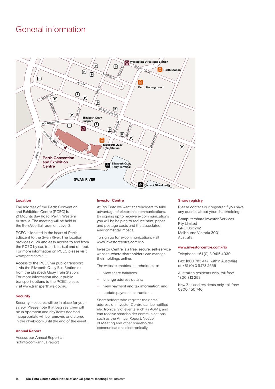 General information Location The address of the Perth Convention and Exhibition Centre (PCEC) is 21 Mounts Bay Road, Perth, Western Australia. The meeting will be held in the BelleVue Ballroom on Level 3. PCEC is located in the heart of Perth, adjacent to the Swan River. The location provides quick and easy access to and from the PCEC by car, train, bus, taxi and on foot. For more information on PCEC please visit www.pcec.com.au. Access to the PCEC via public transport is via the Elizabeth Quay Bus Station or from the Elizabeth Quay Train Station. For more information about public transport options to the PCEC, please visit www.transperth.wa.gov.au. Security Security measures will be in place for your safety. Please note that bag searches will be in operation and any items deemed inappropriate will be removed and stored in the cloakroom until the end of the event. Annual Report Access our Annual Report at riotinto.com/annualreport Investor Centre At Rio Tinto we want shareholders to take advantage of electronic communications. By signing up to receive e-communications you will be helping to reduce print, paper and postage costs and the associated environmental impact. To sign up for e-communications visit www.investorcentre.com/rio Investor Centre is a free, secure, self-service website, where shareholders can manage their holdings online. The website enables shareholders to: – view share balances; – change address details; – view payment and tax information; and – update payment instructions. Shareholders who register their email address on Investor Centre can be notified electronically of events such as AGMs, and can receive shareholder communications such as the Annual Report, Notice of Meeting and other shareholder communications electronically. Share registry Please contact our registrar if you have any queries about your shareholding: Computershare Investor Services Pty Limited GPO Box 242 Melbourne Victoria 3001 Australia www.investorcentre.com/rio Telephone: +61 (0) 3 9415 4030 Fax: 1800 783 447 (within Australia) or +61 (0) 3 9473 2555 Australian residents only, toll free: 1800 813 292 New Zealand residents only, toll free: 0800 450 740 M IT CH EL L FR EE W A Y MOUNTS BAY RD W IL LI AM S T RIVERSIDE DRIVE ST GEORGES TCE MOUNT ST SP RI N G S T M IL L ST H O W AR D S T BA RR AC K ST HAY ST MURRAY ST WELLINGTON ST KI N G S T Q U EE N S T Perth Convention and Exhibition Centre SWAN RIVER Elizabeth Quay Busport Perth Underground Elizabeth Quay Train Station Wellington Street Bus Station Perth Station Elizabeth Quay Ferry Terminal Barrack Street Jetty 14 Rio Tinto Limited 2025 Notice of annual general meeting | riotinto.com