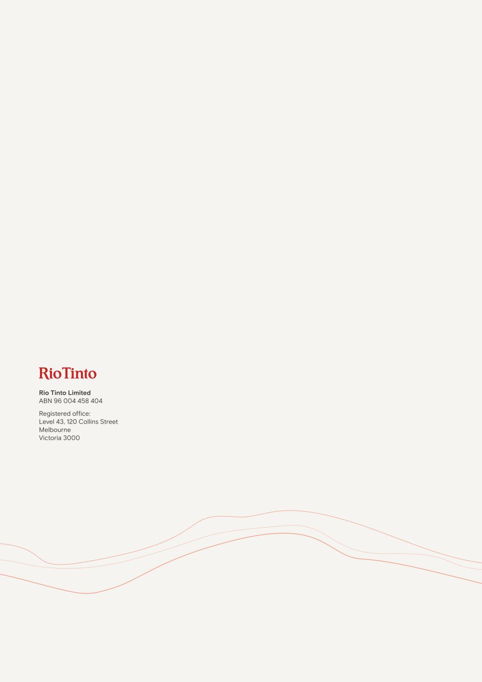 Further information about the meeting Shareholders entitled to vote For the purposes of the Corporations Act 2001 (Cth) (the Australian Corporations Act), Rio Tinto Limited has determined that securities of Rio Tinto Limited that are quoted securities at 7:00pm (AEST) on Tuesday, 29 April 2025 will be taken, for the purposes of the meeting, to be held by the persons who held them at that time. Voting exclusions Resolutions 2 and 3 Rio Tinto will disregard any votes cast on: – Resolutions 2 and 3 by or on behalf of any person named in the Remuneration Report for the year ended 31 December 2024 as a member of Key Management Personnel (KMP) (as defined in the Australian Corporations Act), or their closely related parties, regardless of the capacity in which the vote is cast; and – Resolutions 2 and 3 as a proxy by a person who is a member of KMP at the date of the meeting or their closely related parties, unless the vote is cast as proxy for a person entitled to vote on the relevant resolutions (as applicable): – in accordance with a direction in the proxy form; or – by the chair of the meeting pursuant to an express authorisation to exercise the proxy. Voting by proxy A shareholder entitled to attend and vote at the meeting is entitled to appoint up to two proxies. A proxy need not be a shareholder of Rio Tinto Limited. If a shareholder appoints two proxies, the shareholder may specify the proportion or number of votes each proxy is appointed to exercise. If no proportion or number is specified, each proxy may exercise half the shareholder’s votes. Fractions of votes will be disregarded. The proxy form contains instructions for appointing two proxies. Directing your proxy how to vote If a shareholder wishes to indicate how their proxy should vote, mark the appropriate boxes on the proxy form. If the shareholder directs the proxy how to vote on a resolution, and the proxy decides to vote as proxy on that resolution, the proxy must vote the way specified (subject to the other provisions of this notice, including the voting exclusions noted above). If the proxy is not directed, then the proxy may vote or abstain as they decide (subject to the other provisions of this notice, including the voting exclusions noted above). Chair as proxy If an appointed proxy does not attend the meeting or a proxy form is returned which does not contain the name of the proxy, the chair of the meeting will be taken to have been appointed as the proxy. If a shareholder specifies the way to vote on a resolution and the proxy defaults to the chair of the meeting, the chair must vote the proxy as directed. If the chair of the meeting is appointed, or taken to be appointed, as a proxy and the shareholder does not direct the proxy how to vote, then by completing and returning the proxy form, the shareholder will be expressly authorising the chair to vote as the chair sees fit, even though the Resolutions 2 and 3 are connected directly or indirectly with the remuneration of a member of KMP. Voting intention of the chair The chair of the meeting intends to exercise all undirected proxies in favour of the resolutions. Proxy lodgement Shareholders can lodge their proxy forms online at www.investorvote.com.au and follow the prompts. To use this facility you will need your Shareholder Reference Number (SRN) or Holder Identification Number (HIN), postcode and control number as shown on the proxy form. You will be taken to have signed the proxy form if you complete the instructions on the website by 9:30am (AWST) on Tuesday, 29 April 2025. If using the proxy form mailed to you, the proxy form, together with any power of attorney or authority under which it is signed, must be received by Rio Tinto Limited’s share registry at Computershare Investor Services Pty Ltd, GPO Box 242, Melbourne, Victoria, 3001, or Yarra Falls, 452 Johnston Street, Abbotsford, Victoria, 3067 or at Rio Tinto Limited’s registered office or by facsimile to 1800 783 447 (within Australia) or +61 3 9473 2555 (outside Australia), by 9:30am (AWST) on Tuesday, 29 April 2025. For intermediary online subscribers only (custodians), please visit www.intermediaryonline.com to submit your proxy. Voting arrangements under the dual listed companies structure The voting arrangements for shareholders under the Group’s DLC structure are explained in the shareholder information section in the 2024 Annual Report. Discussion and asking questions Shareholders eligible to vote at this meeting may submit written questions to the auditors, KPMG, to be answered at the meeting, provided the questions are relevant to the content of the auditors’ report or the conduct of the audit of the financial report for the year ended 31 December 2024. Shareholders may also pre-submit written questions to the Company. All written questions must be received by no later than 5:00pm (AEST) on Thursday, 24 April 2025. Written questions can be submitted online at www.investorvote.com.au or sent to Computershare Investor Services Pty Ltd, GPO Box 242, Melbourne, Victoria, 3001, or Yarra Falls, 452 Johnston Street, Abbotsford, Victoria, 3067 or Rio Tinto Limited’s registered office or by facsimile to 1800 783 447 (within Australia) or +61 3 9473 2555 (outside Australia). Webcast and photography The AGM will be webcast live and can be accessed at riotinto.com/agm. The live webcast may include the question and answer sessions with shareholders as well as background footage of those in attendance. Photographs may also be taken at the meeting and published in the media or used in future Rio Tinto publications. If you attend the AGM in person you may be included in the webcast recording and photographs. 5Rio Tinto Limited 2025 Notice of annual general meeting | riotinto.com