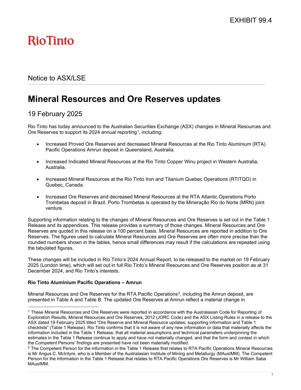 1 Notice to ASX/LSE Mineral Resources and Ore Reserves updates 19 February 2025 Rio Tinto has today announced to the Australian Securities Exchange (ASX) changes in Mineral Resources and Ore Reserves to support its 2024 annual reporting1, including: • Increased Proved Ore Reserves and decreased Mineral Resources at the Rio Tinto Aluminium (RTA) Pacific Operations Amrun deposit in Queensland, Australia. • Increased Indicated Mineral Resources at the Rio Tinto Copper Winu project in Western Australia, Australia. • Increased Mineral Resources at the Rio Tinto Iron and Titanium Quebec Operations (RTITQO) in Quebec, Canada. • Increased Ore Reserves and decreased Mineral Resources at the RTA Atlantic Operations Porto Trombetas deposit in Brazil. Porto Trombetas is operated by the Mineração Rio do Norte (MRN) joint venture. Supporting information relating to the changes of Mineral Resources and Ore Reserves is set out in the Table 1 Release and its appendices. This release provides a summary of those changes. Mineral Resources and Ore Reserves are quoted in this release on a 100 percent basis. Mineral Resources are reported in addition to Ore Reserves. The figures used to calculate Mineral Resources and Ore Reserves are often more precise than the rounded numbers shown in the tables, hence small differences may result if the calculations are repeated using the tabulated figures. These changes will be included in Rio Tinto’s 2024 Annual Report, to be released to the market on 19 February 2025 (London time), which will set out in full Rio Tinto’s Mineral Resources and Ore Reserves position as at 31 December 2024, and Rio Tinto’s interests. Rio Tinto Aluminium Pacific Operations – Amrun Mineral Resources and Ore Reserves for the RTA Pacific Operations2, including the Amrun deposit, are presented in Table A and Table B. The updated Ore Reserves at Amrun reflect a material change in 1 These Mineral Resources and Ore Reserves were reported in accordance with the Australasian Code for Reporting of Exploration Results, Mineral Resources and Ore Reserves, 2012 (JORC Code) and the ASX Listing Rules in a release to the ASX dated 19 February 2025 titled “Ore Reserve and Mineral Resource updates: supporting information and Table 1 checklists” (Table 1 Release). Rio Tinto confirms that it is not aware of any new information or data that materially affects the information included in the Table 1 Release, that all material assumptions and technical parameters underpinning the estimates in the Table 1 Release continue to apply and have not materially changed, and that the form and context in which the Competent Persons’ findings are presented have not been materially modified. 2 The Competent Person for the information in the Table 1 Release that relates to RTA Pacific Operations Mineral Resources is Mr Angus C. McIntyre, who is a Member of the Australasian Institute of Mining and Metallurgy (MAusIMM). The Competent Person for the information in the Table 1 Release that relates to RTA Pacific Operations Ore Reserves is Mr William Saba MAusIMM. EXHIBIT 99.4
