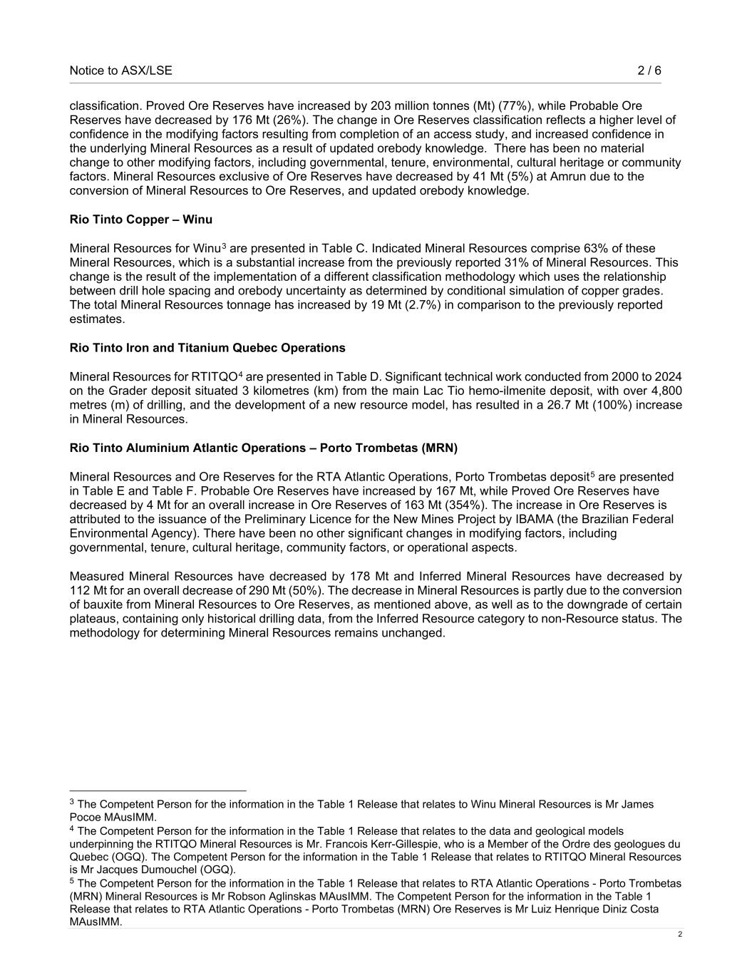 Notice to ASX/LSE 2 / 6 2 classification. Proved Ore Reserves have increased by 203 million tonnes (Mt) (77%), while Probable Ore Reserves have decreased by 176 Mt (26%). The change in Ore Reserves classification reflects a higher level of confidence in the modifying factors resulting from completion of an access study, and increased confidence in the underlying Mineral Resources as a result of updated orebody knowledge. There has been no material change to other modifying factors, including governmental, tenure, environmental, cultural heritage or community factors. Mineral Resources exclusive of Ore Reserves have decreased by 41 Mt (5%) at Amrun due to the conversion of Mineral Resources to Ore Reserves, and updated orebody knowledge. Rio Tinto Copper – Winu Mineral Resources for Winu3 are presented in Table C. Indicated Mineral Resources comprise 63% of these Mineral Resources, which is a substantial increase from the previously reported 31% of Mineral Resources. This change is the result of the implementation of a different classification methodology which uses the relationship between drill hole spacing and orebody uncertainty as determined by conditional simulation of copper grades. The total Mineral Resources tonnage has increased by 19 Mt (2.7%) in comparison to the previously reported estimates. Rio Tinto Iron and Titanium Quebec Operations Mineral Resources for RTITQO4 are presented in Table D. Significant technical work conducted from 2000 to 2024 on the Grader deposit situated 3 kilometres (km) from the main Lac Tio hemo-ilmenite deposit, with over 4,800 metres (m) of drilling, and the development of a new resource model, has resulted in a 26.7 Mt (100%) increase in Mineral Resources. Rio Tinto Aluminium Atlantic Operations – Porto Trombetas (MRN) Mineral Resources and Ore Reserves for the RTA Atlantic Operations, Porto Trombetas deposit5 are presented in Table E and Table F. Probable Ore Reserves have increased by 167 Mt, while Proved Ore Reserves have decreased by 4 Mt for an overall increase in Ore Reserves of 163 Mt (354%). The increase in Ore Reserves is attributed to the issuance of the Preliminary Licence for the New Mines Project by IBAMA (the Brazilian Federal Environmental Agency). There have been no other significant changes in modifying factors, including governmental, tenure, cultural heritage, community factors, or operational aspects. Measured Mineral Resources have decreased by 178 Mt and Inferred Mineral Resources have decreased by 112 Mt for an overall decrease of 290 Mt (50%). The decrease in Mineral Resources is partly due to the conversion of bauxite from Mineral Resources to Ore Reserves, as mentioned above, as well as to the downgrade of certain plateaus, containing only historical drilling data, from the Inferred Resource category to non-Resource status. The methodology for determining Mineral Resources remains unchanged. 3 The Competent Person for the information in the Table 1 Release that relates to Winu Mineral Resources is Mr James Pocoe MAusIMM. 4 The Competent Person for the information in the Table 1 Release that relates to the data and geological models underpinning the RTITQO Mineral Resources is Mr. Francois Kerr-Gillespie, who is a Member of the Ordre des geologues du Quebec (OGQ). The Competent Person for the information in the Table 1 Release that relates to RTITQO Mineral Resources is Mr Jacques Dumouchel (OGQ). 5 The Competent Person for the information in the Table 1 Release that relates to RTA Atlantic Operations - Porto Trombetas (MRN) Mineral Resources is Mr Robson Aglinskas MAusIMM. The Competent Person for the information in the Table 1 Release that relates to RTA Atlantic Operations - Porto Trombetas (MRN) Ore Reserves is Mr Luiz Henrique Diniz Costa MAusIMM.