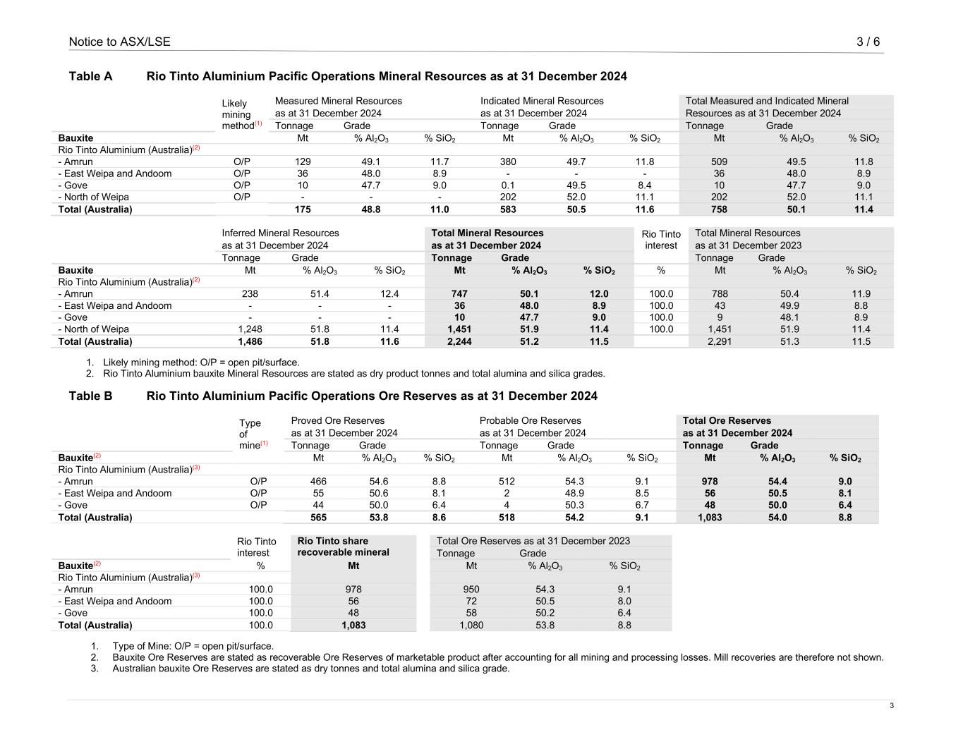 Notice to ASX/LSE 3 / 6 3 Table A Rio Tinto Aluminium Pacific Operations Mineral Resources as at 31 December 2024 Likely mining method(1) Measured Mineral Resources Indicated Mineral Resources Total Measured and Indicated Mineral as at 31 December 2024 as at 31 December 2024 Resources as at 31 December 2024 Tonnage Grade Tonnage Grade Tonnage Grade Bauxite Mt % Al2O3 % SiO2 Mt % Al2O3 % SiO2 Mt % Al2O3 % SiO2 Rio Tinto Aluminium (Australia)(2) - Amrun O/P 129 49.1 11.7 380 49.7 11.8 509 49.5 11.8 - East Weipa and Andoom O/P 36 48.0 8.9 - - - 36 48.0 8.9 - Gove O/P 10 47.7 9.0 0.1 49.5 8.4 10 47.7 9.0 - North of Weipa O/P - - - 202 52.0 11.1 202 52.0 11.1 Total (Australia) 175 48.8 11.0 583 50.5 11.6 758 50.1 11.4 Inferred Mineral Resources Total Mineral Resources Rio Tinto interest Total Mineral Resources as at 31 December 2024 as at 31 December 2024 as at 31 December 2023 Tonnage Grade Tonnage Grade Tonnage Grade Bauxite Mt % Al2O3 % SiO2 Mt % Al2O3 % SiO2 % Mt % Al2O3 % SiO2 Rio Tinto Aluminium (Australia)(2) - Amrun 238 51.4 12.4 747 50.1 12.0 100.0 788 50.4 11.9 - East Weipa and Andoom - - - 36 48.0 8.9 100.0 43 49.9 8.8 - Gove - - - 10 47.7 9.0 100.0 9 48.1 8.9 - North of Weipa 1,248 51.8 11.4 1,451 51.9 11.4 100.0 1,451 51.9 11.4 Total (Australia) 1,486 51.8 11.6 2,244 51.2 11.5 2,291 51.3 11.5 1. Likely mining method: O/P = open pit/surface. 2. Rio Tinto Aluminium bauxite Mineral Resources are stated as dry product tonnes and total alumina and silica grades. Table B Rio Tinto Aluminium Pacific Operations Ore Reserves as at 31 December 2024 Type of mine(1) Proved Ore Reserves Probable Ore Reserves Total Ore Reserves as at 31 December 2024 as at 31 December 2024 as at 31 December 2024 Tonnage Grade Tonnage Grade Tonnage Grade Bauxite(2) Mt % Al2O3 % SiO2 Mt % Al2O3 % SiO2 Mt % Al2O3 % SiO2 Rio Tinto Aluminium (Australia)(3) - Amrun O/P 466 54.6 8.8 512 54.3 9.1 978 54.4 9.0 - East Weipa and Andoom O/P 55 50.6 8.1 2 48.9 8.5 56 50.5 8.1 - Gove O/P 44 50.0 6.4 4 50.3 6.7 48 50.0 6.4 Total (Australia) 565 53.8 8.6 518 54.2 9.1 1,083 54.0 8.8 Rio Tinto interest Rio Tinto share recoverable mineral Total Ore Reserves as at 31 December 2023 Tonnage Grade Bauxite(2) % Mt Mt % Al2O3 % SiO2 Rio Tinto Aluminium (Australia)(3) - Amrun 100.0 978 950 54.3 9.1 - East Weipa and Andoom 100.0 56 72 50.5 8.0 - Gove 100.0 48 58 50.2 6.4 Total (Australia) 100.0 1,083 1,080 53.8 8.8 1. Type of Mine: O/P = open pit/surface. 2. Bauxite Ore Reserves are stated as recoverable Ore Reserves of marketable product after accounting for all mining and processing losses. Mill recoveries are therefore not shown. 3. Australian bauxite Ore Reserves are stated as dry tonnes and total alumina and silica grade.
