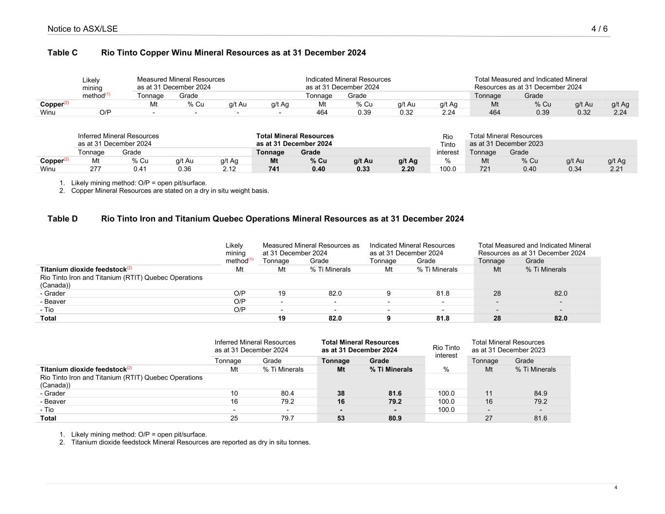 Notice to ASX/LSE 4 / 6 4 Table C Rio Tinto Copper Winu Mineral Resources as at 31 December 2024 Likely mining method(1) Measured Mineral Resources Indicated Mineral Resources Total Measured and Indicated Mineral as at 31 December 2024 as at 31 December 2024 Resources as at 31 December 2024 Tonnage Grade Tonnage Grade Tonnage Grade Copper(2) Mt % Cu g/t Au g/t Ag Mt % Cu g/t Au g/t Ag Mt % Cu g/t Au g/t Ag Winu O/P - - - - 464 0.39 0.32 2.24 464 0.39 0.32 2.24 Inferred Mineral Resources Total Mineral Resources Rio Tinto interest Total Mineral Resources as at 31 December 2024 as at 31 December 2024 as at 31 December 2023 Tonnage Grade Tonnage Grade Tonnage Grade Copper(2) Mt % Cu g/t Au g/t Ag Mt % Cu g/t Au g/t Ag % Mt % Cu g/t Au g/t Ag Winu 277 0.41 0.36 2.12 741 0.40 0.33 2.20 100.0 721 0.40 0.34 2.21 1. Likely mining method: O/P = open pit/surface. 2. Copper Mineral Resources are stated on a dry in situ weight basis. Table D Rio Tinto Iron and Titanium Quebec Operations Mineral Resources as at 31 December 2024 Likely mining method(1) Measured Mineral Resources as at 31 December 2024 Indicated Mineral Resources as at 31 December 2024 Total Measured and Indicated Mineral Resources as at 31 December 2024 Tonnage Grade Tonnage Grade Tonnage Grade Titanium dioxide feedstock(2) Mt Mt % Ti Minerals Mt % Ti Minerals Mt % Ti Minerals Rio Tinto Iron and Titanium (RTIT) Quebec Operations (Canada)) - Grader O/P 19 82.0 9 81.8 28 82.0 - Beaver O/P - - - - - - - Tio O/P - - - - - - Total 19 82.0 9 81.8 28 82.0 Inferred Mineral Resources as at 31 December 2024 Total Mineral Resources as at 31 December 2024 Rio Tinto interest Total Mineral Resources as at 31 December 2023 Tonnage Grade Tonnage Grade Tonnage Grade Titanium dioxide feedstock(2) Mt % Ti Minerals Mt % Ti Minerals % Mt % Ti Minerals Rio Tinto Iron and Titanium (RTIT) Quebec Operations (Canada)) - Grader 10 80.4 38 81.6 100.0 11 84.9 - Beaver 16 79.2 16 79.2 100.0 16 79.2 - Tio - - - - 100.0 - - Total 25 79.7 53 80.9 27 81.6 1. Likely mining method: O/P = open pit/surface. 2. Titanium dioxide feedstock Mineral Resources are reported as dry in situ tonnes.