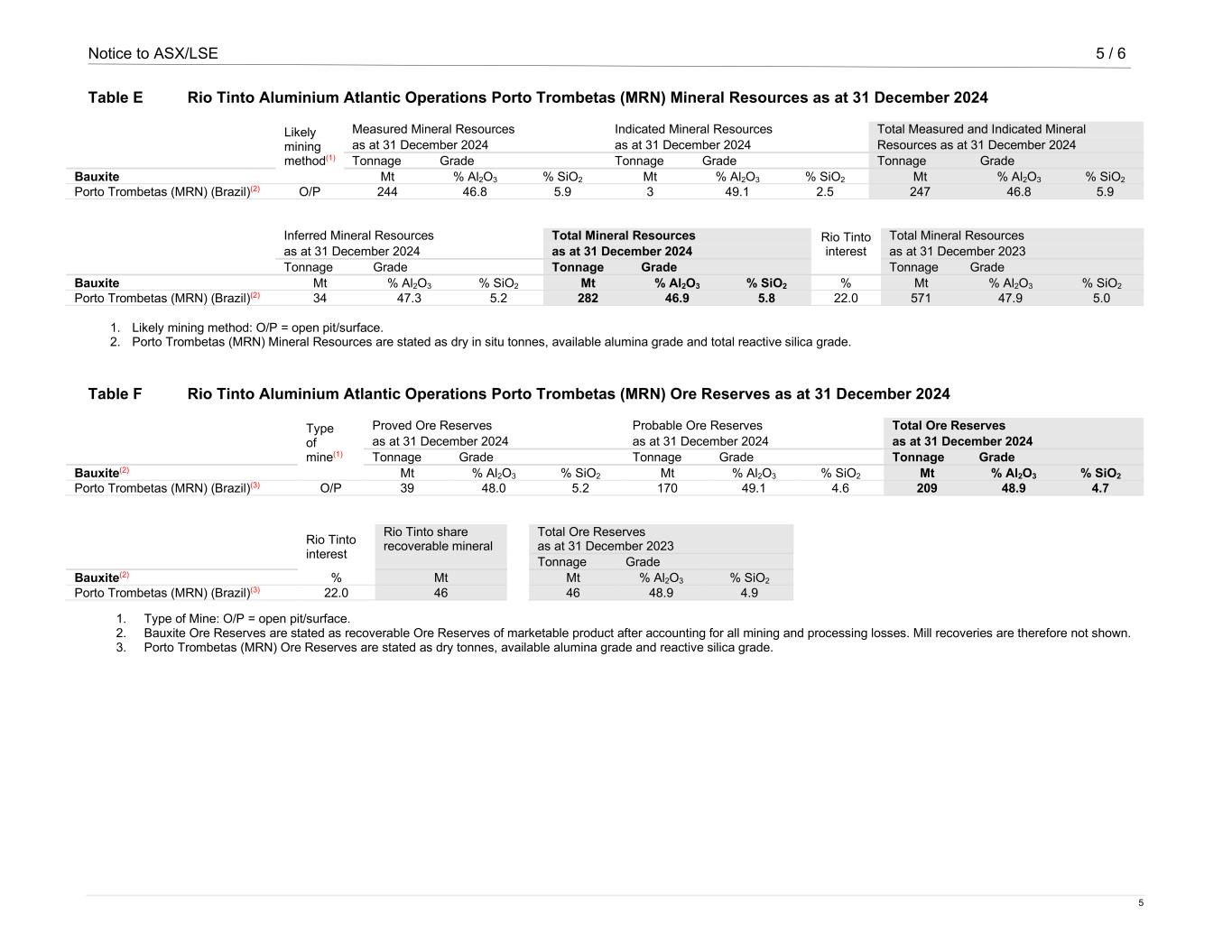 Notice to ASX/LSE 5 / 6 5 Table E Rio Tinto Aluminium Atlantic Operations Porto Trombetas (MRN) Mineral Resources as at 31 December 2024 Likely mining method(1) Measured Mineral Resources Indicated Mineral Resources Total Measured and Indicated Mineral as at 31 December 2024 as at 31 December 2024 Resources as at 31 December 2024 Tonnage Grade Tonnage Grade Tonnage Grade Bauxite Mt % Al2O3 % SiO2 Mt % Al2O3 % SiO2 Mt % Al2O3 % SiO2 Porto Trombetas (MRN) (Brazil)(2) O/P 244 46.8 5.9 3 49.1 2.5 247 46.8 5.9 Inferred Mineral Resources Total Mineral Resources Rio Tinto interest Total Mineral Resources as at 31 December 2024 as at 31 December 2024 as at 31 December 2023 Tonnage Grade Tonnage Grade Tonnage Grade Bauxite Mt % Al2O3 % SiO2 Mt % Al2O3 % SiO2 % Mt % Al2O3 % SiO2 Porto Trombetas (MRN) (Brazil)(2) 34 47.3 5.2 282 46.9 5.8 22.0 571 47.9 5.0 1. Likely mining method: O/P = open pit/surface. 2. Porto Trombetas (MRN) Mineral Resources are stated as dry in situ tonnes, available alumina grade and total reactive silica grade. Table F Rio Tinto Aluminium Atlantic Operations Porto Trombetas (MRN) Ore Reserves as at 31 December 2024 Type of mine(1) Proved Ore Reserves Probable Ore Reserves Total Ore Reserves as at 31 December 2024 as at 31 December 2024 as at 31 December 2024 Tonnage Grade Tonnage Grade Tonnage Grade Bauxite(2) Mt % Al2O3 % SiO2 Mt % Al2O3 % SiO2 Mt % Al2O3 % SiO2 Porto Trombetas (MRN) (Brazil)(3) O/P 39 48.0 5.2 170 49.1 4.6 209 48.9 4.7 Rio Tinto interest Rio Tinto share recoverable mineral Total Ore Reserves as at 31 December 2023 Tonnage Grade Bauxite(2) % Mt Mt % Al2O3 % SiO2 Porto Trombetas (MRN) (Brazil)(3) 22.0 46 46 48.9 4.9 1. Type of Mine: O/P = open pit/surface. 2. Bauxite Ore Reserves are stated as recoverable Ore Reserves of marketable product after accounting for all mining and processing losses. Mill recoveries are therefore not shown. 3. Porto Trombetas (MRN) Ore Reserves are stated as dry tonnes, available alumina grade and reactive silica grade.