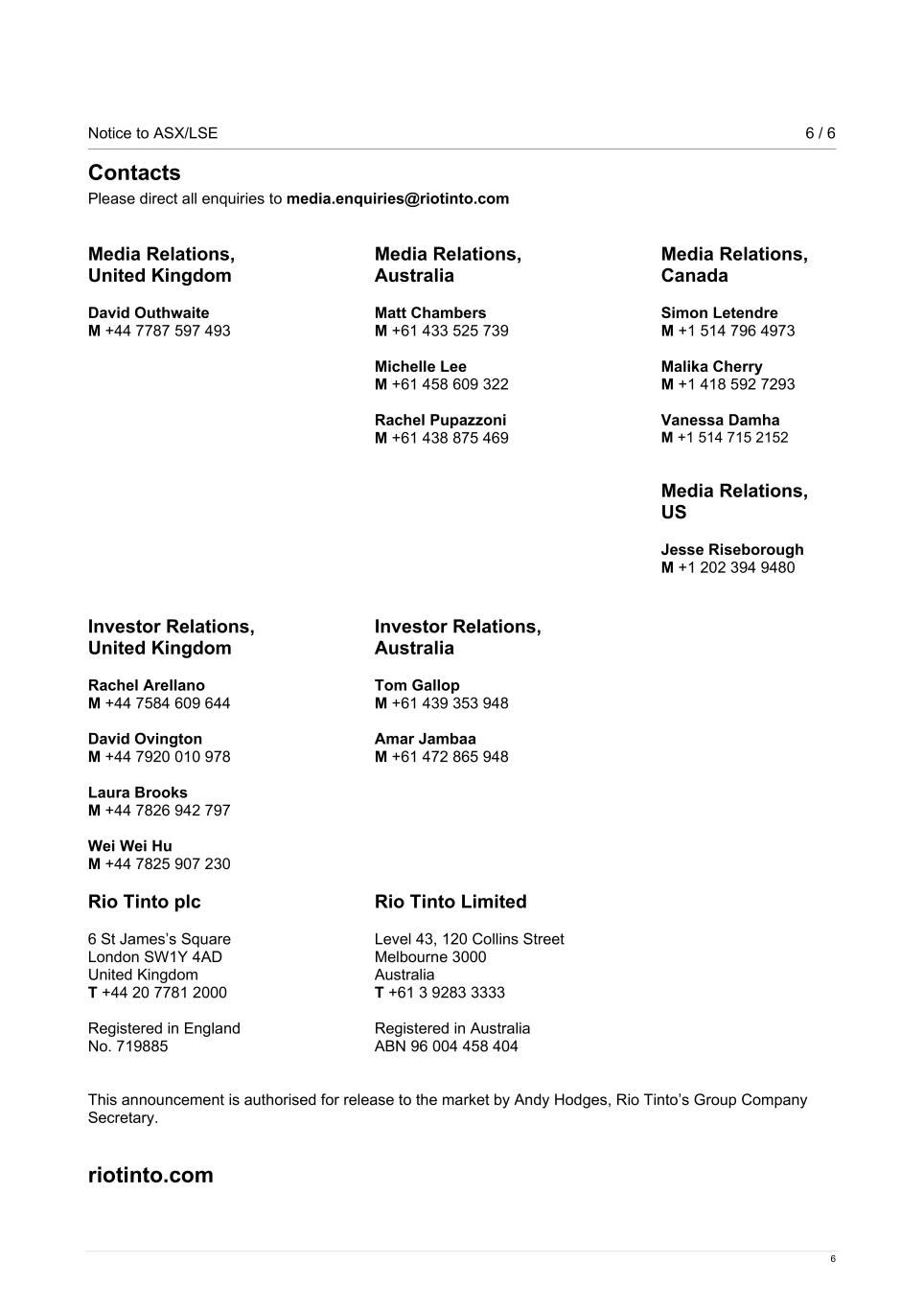 Notice to ASX/LSE 6 / 6 6 Contacts Please direct all enquiries to media.enquiries@riotinto.com Media Relations, United Kingdom David Outhwaite M +44 7787 597 493 Media Relations, Australia Matt Chambers M +61 433 525 739 Michelle Lee M +61 458 609 322 Rachel Pupazzoni M +61 438 875 469 Media Relations, Canada Simon Letendre M +1 514 796 4973 Malika Cherry M +1 418 592 7293 Vanessa Damha M +1 514 715 2152 Media Relations, US Jesse Riseborough M +1 202 394 9480 Investor Relations, United Kingdom Rachel Arellano M +44 7584 609 644 David Ovington M +44 7920 010 978 Laura Brooks M +44 7826 942 797 Wei Wei Hu M +44 7825 907 230 Investor Relations, Australia Tom Gallop M +61 439 353 948 Amar Jambaa M +61 472 865 948 Rio Tinto plc 6 St James’s Square London SW1Y 4AD United Kingdom T +44 20 7781 2000 Registered in England No. 719885 Rio Tinto Limited Level 43, 120 Collins Street Melbourne 3000 Australia T +61 3 9283 3333 Registered in Australia ABN 96 004 458 404 This announcement is authorised for release to the market by Andy Hodges, Rio Tinto’s Group Company Secretary. riotinto.com