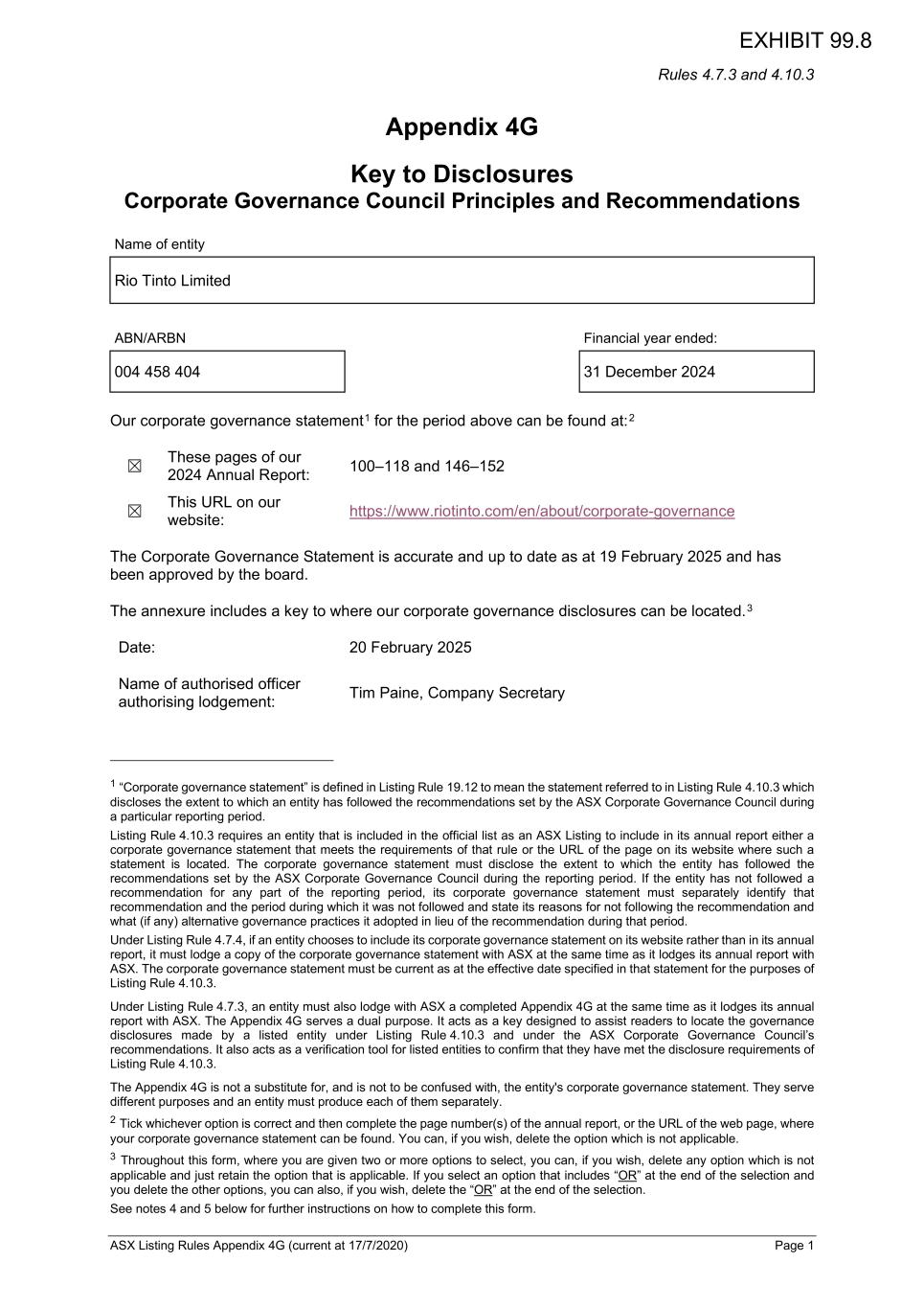 Rules 4.7.3 and 4.10.3 ASX Listing Rules Appendix 4G (current at 17/7/2020) Page 1 Appendix 4G Key to Disclosures Corporate Governance Council Principles and Recommendations Name of entity Rio Tinto Limited ABN/ARBN Financial year ended: 004 458 404 31 December 2024 Our corporate governance statement1 for the period above can be found at:2 ☒ These pages of our 2024 Annual Report: 100–118 and 146–152 ☒ This URL on our website: https://www.riotinto.com/en/about/corporate-governance The Corporate Governance Statement is accurate and up to date as at 19 February 2025 and has been approved by the board. The annexure includes a key to where our corporate governance disclosures can be located.3 Date: 20 February 2025 Name of authorised officer authorising lodgement: Tim Paine, Company Secretary 1 “Corporate governance statement” is defined in Listing Rule 19.12 to mean the statement referred to in Listing Rule 4.10.3 which discloses the extent to which an entity has followed the recommendations set by the ASX Corporate Governance Council during a particular reporting period. Listing Rule 4.10.3 requires an entity that is included in the official list as an ASX Listing to include in its annual report either a corporate governance statement that meets the requirements of that rule or the URL of the page on its website where such a statement is located. The corporate governance statement must disclose the extent to which the entity has followed the recommendations set by the ASX Corporate Governance Council during the reporting period. If the entity has not followed a recommendation for any part of the reporting period, its corporate governance statement must separately identify that recommendation and the period during which it was not followed and state its reasons for not following the recommendation and what (if any) alternative governance practices it adopted in lieu of the recommendation during that period. Under Listing Rule 4.7.4, if an entity chooses to include its corporate governance statement on its website rather than in its annual report, it must lodge a copy of the corporate governance statement with ASX at the same time as it lodges its annual report with ASX. The corporate governance statement must be current as at the effective date specified in that statement for the purposes of Listing Rule 4.10.3. Under Listing Rule 4.7.3, an entity must also lodge with ASX a completed Appendix 4G at the same time as it lodges its annual report with ASX. The Appendix 4G serves a dual purpose. It acts as a key designed to assist readers to locate the governance disclosures made by a listed entity under Listing Rule 4.10.3 and under the ASX Corporate Governance Council’s recommendations. It also acts as a verification tool for listed entities to confirm that they have met the disclosure requirements of Listing Rule 4.10.3. The Appendix 4G is not a substitute for, and is not to be confused with, the entity's corporate governance statement. They serve different purposes and an entity must produce each of them separately. 2 Tick whichever option is correct and then complete the page number(s) of the annual report, or the URL of the web page, where your corporate governance statement can be found. You can, if you wish, delete the option which is not applicable. 3 Throughout this form, where you are given two or more options to select, you can, if you wish, delete any option which is not applicable and just retain the option that is applicable. If you select an option that includes “OR” at the end of the selection and you delete the other options, you can also, if you wish, delete the “OR” at the end of the selection. See notes 4 and 5 below for further instructions on how to complete this form. EXHIBIT 99.8