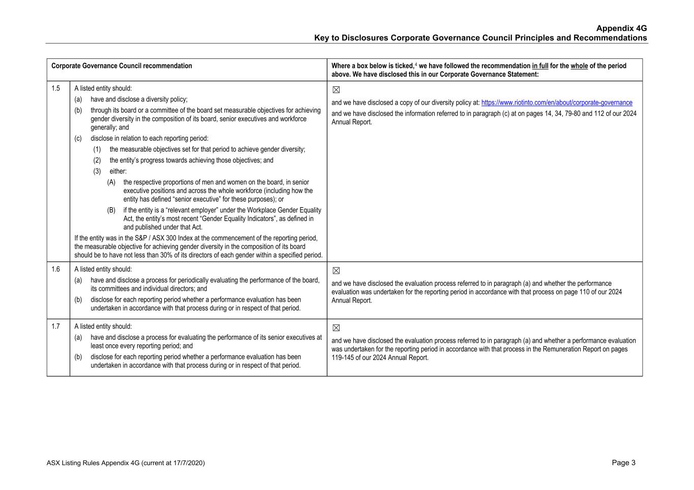 Appendix 4G Key to Disclosures Corporate Governance Council Principles and Recommendations ASX Listing Rules Appendix 4G (current at 17/7/2020) Page 3 Corporate Governance Council recommendation Where a box below is ticked,4 we have followed the recommendation in full for the whole of the period above. We have disclosed this in our Corporate Governance Statement: 1.5 A listed entity should: (a) have and disclose a diversity policy; (b) through its board or a committee of the board set measurable objectives for achieving gender diversity in the composition of its board, senior executives and workforce generally; and (c) disclose in relation to each reporting period: (1) the measurable objectives set for that period to achieve gender diversity; (2) the entity’s progress towards achieving those objectives; and (3) either: (A) the respective proportions of men and women on the board, in senior executive positions and across the whole workforce (including how the entity has defined “senior executive” for these purposes); or (B) if the entity is a “relevant employer” under the Workplace Gender Equality Act, the entity’s most recent “Gender Equality Indicators”, as defined in and published under that Act. If the entity was in the S&P / ASX 300 Index at the commencement of the reporting period, the measurable objective for achieving gender diversity in the composition of its board should be to have not less than 30% of its directors of each gender within a specified period. ☒ and we have disclosed a copy of our diversity policy at: https://www.riotinto.com/en/about/corporate-governance and we have disclosed the information referred to in paragraph (c) at on pages 14, 34, 79-80 and 112 of our 2024 Annual Report. 1.6 A listed entity should: (a) have and disclose a process for periodically evaluating the performance of the board, its committees and individual directors; and (b) disclose for each reporting period whether a performance evaluation has been undertaken in accordance with that process during or in respect of that period. ☒ and we have disclosed the evaluation process referred to in paragraph (a) and whether the performance evaluation was undertaken for the reporting period in accordance with that process on page 110 of our 2024 Annual Report. 1.7 A listed entity should: (a) have and disclose a process for evaluating the performance of its senior executives at least once every reporting period; and (b) disclose for each reporting period whether a performance evaluation has been undertaken in accordance with that process during or in respect of that period. ☒ and we have disclosed the evaluation process referred to in paragraph (a) and whether a performance evaluation was undertaken for the reporting period in accordance with that process in the Remuneration Report on pages 119-145 of our 2024 Annual Report.