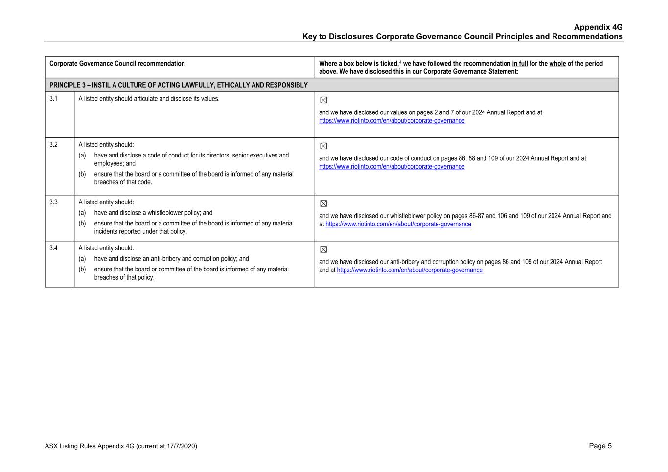 Appendix 4G Key to Disclosures Corporate Governance Council Principles and Recommendations ASX Listing Rules Appendix 4G (current at 17/7/2020) Page 5 Corporate Governance Council recommendation Where a box below is ticked,4 we have followed the recommendation in full for the whole of the period above. We have disclosed this in our Corporate Governance Statement: PRINCIPLE 3 – INSTIL A CULTURE OF ACTING LAWFULLY, ETHICALLY AND RESPONSIBLY 3.1 A listed entity should articulate and disclose its values. ☒ and we have disclosed our values on pages 2 and 7 of our 2024 Annual Report and at https://www.riotinto.com/en/about/corporate-governance 3.2 A listed entity should: (a) have and disclose a code of conduct for its directors, senior executives and employees; and (b) ensure that the board or a committee of the board is informed of any material breaches of that code. ☒ and we have disclosed our code of conduct on pages 86, 88 and 109 of our 2024 Annual Report and at: https://www.riotinto.com/en/about/corporate-governance 3.3 A listed entity should: (a) have and disclose a whistleblower policy; and (b) ensure that the board or a committee of the board is informed of any material incidents reported under that policy. ☒ and we have disclosed our whistleblower policy on pages 86-87 and 106 and 109 of our 2024 Annual Report and at https://www.riotinto.com/en/about/corporate-governance 3.4 A listed entity should: (a) have and disclose an anti-bribery and corruption policy; and (b) ensure that the board or committee of the board is informed of any material breaches of that policy. ☒ and we have disclosed our anti-bribery and corruption policy on pages 86 and 109 of our 2024 Annual Report and at https://www.riotinto.com/en/about/corporate-governance