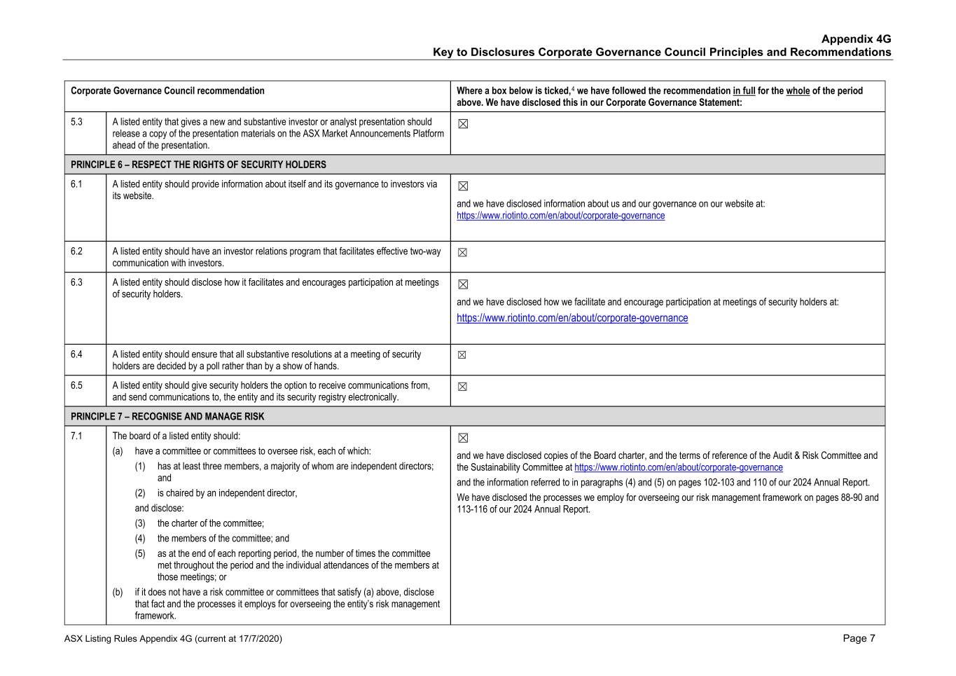 Appendix 4G Key to Disclosures Corporate Governance Council Principles and Recommendations ASX Listing Rules Appendix 4G (current at 17/7/2020) Page 7 Corporate Governance Council recommendation Where a box below is ticked,4 we have followed the recommendation in full for the whole of the period above. We have disclosed this in our Corporate Governance Statement: 5.3 A listed entity that gives a new and substantive investor or analyst presentation should release a copy of the presentation materials on the ASX Market Announcements Platform ahead of the presentation. ☒ PRINCIPLE 6 – RESPECT THE RIGHTS OF SECURITY HOLDERS 6.1 A listed entity should provide information about itself and its governance to investors via its website. ☒ and we have disclosed information about us and our governance on our website at: https://www.riotinto.com/en/about/corporate-governance 6.2 A listed entity should have an investor relations program that facilitates effective two-way communication with investors. ☒ 6.3 A listed entity should disclose how it facilitates and encourages participation at meetings of security holders. ☒ and we have disclosed how we facilitate and encourage participation at meetings of security holders at: https://www.riotinto.com/en/about/corporate-governance 6.4 A listed entity should ensure that all substantive resolutions at a meeting of security holders are decided by a poll rather than by a show of hands. ☒ 6.5 A listed entity should give security holders the option to receive communications from, and send communications to, the entity and its security registry electronically. ☒ PRINCIPLE 7 – RECOGNISE AND MANAGE RISK 7.1 The board of a listed entity should: (a) have a committee or committees to oversee risk, each of which: (1) has at least three members, a majority of whom are independent directors; and (2) is chaired by an independent director, and disclose: (3) the charter of the committee; (4) the members of the committee; and (5) as at the end of each reporting period, the number of times the committee met throughout the period and the individual attendances of the members at those meetings; or (b) if it does not have a risk committee or committees that satisfy (a) above, disclose that fact and the processes it employs for overseeing the entity’s risk management framework. ☒ and we have disclosed copies of the Board charter, and the terms of reference of the Audit & Risk Committee and the Sustainability Committee at https://www.riotinto.com/en/about/corporate-governance and the information referred to in paragraphs (4) and (5) on pages 102-103 and 110 of our 2024 Annual Report. We have disclosed the processes we employ for overseeing our risk management framework on pages 88-90 and 113-116 of our 2024 Annual Report.