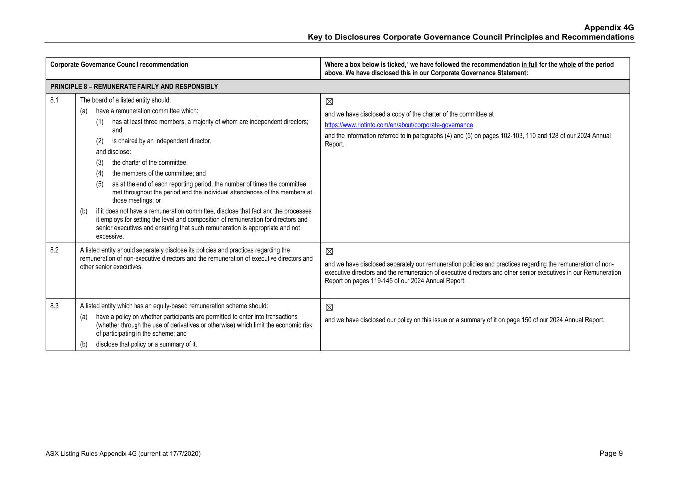 Appendix 4G Key to Disclosures Corporate Governance Council Principles and Recommendations ASX Listing Rules Appendix 4G (current at 17/7/2020) Page 9 Corporate Governance Council recommendation Where a box below is ticked,4 we have followed the recommendation in full for the whole of the period above. We have disclosed this in our Corporate Governance Statement: PRINCIPLE 8 – REMUNERATE FAIRLY AND RESPONSIBLY 8.1 The board of a listed entity should: (a) have a remuneration committee which: (1) has at least three members, a majority of whom are independent directors; and (2) is chaired by an independent director, and disclose: (3) the charter of the committee; (4) the members of the committee; and (5) as at the end of each reporting period, the number of times the committee met throughout the period and the individual attendances of the members at those meetings; or (b) if it does not have a remuneration committee, disclose that fact and the processes it employs for setting the level and composition of remuneration for directors and senior executives and ensuring that such remuneration is appropriate and not excessive. ☒ and we have disclosed a copy of the charter of the committee at https://www.riotinto.com/en/about/corporate-governance and the information referred to in paragraphs (4) and (5) on pages 102-103, 110 and 128 of our 2024 Annual Report. 8.2 A listed entity should separately disclose its policies and practices regarding the remuneration of non-executive directors and the remuneration of executive directors and other senior executives. ☒ and we have disclosed separately our remuneration policies and practices regarding the remuneration of non- executive directors and the remuneration of executive directors and other senior executives in our Remuneration Report on pages 119-145 of our 2024 Annual Report. 8.3 A listed entity which has an equity-based remuneration scheme should: (a) have a policy on whether participants are permitted to enter into transactions (whether through the use of derivatives or otherwise) which limit the economic risk of participating in the scheme; and (b) disclose that policy or a summary of it. ☒ and we have disclosed our policy on this issue or a summary of it on page 150 of our 2024 Annual Report.