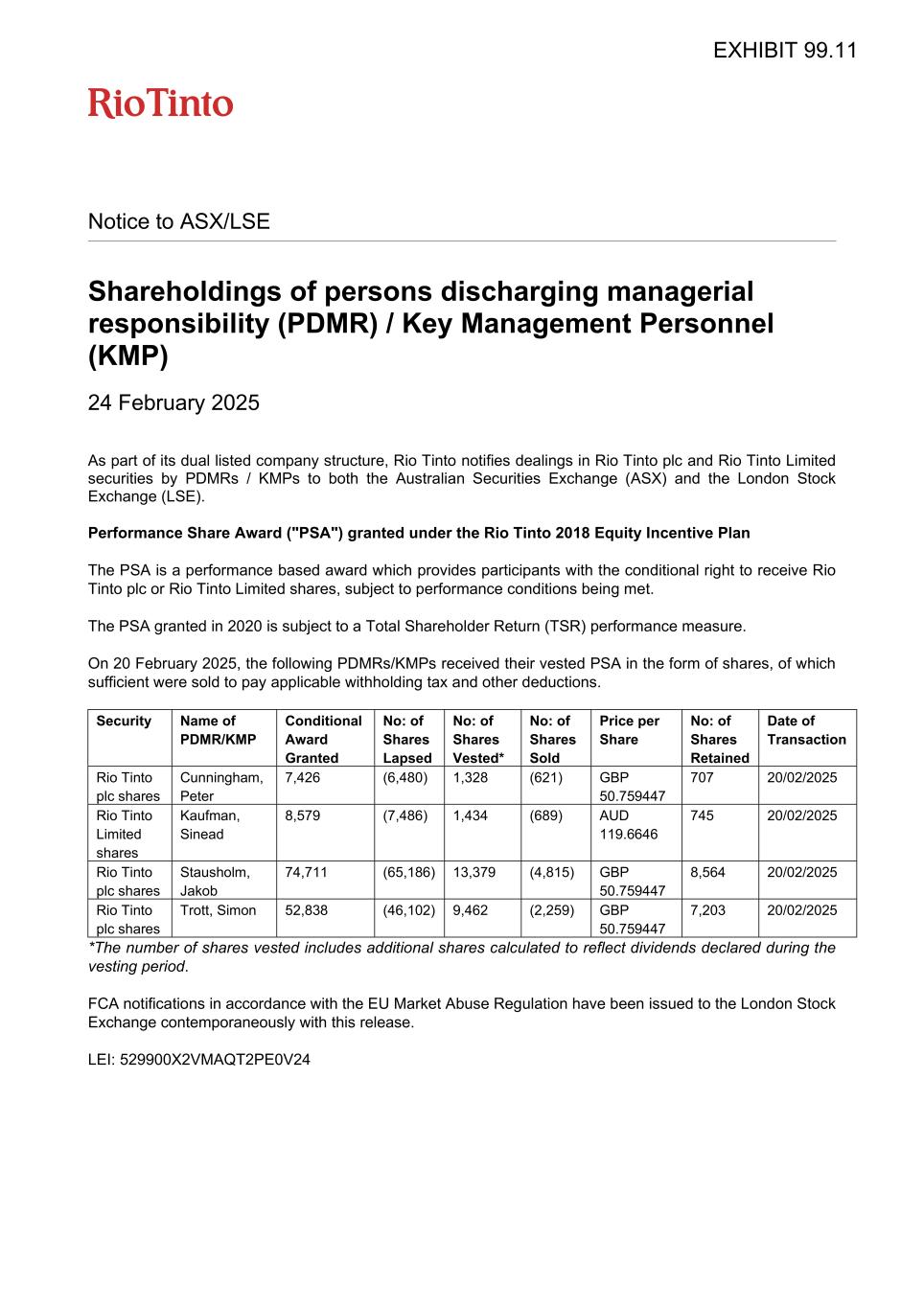 Notice to ASX/LSE Shareholdings of persons discharging managerial responsibility (PDMR) / Key Management Personnel (KMP) 24 February 2025 As part of its dual listed company structure, Rio Tinto notifies dealings in Rio Tinto plc and Rio Tinto Limited securities by PDMRs / KMPs to both the Australian Securities Exchange (ASX) and the London Stock Exchange (LSE). Performance Share Award ("PSA") granted under the Rio Tinto 2018 Equity Incentive Plan The PSA is a performance based award which provides participants with the conditional right to receive Rio Tinto plc or Rio Tinto Limited shares, subject to performance conditions being met. The PSA granted in 2020 is subject to a Total Shareholder Return (TSR) performance measure. On 20 February 2025, the following PDMRs/KMPs received their vested PSA in the form of shares, of which sufficient were sold to pay applicable withholding tax and other deductions. Security Name of PDMR/KMP Conditional Award Granted No: of Shares Lapsed No: of Shares Vested* No: of Shares Sold Price per Share No: of Shares Retained Date of Transaction Rio Tinto plc shares Cunningham, Peter 7,426 (6,480) 1,328 (621) GBP 50.759447 707 20/02/2025 Rio Tinto Limited shares Kaufman, Sinead 8,579 (7,486) 1,434 (689) AUD 119.6646 745 20/02/2025 Rio Tinto plc shares Stausholm, Jakob 74,711 (65,186) 13,379 (4,815) GBP 50.759447 8,564 20/02/2025 Rio Tinto plc shares Trott, Simon 52,838 (46,102) 9,462 (2,259) GBP 50.759447 7,203 20/02/2025 *The number of shares vested includes additional shares calculated to reflect dividends declared during the vesting period. FCA notifications in accordance with the EU Market Abuse Regulation have been issued to the London Stock Exchange contemporaneously with this release. LEI: 529900X2VMAQT2PE0V24 EXHIBIT 99.11