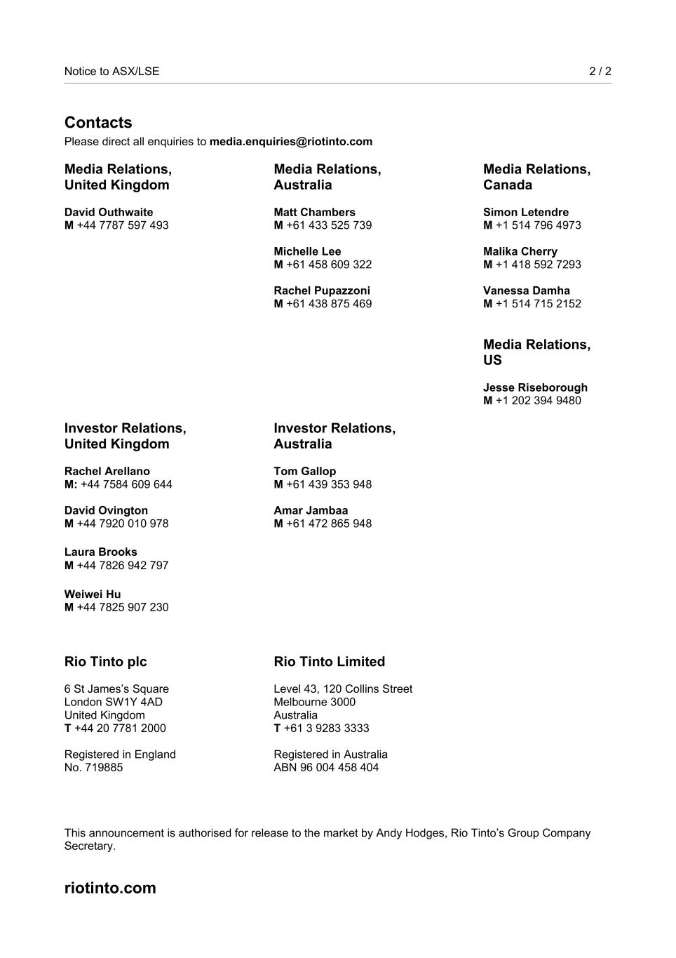 Notice to ASX/LSE 2 / 2 Contacts Please direct all enquiries to media.enquiries@riotinto.com Media Relations, United Kingdom David Outhwaite M +44 7787 597 493 Media Relations, Australia Matt Chambers M +61 433 525 739 Michelle Lee M +61 458 609 322 Rachel Pupazzoni M +61 438 875 469 Media Relations, Canada Simon Letendre M +1 514 796 4973 Malika Cherry M +1 418 592 7293 Vanessa Damha M +1 514 715 2152 Media Relations, US Jesse Riseborough M +1 202 394 9480 Investor Relations, United Kingdom Rachel Arellano M: +44 7584 609 644 David Ovington M +44 7920 010 978 Laura Brooks M +44 7826 942 797 Weiwei Hu M +44 7825 907 230 Investor Relations, Australia Tom Gallop M +61 439 353 948 Amar Jambaa M +61 472 865 948 Rio Tinto plc 6 St James’s Square London SW1Y 4AD United Kingdom T +44 20 7781 2000 Registered in England No. 719885 Rio Tinto Limited Level 43, 120 Collins Street Melbourne 3000 Australia T +61 3 9283 3333 Registered in Australia ABN 96 004 458 404 This announcement is authorised for release to the market by Andy Hodges, Rio Tinto’s Group Company Secretary. riotinto.com