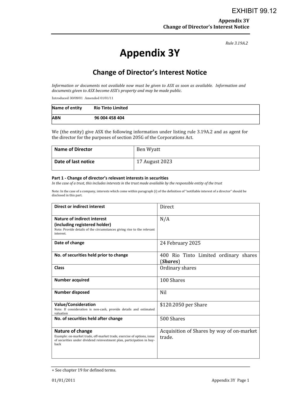 Appendix 3Y Change of Director’s Interest Notice + See chapter 19 for defined terms. 01/01/2011 Appendix 3Y Page 1 Rule 3.19A.2 Appendix 3Y Change of Director’s Interest Notice Information or documents not available now must be given to ASX as soon as available. Information and documents given to ASX become ASX’s property and may be made public. Introduced 30/09/01 Amended 01/01/11 Name of entity Rio Tinto Limited ABN 96 004 458 404 We (the entity) give ASX the following information under listing rule 3.19A.2 and as agent for the director for the purposes of section 205G of the Corporations Act. Name of Director Ben Wyatt Date of last notice 17 August 2023 Part 1 - Change of director’s relevant interests in securities In the case of a trust, this includes interests in the trust made available by the responsible entity of the trust Note: In the case of a company, interests which come within paragraph (i) of the definition of “notifiable interest of a director” should be disclosed in this part. Direct or indirect interest Direct Nature of indirect interest (including registered holder) Note: Provide details of the circumstances giving rise to the relevant interest. N/A Date of change 24 February 2025 No. of securities held prior to change 400 Rio Tinto Limited ordinary shares (Shares) Class Ordinary shares Number acquired 100 Shares Number disposed Nil Value/Consideration Note: If consideration is non-cash, provide details and estimated valuation $120.2050 per Share No. of securities held after change 500 Shares Nature of change Example: on-market trade, off-market trade, exercise of options, issue of securities under dividend reinvestment plan, participation in buy- back Acquisition of Shares by way of on-market trade. EXHIBIT 99.12