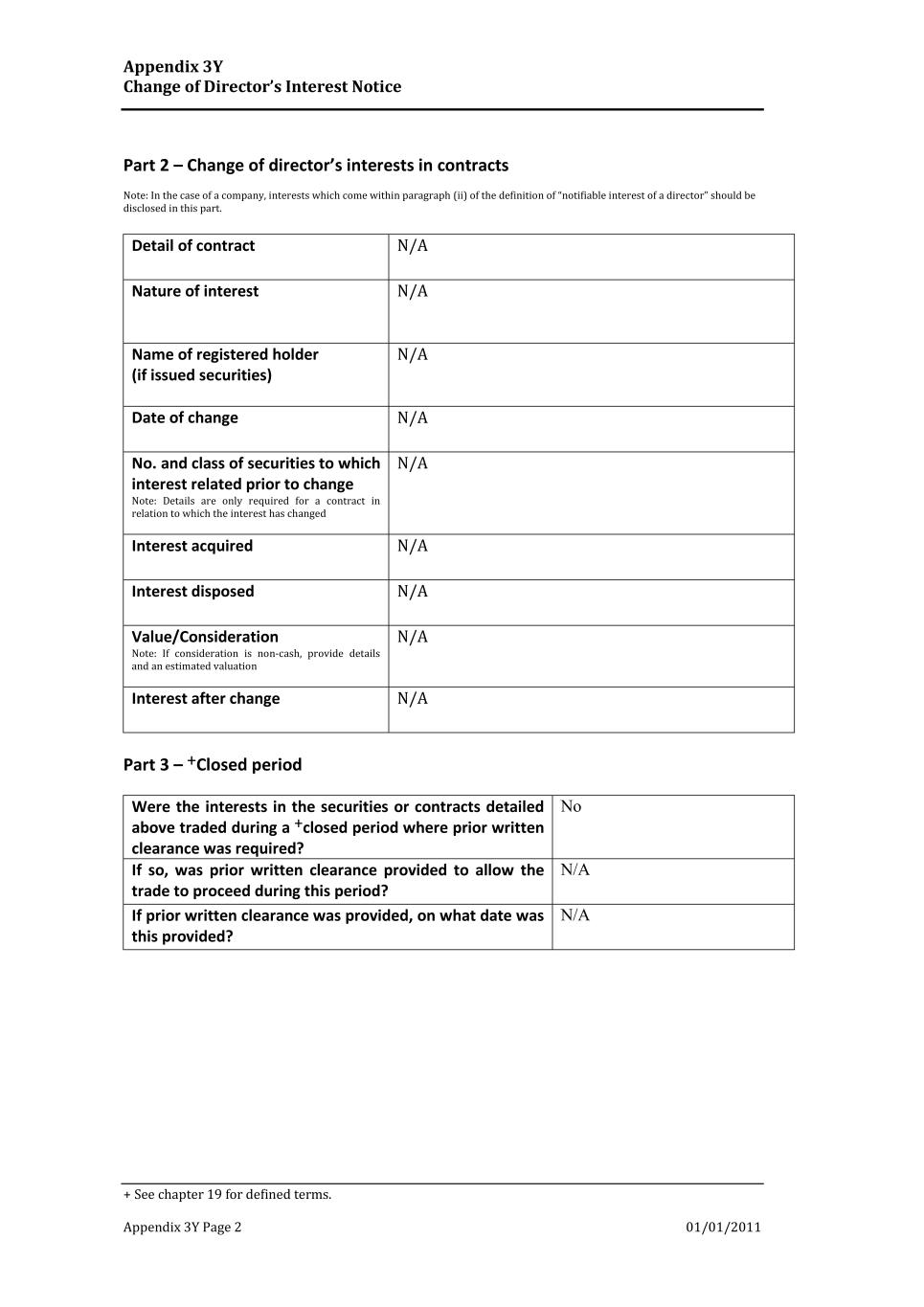 Appendix 3Y Change of Director’s Interest Notice + See chapter 19 for defined terms. Appendix 3Y Page 2 01/01/2011 Part 2 – Change of director’s interests in contracts Note: In the case of a company, interests which come within paragraph (ii) of the definition of “notifiable interest of a director” should be disclosed in this part. Detail of contract N/A Nature of interest N/A Name of registered holder (if issued securities) N/A Date of change N/A No. and class of securities to which interest related prior to change Note: Details are only required for a contract in relation to which the interest has changed N/A Interest acquired N/A Interest disposed N/A Value/Consideration Note: If consideration is non-cash, provide details and an estimated valuation N/A Interest after change N/A Part 3 – +Closed period Were the interests in the securities or contracts detailed above traded during a +closed period where prior written clearance was required? No If so, was prior written clearance provided to allow the trade to proceed during this period? N/A If prior written clearance was provided, on what date was this provided? N/A