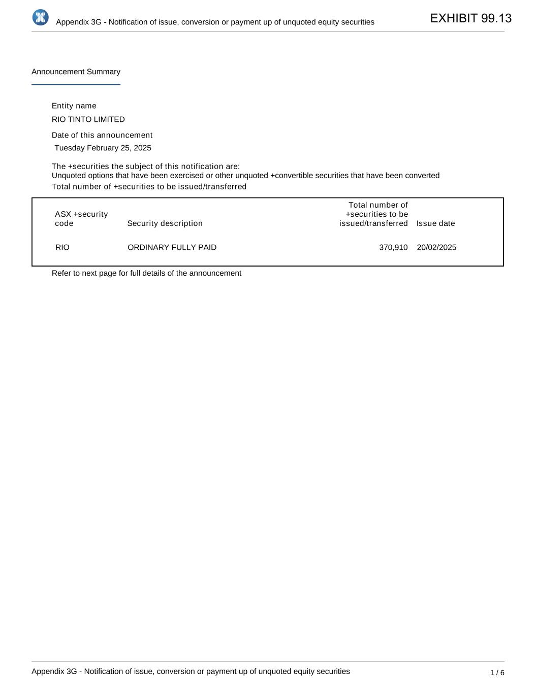 Appendix 3G - Notification of issue, conversion or payment up of unquoted equity securities Appendix 3G - Notification of issue, conversion or payment up of unquoted equity securities 1 / 6 Announcement Summary Entity name RIO TINTO LIMITED Date of this announcement Tuesday February 25, 2025 The +securities the subject of this notification are: Total number of +securities to be issued/transferred ASX +security code Security description Total number of +securities to be issued/transferred Issue date RIO ORDINARY FULLY PAID 370,910 20/02/2025 Refer to next page for full details of the announcement Unquoted options that have been exercised or other unquoted +convertible securities that have been converted EXHIBIT 99.13