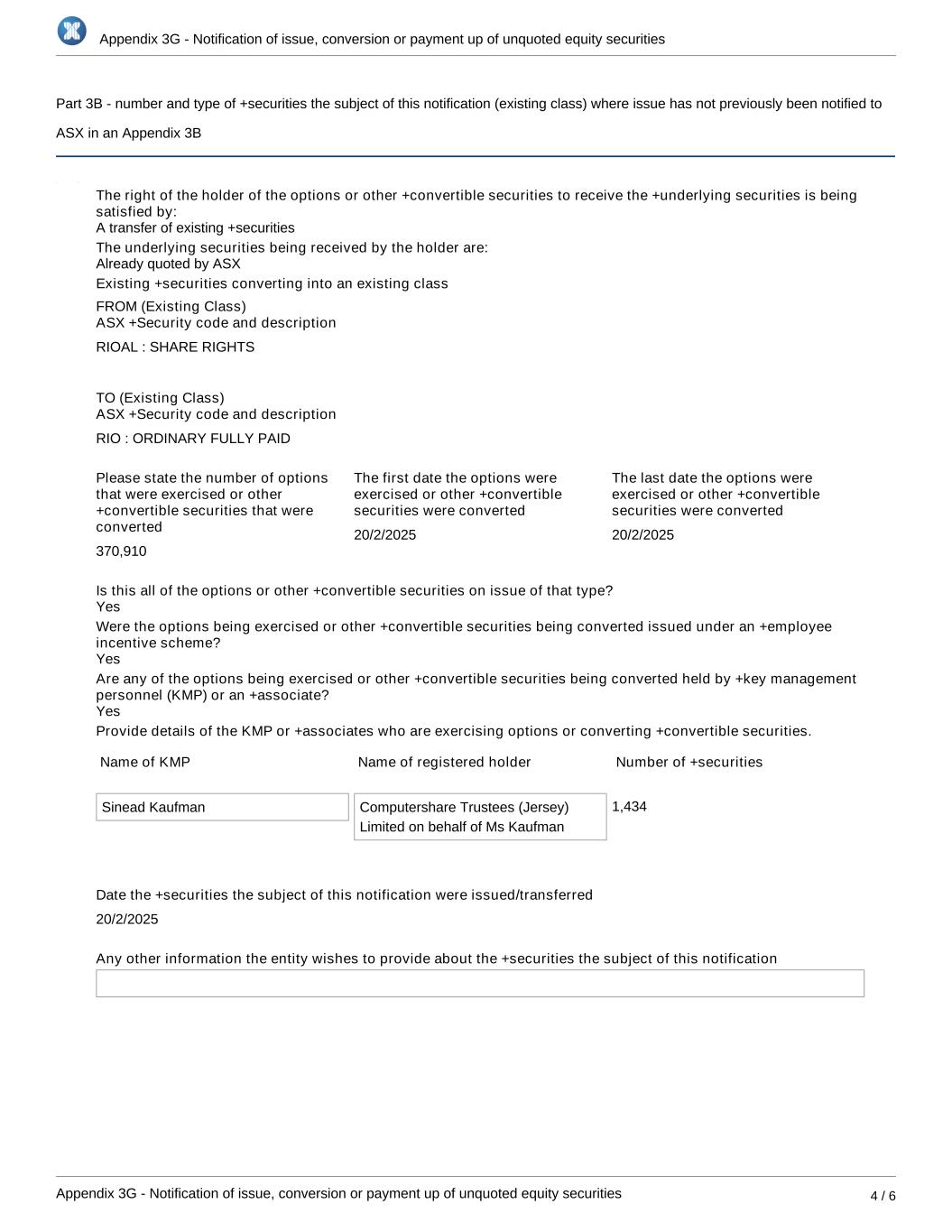 Appendix 3G - Notification of issue, conversion or payment up of unquoted equity securities Appendix 3G - Notification of issue, conversion or payment up of unquoted equity securities 4 / 6 Part 3B - number and type of +securities the subject of this notification (existing class) where issue has not previously been notified to ASX in an Appendix 3B The right of the holder of the options or other +convertible securities to receive the +underlying securities is being satisfied by: The underlying securities being received by the holder are: Existing +securities converting into an existing class FROM (Existing Class) ASX +Security code and description RIOAL : SHARE RIGHTS TO (Existing Class) ASX +Security code and description RIO : ORDINARY FULLY PAID Please state the number of options that were exercised or other +convertible securities that were converted 370,910 The first date the options were exercised or other +convertible securities were converted 20/2/2025 The last date the options were exercised or other +convertible securities were converted 20/2/2025 Is this all of the options or other +convertible securities on issue of that type? Were the options being exercised or other +convertible securities being converted issued under an +employee incentive scheme? Are any of the options being exercised or other +convertible securities being converted held by +key management personnel (KMP) or an +associate? Provide details of the KMP or +associates who are exercising options or converting +convertible securities. Name of KMP Name of registered holder Number of +securities Sinead Kaufman Computershare Trustees (Jersey) Limited on behalf of Ms Kaufman 1,434 Date the +securities the subject of this notification were issued/transferred 20/2/2025 Any other information the entity wishes to provide about the +securities the subject of this notification Yes Yes Yes Already quoted by ASX A transfer of existing +securities