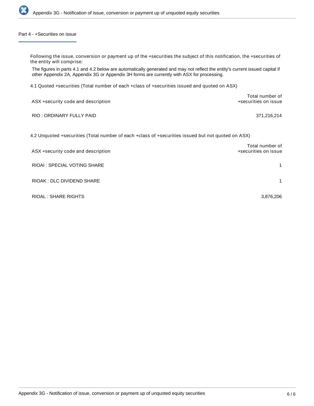Appendix 3G - Notification of issue, conversion or payment up of unquoted equity securities Appendix 3G - Notification of issue, conversion or payment up of unquoted equity securities 6 / 6 Part 4 - +Securities on issue Following the issue, conversion or payment up of the +securities the subject of this notification, the +securities of the entity will comprise: The figures in parts 4.1 and 4.2 below are automatically generated and may not reflect the entity's current issued capital if other Appendix 2A, Appendix 3G or Appendix 3H forms are currently with ASX for processing. 4.1 Quoted +securities (Total number of each +class of +securities issued and quoted on ASX) ASX +security code and description Total number of +securities on issue RIO : ORDINARY FULLY PAID 371,216,214 4.2 Unquoted +securities (Total number of each +class of +securities issued but not quoted on ASX) ASX +security code and description Total number of +securities on issue RIOAI : SPECIAL VOTING SHARE 1 RIOAK : DLC DIVIDEND SHARE 1 RIOAL : SHARE RIGHTS 3,876,206