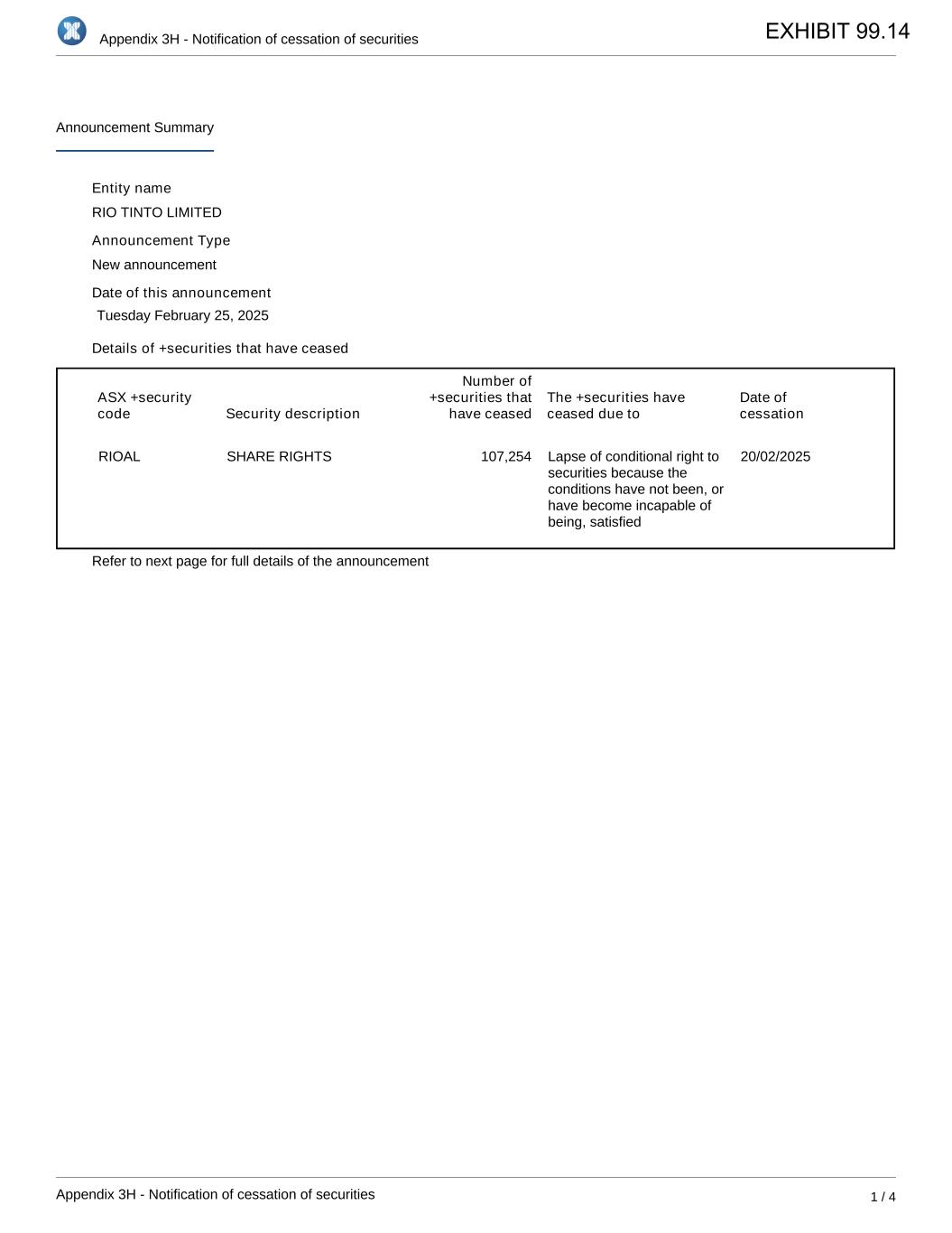Appendix 3H - Notification of cessation of securities Appendix 3H - Notification of cessation of securities 1 / 4 Announcement Summary Entity name RIO TINTO LIMITED Announcement Type New announcement Date of this announcement Tuesday February 25, 2025 Details of +securities that have ceased ASX +security code Security description Number of +securities that have ceased The +securities have ceased due to Date of cessation RIOAL SHARE RIGHTS 107,254 Lapse of conditional right to securities because the conditions have not been, or have become incapable of being, satisfied 20/02/2025 Refer to next page for full details of the announcement EXHIBIT 99.14