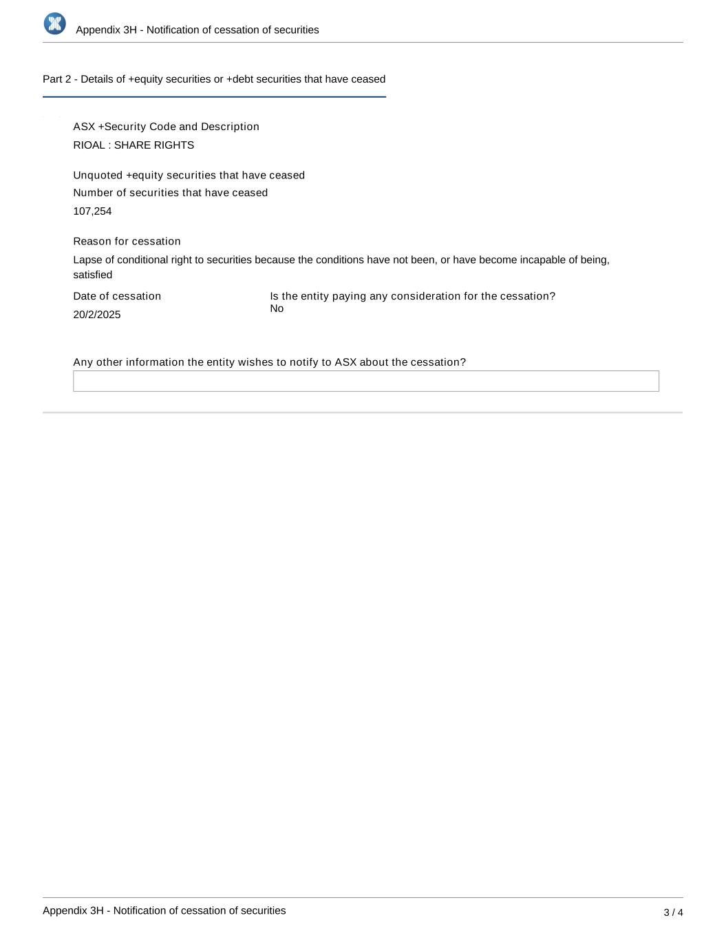 Appendix 3H - Notification of cessation of securities Appendix 3H - Notification of cessation of securities 3 / 4 Part 2 - Details of +equity securities or +debt securities that have ceased ASX +Security Code and Description RIOAL : SHARE RIGHTS Unquoted +equity securities that have ceased Number of securities that have ceased 107,254 Reason for cessation Lapse of conditional right to securities because the conditions have not been, or have become incapable of being, satisfied Date of cessation 20/2/2025 Is the entity paying any consideration for the cessation? Any other information the entity wishes to notify to ASX about the cessation? No