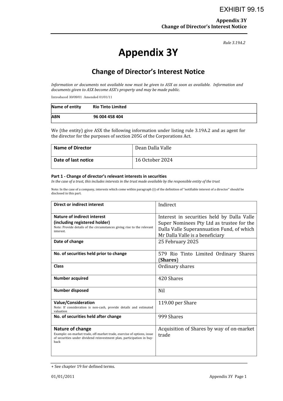 Appendix 3Y Change of Director’s Interest Notice + See chapter 19 for defined terms. 01/01/2011 Appendix 3Y Page 1 Rule 3.19A.2 Appendix 3Y Change of Director’s Interest Notice Information or documents not available now must be given to ASX as soon as available. Information and documents given to ASX become ASX’s property and may be made public. Introduced 30/09/01 Amended 01/01/11 Name of entity Rio Tinto Limited ABN 96 004 458 404 We (the entity) give ASX the following information under listing rule 3.19A.2 and as agent for the director for the purposes of section 205G of the Corporations Act. Name of Director Dean Dalla Valle Date of last notice 16 October 2024 Part 1 - Change of director’s relevant interests in securities In the case of a trust, this includes interests in the trust made available by the responsible entity of the trust Note: In the case of a company, interests which come within paragraph (i) of the definition of “notifiable interest of a director” should be disclosed in this part. Direct or indirect interest Indirect Nature of indirect interest (including registered holder) Note: Provide details of the circumstances giving rise to the relevant interest. Interest in securities held by Dalla Valle Super Nominees Pty Ltd as trustee for the Dalla Valle Superannuation Fund, of which Mr Dalla Valle is a beneficiary Date of change 25 February 2025 No. of securities held prior to change 579 Rio Tinto Limited Ordinary Shares (Shares) Class Ordinary shares Number acquired 420 Shares Number disposed Nil Value/Consideration Note: If consideration is non-cash, provide details and estimated valuation 119.00 per Share No. of securities held after change 999 Shares Nature of change Example: on-market trade, off-market trade, exercise of options, issue of securities under dividend reinvestment plan, participation in buy- back Acquisition of Shares by way of on-market trade EXHIBIT 99.15