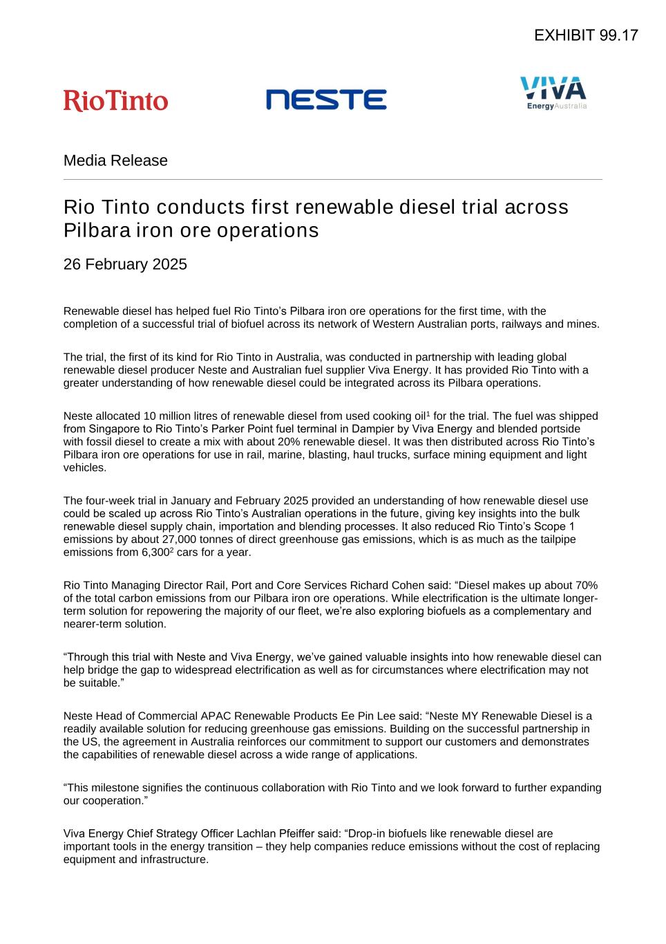 Media Release Rio Tinto conducts first renewable diesel trial across Pilbara iron ore operations 26 February 2025 Renewable diesel has helped fuel Rio Tinto’s Pilbara iron ore operations for the first time, with the completion of a successful trial of biofuel across its network of Western Australian ports, railways and mines. The trial, the first of its kind for Rio Tinto in Australia, was conducted in partnership with leading global renewable diesel producer Neste and Australian fuel supplier Viva Energy. It has provided Rio Tinto with a greater understanding of how renewable diesel could be integrated across its Pilbara operations. Neste allocated 10 million litres of renewable diesel from used cooking oil1 for the trial. The fuel was shipped from Singapore to Rio Tinto’s Parker Point fuel terminal in Dampier by Viva Energy and blended portside with fossil diesel to create a mix with about 20% renewable diesel. It was then distributed across Rio Tinto’s Pilbara iron ore operations for use in rail, marine, blasting, haul trucks, surface mining equipment and light vehicles. The four-week trial in January and February 2025 provided an understanding of how renewable diesel use could be scaled up across Rio Tinto’s Australian operations in the future, giving key insights into the bulk renewable diesel supply chain, importation and blending processes. It also reduced Rio Tinto’s Scope 1 emissions by about 27,000 tonnes of direct greenhouse gas emissions, which is as much as the tailpipe emissions from 6,3002 cars for a year. Rio Tinto Managing Director Rail, Port and Core Services Richard Cohen said: “Diesel makes up about 70% of the total carbon emissions from our Pilbara iron ore operations. While electrification is the ultimate longer- term solution for repowering the majority of our fleet, we’re also exploring biofuels as a complementary and nearer-term solution. “Through this trial with Neste and Viva Energy, we’ve gained valuable insights into how renewable diesel can help bridge the gap to widespread electrification as well as for circumstances where electrification may not be suitable.” Neste Head of Commercial APAC Renewable Products Ee Pin Lee said: “Neste MY Renewable Diesel is a readily available solution for reducing greenhouse gas emissions. Building on the successful partnership in the US, the agreement in Australia reinforces our commitment to support our customers and demonstrates the capabilities of renewable diesel across a wide range of applications. “This milestone signifies the continuous collaboration with Rio Tinto and we look forward to further expanding our cooperation.” Viva Energy Chief Strategy Officer Lachlan Pfeiffer said: “Drop-in biofuels like renewable diesel are important tools in the energy transition – they help companies reduce emissions without the cost of replacing equipment and infrastructure. EXHIBIT 99.17