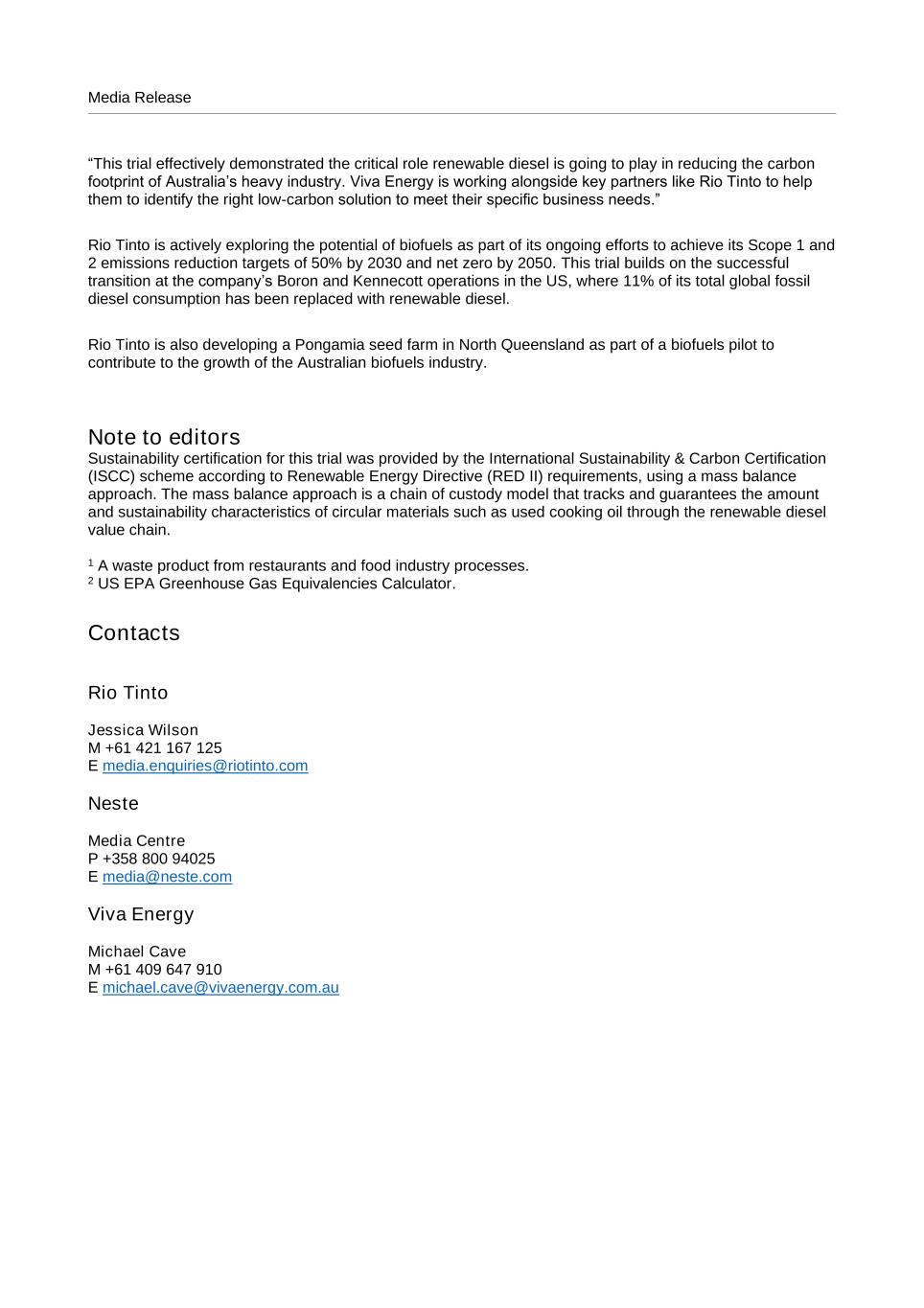 Media Release “This trial effectively demonstrated the critical role renewable diesel is going to play in reducing the carbon footprint of Australia’s heavy industry. Viva Energy is working alongside key partners like Rio Tinto to help them to identify the right low-carbon solution to meet their specific business needs.” Rio Tinto is actively exploring the potential of biofuels as part of its ongoing efforts to achieve its Scope 1 and 2 emissions reduction targets of 50% by 2030 and net zero by 2050. This trial builds on the successful transition at the company’s Boron and Kennecott operations in the US, where 11% of its total global fossil diesel consumption has been replaced with renewable diesel. Rio Tinto is also developing a Pongamia seed farm in North Queensland as part of a biofuels pilot to contribute to the growth of the Australian biofuels industry. Note to editors Sustainability certification for this trial was provided by the International Sustainability & Carbon Certification (ISCC) scheme according to Renewable Energy Directive (RED II) requirements, using a mass balance approach. The mass balance approach is a chain of custody model that tracks and guarantees the amount and sustainability characteristics of circular materials such as used cooking oil through the renewable diesel value chain. 1 A waste product from restaurants and food industry processes. 2 US EPA Greenhouse Gas Equivalencies Calculator. Contacts Rio Tinto Jessica Wilson M +61 421 167 125 E media.enquiries@riotinto.com Neste Media Centre P +358 800 94025 E media@neste.com Viva Energy Michael Cave M +61 409 647 910 E michael.cave@vivaenergy.com.au