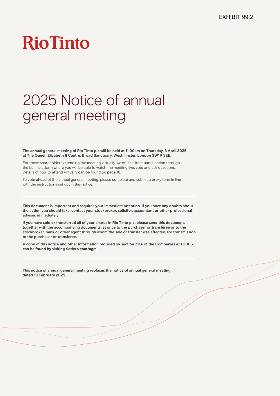 The annual general meeting of Rio Tinto plc will be held at 11:00am on Thursday, 3 April 2025 at The Queen Elizabeth II Centre, Broad Sanctuary, Westminster, London SW1P 3EE. For those shareholders attending the meeting virtually, we will facilitate participation through the Lumi platform where you will be able to watch the meeting live, vote and ask questions. Details of how to attend virtually can be found on page 18. To vote ahead of the annual general meeting, please complete and submit a proxy form in line with the instructions set out in this notice. This document is important and requires your immediate attention. If you have any doubts about the action you should take, contact your stockbroker, solicitor, accountant or other professional adviser, immediately. If you have sold or transferred all of your shares in Rio Tinto plc, please send this document, together with the accompanying documents, at once to the purchaser or transferee or to the stockbroker, bank or other agent through whom the sale or transfer was effected, for transmission to the purchaser or transferee. A copy of this notice and other information required by section 311A of the Companies Act 2006 can be found by visiting riotinto.com/agm. This notice of annual general meeting replaces the notice of annual general meeting dated 19 February 2025. 2025 Notice of annual general meeting EXHIBIT 99.2