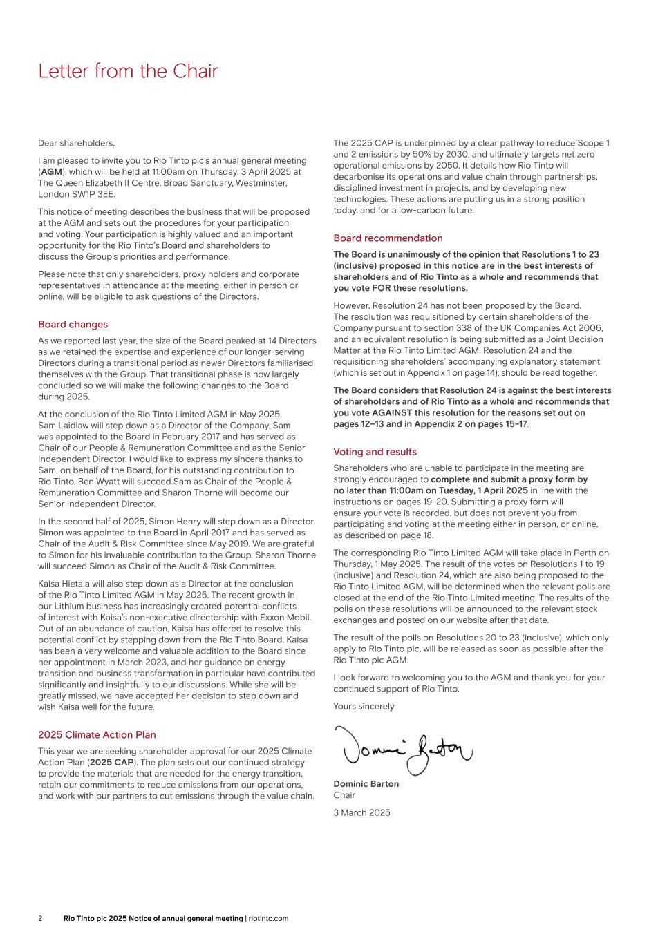Letter from the Chair Dear shareholders, I am pleased to invite you to Rio Tinto plc’s annual general meeting (AGM), which will be held at 11:00am on Thursday, 3 April 2025 at The Queen Elizabeth II Centre, Broad Sanctuary, Westminster, London SW1P 3EE. This notice of meeting describes the business that will be proposed at the AGM and sets out the procedures for your participation and voting. Your participation is highly valued and an important opportunity for the Rio Tinto’s Board and shareholders to discuss the Group’s priorities and performance. Please note that only shareholders, proxy holders and corporate representatives in attendance at the meeting, either in person or online, will be eligible to ask questions of the Directors. Board changes As we reported last year, the size of the Board peaked at 14 Directors as we retained the expertise and experience of our longer-serving Directors during a transitional period as newer Directors familiarised themselves with the Group. That transitional phase is now largely concluded so we will make the following changes to the Board during 2025. At the conclusion of the Rio Tinto Limited AGM in May 2025, Sam Laidlaw will step down as a Director of the Company. Sam was appointed to the Board in February 2017 and has served as Chair of our People & Remuneration Committee and as the Senior Independent Director. I would like to express my sincere thanks to Sam, on behalf of the Board, for his outstanding contribution to Rio Tinto. Ben Wyatt will succeed Sam as Chair of the People & Remuneration Committee and Sharon Thorne will become our Senior Independent Director. In the second half of 2025, Simon Henry will step down as a Director. Simon was appointed to the Board in April 2017 and has served as Chair of the Audit & Risk Committee since May 2019. We are grateful to Simon for his invaluable contribution to the Group. Sharon Thorne will succeed Simon as Chair of the Audit & Risk Committee. Kaisa Hietala will also step down as a Director at the conclusion of the Rio Tinto Limited AGM in May 2025. The recent growth in our Lithium business has increasingly created potential conflicts of interest with Kaisa’s non-executive directorship with Exxon Mobil. Out of an abundance of caution, Kaisa has offered to resolve this potential conflict by stepping down from the Rio Tinto Board. Kaisa has been a very welcome and valuable addition to the Board since her appointment in March 2023, and her guidance on energy transition and business transformation in particular have contributed significantly and insightfully to our discussions. While she will be greatly missed, we have accepted her decision to step down and wish Kaisa well for the future. 2025 Climate Action Plan This year we are seeking shareholder approval for our 2025 Climate Action Plan (2025 CAP). The plan sets out our continued strategy to provide the materials that are needed for the energy transition, retain our commitments to reduce emissions from our operations, and work with our partners to cut emissions through the value chain. The 2025 CAP is underpinned by a clear pathway to reduce Scope 1 and 2 emissions by 50% by 2030, and ultimately targets net zero operational emissions by 2050. It details how Rio Tinto will decarbonise its operations and value chain through partnerships, disciplined investment in projects, and by developing new technologies. These actions are putting us in a strong position today, and for a low-carbon future. Board recommendation The Board is unanimously of the opinion that Resolutions 1 to 23 (inclusive) proposed in this notice are in the best interests of shareholders and of Rio Tinto as a whole and recommends that you vote FOR these resolutions. However, Resolution 24 has not been proposed by the Board. The resolution was requisitioned by certain shareholders of the Company pursuant to section 338 of the UK Companies Act 2006, and an equivalent resolution is being submitted as a Joint Decision Matter at the Rio Tinto Limited AGM. Resolution 24 and the requisitioning shareholders’ accompanying explanatory statement (which is set out in Appendix 1 on page 14), should be read together. The Board considers that Resolution 24 is against the best interests of shareholders and of Rio Tinto as a whole and recommends that you vote AGAINST this resolution for the reasons set out on pages 12–13 and in Appendix 2 on pages 15-17. Voting and results Shareholders who are unable to participate in the meeting are strongly encouraged to complete and submit a proxy form by no later than 11:00am on Tuesday, 1 April 2025 in line with the instructions on pages 19-20. Submitting a proxy form will ensure your vote is recorded, but does not prevent you from participating and voting at the meeting either in person, or online, as described on page 18. The corresponding Rio Tinto Limited AGM will take place in Perth on Thursday, 1 May 2025. The result of the votes on Resolutions 1 to 19 (inclusive) and Resolution 24, which are also being proposed to the Rio Tinto Limited AGM, will be determined when the relevant polls are closed at the end of the Rio Tinto Limited meeting. The results of the polls on these resolutions will be announced to the relevant stock exchanges and posted on our website after that date. The result of the polls on Resolutions 20 to 23 (inclusive), which only apply to Rio Tinto plc, will be released as soon as possible after the Rio Tinto plc AGM. I look forward to welcoming you to the AGM and thank you for your continued support of Rio Tinto. Yours sincerely Dominic Barton Chair 3 March 2025 2 Rio Tinto plc 2025 Notice of annual general meeting | riotinto.com