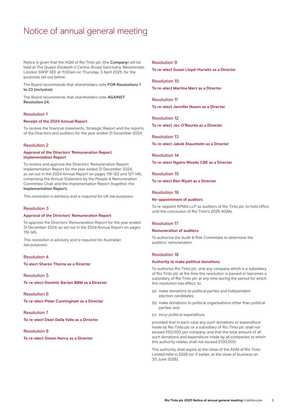 Notice of annual general meeting Notice is given that the AGM of Rio Tinto plc (the Company) will be held at The Queen Elizabeth II Centre, Broad Sanctuary, Westminster, London SW1P 3EE at 11:00am on Thursday, 3 April 2025, for the purposes set out below: The Board recommends that shareholders vote FOR Resolutions 1 to 23 (inclusive). The Board recommends that shareholders vote AGAINST Resolution 24. Resolution 1 Receipt of the 2024 Annual Report To receive the financial statements, Strategic Report and the reports of the Directors and auditors for the year ended 31 December 2024. Resolution 2 Approval of the Directors’ Remuneration Report: Implementation Report To receive and approve the Directors’ Remuneration Report: Implementation Report for the year ended 31 December 2024, as set out in the 2024 Annual Report on pages 119-122 and 127-145, comprising the Annual Statement by the People & Remuneration Committee Chair and the Implementation Report (together, the Implementation Report). This resolution is advisory and is required for UK law purposes. Resolution 3 Approval of the Directors’ Remuneration Report To approve the Directors’ Remuneration Report for the year ended 31 December 2024, as set out in the 2024 Annual Report on pages 119-145. This resolution is advisory and is required for Australian law purposes. Resolution 4 To elect Sharon Thorne as a Director Resolution 5 To re-elect Dominic Barton BBM as a Director Resolution 6 To re-elect Peter Cunningham as a Director Resolution 7 To re-elect Dean Dalla Valle as a Director Resolution 8 To re-elect Simon Henry as a Director Resolution 9 To re-elect Susan Lloyd-Hurwitz as a Director Resolution 10 To re-elect Martina Merz as a Director Resolution 11 To re-elect Jennifer Nason as a Director Resolution 12 To re-elect Joc O’Rourke as a Director Resolution 13 To re-elect Jakob Stausholm as a Director Resolution 14 To re-elect Ngaire Woods CBE as a Director Resolution 15 To re-elect Ben Wyatt as a Director Resolution 16 Re-appointment of auditors To re-appoint KPMG LLP as auditors of Rio Tinto plc to hold office until the conclusion of Rio Tinto’s 2026 AGMs. Resolution 17 Remuneration of auditors To authorise the Audit & Risk Committee to determine the auditors’ remuneration. Resolution 18 Authority to make political donations To authorise Rio Tinto plc, and any company which is a subsidiary of Rio Tinto plc at the time this resolution is passed or becomes a subsidiary of Rio Tinto plc at any time during the period for which this resolution has effect, to: (a) make donations to political parties and independent election candidates; (b) make donations to political organisations other than political parties; and (c) incur political expenditure, provided that in each case any such donations or expenditure made by Rio Tinto plc or a subsidiary of Rio Tinto plc shall not exceed £50,000 per company, and that the total amount of all such donations and expenditure made by all companies to which this authority relates shall not exceed £100,000. This authority shall expire at the close of the AGM of Rio Tinto Limited held in 2026 (or, if earlier, at the close of business on 30 June 2026). 3Rio Tinto plc 2025 Notice of annual general meeting | riotinto.com