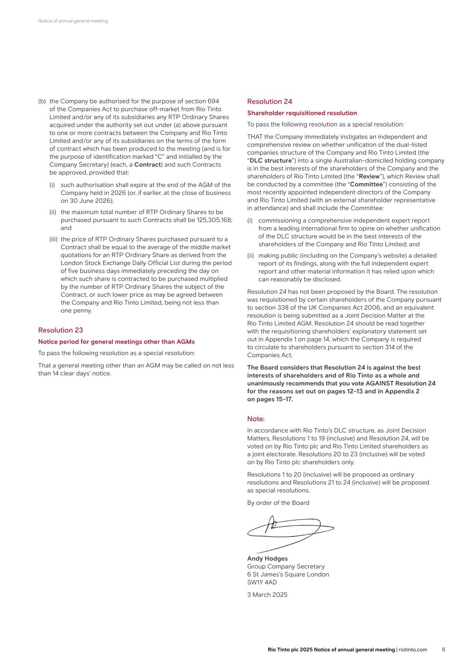 Notice of annual general meeting (b) the Company be authorised for the purpose of section 694 of the Companies Act to purchase off-market from Rio Tinto Limited and/or any of its subsidiaries any RTP Ordinary Shares acquired under the authority set out under (a) above pursuant to one or more contracts between the Company and Rio Tinto Limited and/or any of its subsidiaries on the terms of the form of contract which has been produced to the meeting (and is for the purpose of identification marked “C” and initialled by the Company Secretary) (each, a Contract) and such Contracts be approved, provided that: (i) such authorisation shall expire at the end of the AGM of the Company held in 2026 (or, if earlier, at the close of business on 30 June 2026); (ii) the maximum total number of RTP Ordinary Shares to be purchased pursuant to such Contracts shall be 125,305,168; and (iii) the price of RTP Ordinary Shares purchased pursuant to a Contract shall be equal to the average of the middle market quotations for an RTP Ordinary Share as derived from the London Stock Exchange Daily Official List during the period of five business days immediately preceding the day on which such share is contracted to be purchased multiplied by the number of RTP Ordinary Shares the subject of the Contract, or such lower price as may be agreed between the Company and Rio Tinto Limited, being not less than one penny. Resolution 23 Notice period for general meetings other than AGMs To pass the following resolution as a special resolution: That a general meeting other than an AGM may be called on not less than 14 clear days’ notice. Resolution 24 Shareholder requisitioned resolution To pass the following resolution as a special resolution: THAT the Company immediately instigates an independent and comprehensive review on whether unification of the dual-listed companies structure of the Company and Rio Tinto Limited (the “DLC structure”) into a single Australian-domiciled holding company is in the best interests of the shareholders of the Company and the shareholders of Rio Tinto Limited (the “Review”), which Review shall be conducted by a committee (the “Committee”) consisting of the most recently appointed independent directors of the Company and Rio Tinto Limited (with an external shareholder representative in attendance) and shall include the Committee: (i) commissioning a comprehensive independent expert report from a leading international firm to opine on whether unification of the DLC structure would be in the best interests of the shareholders of the Company and Rio Tinto Limited; and (ii) making public (including on the Company’s website) a detailed report of its findings, along with the full independent expert report and other material information it has relied upon which can reasonably be disclosed. Resolution 24 has not been proposed by the Board. The resolution was requisitioned by certain shareholders of the Company pursuant to section 338 of the UK Companies Act 2006, and an equivalent resolution is being submitted as a Joint Decision Matter at the Rio Tinto Limited AGM. Resolution 24 should be read together with the requisitioning shareholders’ explanatory statement set out in Appendix 1 on page 14, which the Company is required to circulate to shareholders pursuant to section 314 of the Companies Act. The Board considers that Resolution 24 is against the best interests of shareholders and of Rio Tinto as a whole and unanimously recommends that you vote AGAINST Resolution 24 for the reasons set out on pages 12-13 and in Appendix 2 on pages 15-17. Note: In accordance with Rio Tinto’s DLC structure, as Joint Decision Matters, Resolutions 1 to 19 (inclusive) and Resolution 24, will be voted on by Rio Tinto plc and Rio Tinto Limited shareholders as a joint electorate. Resolutions 20 to 23 (inclusive) will be voted on by Rio Tinto plc shareholders only. Resolutions 1 to 20 (inclusive) will be proposed as ordinary resolutions and Resolutions 21 to 24 (inclusive) will be proposed as special resolutions. By order of the Board Andy Hodges Group Company Secretary 6 St James’s Square London SW1Y 4AD 3 March 2025 5Rio Tinto plc 2025 Notice of annual general meeting | riotinto.com