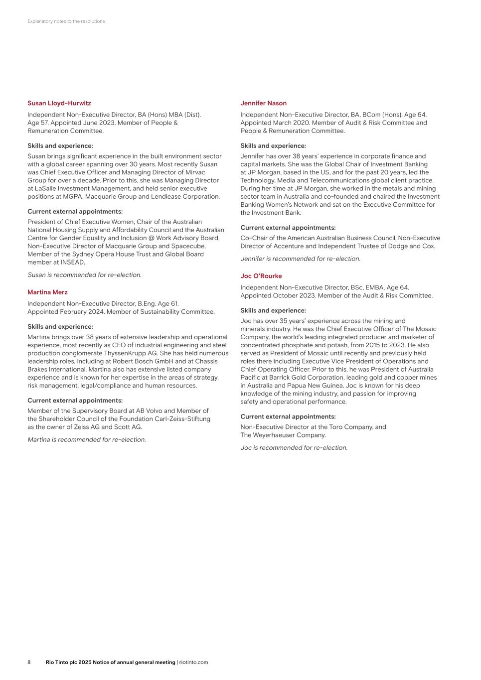 Explanatory notes to the resolutions Susan Lloyd-Hurwitz Independent Non-Executive Director, BA (Hons) MBA (Dist). Age 57. Appointed June 2023. Member of People & Remuneration Committee. Skills and experience: Susan brings significant experience in the built environment sector with a global career spanning over 30 years. Most recently Susan was Chief Executive Officer and Managing Director of Mirvac Group for over a decade. Prior to this, she was Managing Director at LaSalle Investment Management, and held senior executive positions at MGPA, Macquarie Group and Lendlease Corporation. Current external appointments: President of Chief Executive Women, Chair of the Australian National Housing Supply and Affordability Council and the Australian Centre for Gender Equality and Inclusion @ Work Advisory Board, Non-Executive Director of Macquarie Group and Spacecube, Member of the Sydney Opera House Trust and Global Board member at INSEAD. Susan is recommended for re-election. Martina Merz Independent Non-Executive Director, B.Eng. Age 61. Appointed February 2024. Member of Sustainability Committee. Skills and experience: Martina brings over 38 years of extensive leadership and operational experience, most recently as CEO of industrial engineering and steel production conglomerate ThyssenKrupp AG. She has held numerous leadership roles, including at Robert Bosch GmbH and at Chassis Brakes International. Martina also has extensive listed company experience and is known for her expertise in the areas of strategy, risk management, legal/compliance and human resources. Current external appointments: Member of the Supervisory Board at AB Volvo and Member of the Shareholder Council of the Foundation Carl-Zeiss-Stiftung as the owner of Zeiss AG and Scott AG. Martina is recommended for re-election. Jennifer Nason Independent Non-Executive Director, BA, BCom (Hons). Age 64. Appointed March 2020. Member of Audit & Risk Committee and People & Remuneration Committee. Skills and experience: Jennifer has over 38 years’ experience in corporate finance and capital markets. She was the Global Chair of Investment Banking at JP Morgan, based in the US, and for the past 20 years, led the Technology, Media and Telecommunications global client practice. During her time at JP Morgan, she worked in the metals and mining sector team in Australia and co-founded and chaired the Investment Banking Women’s Network and sat on the Executive Committee for the Investment Bank. Current external appointments: Co-Chair of the American Australian Business Council, Non-Executive Director of Accenture and Independent Trustee of Dodge and Cox. Jennifer is recommended for re-election. Joc O’Rourke Independent Non-Executive Director, BSc, EMBA. Age 64. Appointed October 2023. Member of the Audit & Risk Committee. Skills and experience: Joc has over 35 years’ experience across the mining and minerals industry. He was the Chief Executive Officer of The Mosaic Company, the world’s leading integrated producer and marketer of concentrated phosphate and potash, from 2015 to 2023. He also served as President of Mosaic until recently and previously held roles there including Executive Vice President of Operations and Chief Operating Officer. Prior to this, he was President of Australia Pacific at Barrick Gold Corporation, leading gold and copper mines in Australia and Papua New Guinea. Joc is known for his deep knowledge of the mining industry, and passion for improving safety and operational performance. Current external appointments: Non-Executive Director at the Toro Company, and The Weyerhaeuser Company. Joc is recommended for re-election. 8 Rio Tinto plc 2025 Notice of annual general meeting | riotinto.com