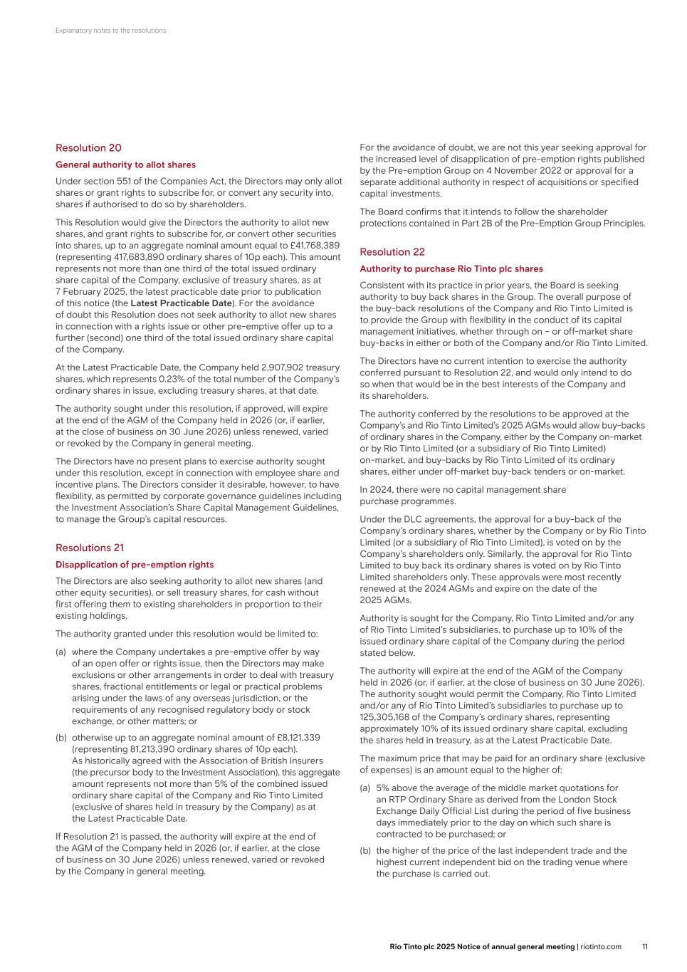 Explanatory notes to the resolutions Resolution 20 General authority to allot shares Under section 551 of the Companies Act, the Directors may only allot shares or grant rights to subscribe for, or convert any security into, shares if authorised to do so by shareholders. This Resolution would give the Directors the authority to allot new shares, and grant rights to subscribe for, or convert other securities into shares, up to an aggregate nominal amount equal to £41,768,389 (representing 417,683,890 ordinary shares of 10p each). This amount represents not more than one third of the total issued ordinary share capital of the Company, exclusive of treasury shares, as at 7 February 2025, the latest practicable date prior to publication of this notice (the Latest Practicable Date). For the avoidance of doubt this Resolution does not seek authority to allot new shares in connection with a rights issue or other pre-emptive offer up to a further (second) one third of the total issued ordinary share capital of the Company. At the Latest Practicable Date, the Company held 2,907,902 treasury shares, which represents 0.23% of the total number of the Company’s ordinary shares in issue, excluding treasury shares, at that date. The authority sought under this resolution, if approved, will expire at the end of the AGM of the Company held in 2026 (or, if earlier, at the close of business on 30 June 2026) unless renewed, varied or revoked by the Company in general meeting. The Directors have no present plans to exercise authority sought under this resolution, except in connection with employee share and incentive plans. The Directors consider it desirable, however, to have flexibility, as permitted by corporate governance guidelines including the Investment Association’s Share Capital Management Guidelines, to manage the Group’s capital resources. Resolutions 21 Disapplication of pre-emption rights The Directors are also seeking authority to allot new shares (and other equity securities), or sell treasury shares, for cash without first offering them to existing shareholders in proportion to their existing holdings. The authority granted under this resolution would be limited to: (a) where the Company undertakes a pre-emptive offer by way of an open offer or rights issue, then the Directors may make exclusions or other arrangements in order to deal with treasury shares, fractional entitlements or legal or practical problems arising under the laws of any overseas jurisdiction, or the requirements of any recognised regulatory body or stock exchange, or other matters; or (b) otherwise up to an aggregate nominal amount of £8,121,339 (representing 81,213,390 ordinary shares of 10p each). As historically agreed with the Association of British Insurers (the precursor body to the Investment Association), this aggregate amount represents not more than 5% of the combined issued ordinary share capital of the Company and Rio Tinto Limited (exclusive of shares held in treasury by the Company) as at the Latest Practicable Date. If Resolution 21 is passed, the authority will expire at the end of the AGM of the Company held in 2026 (or, if earlier, at the close of business on 30 June 2026) unless renewed, varied or revoked by the Company in general meeting. For the avoidance of doubt, we are not this year seeking approval for the increased level of disapplication of pre-emption rights published by the Pre-emption Group on 4 November 2022 or approval for a separate additional authority in respect of acquisitions or specified capital investments. The Board confirms that it intends to follow the shareholder protections contained in Part 2B of the Pre-Emption Group Principles. Resolution 22 Authority to purchase Rio Tinto plc shares Consistent with its practice in prior years, the Board is seeking authority to buy back shares in the Group. The overall purpose of the buy-back resolutions of the Company and Rio Tinto Limited is to provide the Group with flexibility in the conduct of its capital management initiatives, whether through on – or off-market share buy-backs in either or both of the Company and/or Rio Tinto Limited. The Directors have no current intention to exercise the authority conferred pursuant to Resolution 22, and would only intend to do so when that would be in the best interests of the Company and its shareholders. The authority conferred by the resolutions to be approved at the Company’s and Rio Tinto Limited’s 2025 AGMs would allow buy-backs of ordinary shares in the Company, either by the Company on-market or by Rio Tinto Limited (or a subsidiary of Rio Tinto Limited) on-market, and buy-backs by Rio Tinto Limited of its ordinary shares, either under off-market buy-back tenders or on-market. In 2024, there were no capital management share purchase programmes. Under the DLC agreements, the approval for a buy-back of the Company’s ordinary shares, whether by the Company or by Rio Tinto Limited (or a subsidiary of Rio Tinto Limited), is voted on by the Company’s shareholders only. Similarly, the approval for Rio Tinto Limited to buy back its ordinary shares is voted on by Rio Tinto Limited shareholders only. These approvals were most recently renewed at the 2024 AGMs and expire on the date of the 2025 AGMs. Authority is sought for the Company, Rio Tinto Limited and/or any of Rio Tinto Limited’s subsidiaries, to purchase up to 10% of the issued ordinary share capital of the Company during the period stated below. The authority will expire at the end of the AGM of the Company held in 2026 (or, if earlier, at the close of business on 30 June 2026). The authority sought would permit the Company, Rio Tinto Limited and/or any of Rio Tinto Limited’s subsidiaries to purchase up to 125,305,168 of the Company’s ordinary shares, representing approximately 10% of its issued ordinary share capital, excluding the shares held in treasury, as at the Latest Practicable Date. The maximum price that may 