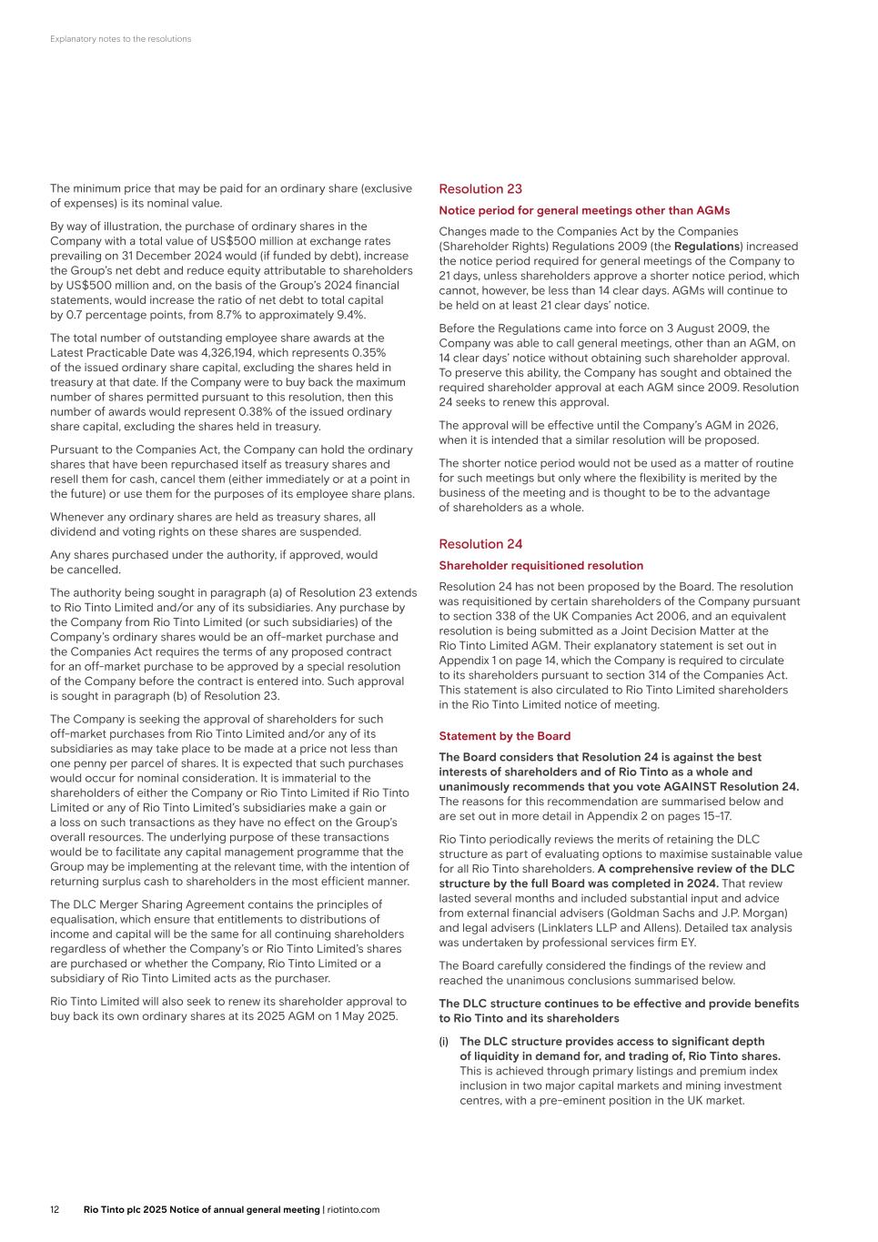 Explanatory notes to the resolutions The minimum price that may be paid for an ordinary share (exclusive of expenses) is its nominal value. By way of illustration, the purchase of ordinary shares in the Company with a total value of US$500 million at exchange rates prevailing on 31 December 2024 would (if funded by debt), increase the Group’s net debt and reduce equity attributable to shareholders by US$500 million and, on the basis of the Group’s 2024 financial statements, would increase the ratio of net debt to total capital by 0.7 percentage points, from 8.7% to approximately 9.4%. The total number of outstanding employee share awards at the Latest Practicable Date was 4,326,194, which represents 0.35% of the issued ordinary share capital, excluding the shares held in treasury at that date. If the Company were to buy back the maximum number of shares permitted pursuant to this resolution, then this number of awards would represent 0.38% of the issued ordinary share capital, excluding the shares held in treasury. Pursuant to the Companies Act, the Company can hold the ordinary shares that have been repurchased itself as treasury shares and resell them for cash, cancel them (either immediately or at a point in the future) or use them for the purposes of its employee share plans. Whenever any ordinary shares are held as treasury shares, all dividend and voting rights on these shares are suspended. Any shares purchased under the authority, if approved, would be cancelled. The authority being sought in paragraph (a) of Resolution 23 extends to Rio Tinto Limited and/or any of its subsidiaries. Any purchase by the Company from Rio Tinto Limited (or such subsidiaries) of the Company’s ordinary shares would be an off-market purchase and the Companies Act requires the terms of any proposed contract for an off-market purchase to be approved by a special resolution of the Company before the contract is entered into. Such approval is sought in paragraph (b) of Resolution 23. The Company is seeking the approval of shareholders for such off-market purchases from Rio Tinto Limited and/or any of its subsidiaries as may take place to be made at a price not less than one penny per parcel of shares. It is expected that such purchases would occur for nominal consideration. It is immaterial to the shareholders of either the Company or Rio Tinto Limited if Rio Tinto Limited or any of Rio Tinto Limited’s subsidiaries make a gain or a loss on such transactions as they have no effect on the Group’s overall resources. The underlying purpose of these transactions would be to facilitate any capital management programme that the Group may be implementing at the relevant time, with the intention of returning surplus cash to shareholders in the most efficient manner. The DLC Merger Sharing Agreement contains the principles of equalisation, which ensure that entitlements to distributions of income and capital will be the same for all continuing shareholders regardless of whether the Company’s or Rio Tinto Limited’s shares are purchased or whether the Company, Rio Tinto Limited or a subsidiary of Rio Tinto Limited acts as the purchaser. Rio Tinto Limited will also seek to renew its shareholder approval to buy back its own ordinary shares at its 2025 AGM on 1 May 2025. Resolution 23 Notice period for general meetings other than AGMs Changes made to the Companies Act by the Companies (Shareholder Rights) Regulations 2009 (the Regulations) increased the notice period required for general meetings of the Company to 21 days, unless shareholders approve a shorter notice period, which cannot, however, be less than 14 clear days. AGMs will continue to be held on at least 21 clear days’ notice. Before the Regulations came into force on 3 August 2009, the Company was able to call general meetings, other than an AGM, on 14 clear days’ notice without obtaining such shareholder approval. To preserve this ability, the Company has sought and obtained the required shareholder approval at each AGM since 2009. Resolution 24 seeks to renew this approval. The approval will be effective until the Company’s AGM in 2026, when it is intended that a similar resolution will be proposed. The shorter notice period would not be used as a matter of routine for such meetings but only where the flexibility is merited by the business of the meeting and is thought to be to the advantage of shareholders as a whole. Resolution 24 Shareholder requisitioned resolution Resolution 24 has not been proposed by the Board. The resolution was requisitioned by certain shareholders of the Company pursuant to section 338 of the UK Companies Act 2006, and an equivalent resolution is being submitted as a Joint Decision Matter at the Rio Tinto Limited AGM. Their explanatory statement is set out in Appendix 1 on page 14, which the Company is required to circulate to its shareholders pursuant to section 314 of the Companies Act. This statement is also circulated to Rio Tinto Limited shareholders in the Rio Tinto Limited notice of meeting. Statement by the Board The Board considers that Resolution 24 is against the best interests of shareholders and of Rio Tinto as a whole and unanimously recommends that you vote AGAINST Resolution 24. The reasons for this recommendation are summarised below and are set out in more detail in Appendix 2 on pages 15-17. Rio Tinto periodically reviews the merits of retaining the DLC structure as part of evaluating options to maximise sustainable value for all Rio Tinto shareholders. A comprehensive review of the DLC structure by the full Board was completed in 2024. That review lasted several months and included substantial input and advice from external financial advisers (Goldman Sachs and J.P. Morgan) and legal advisers (Linklaters LLP and Allens). Detailed tax analysis was undertaken by professional services firm EY. The Board carefully considered the findings of the review and reached the unanimous conclusions sum