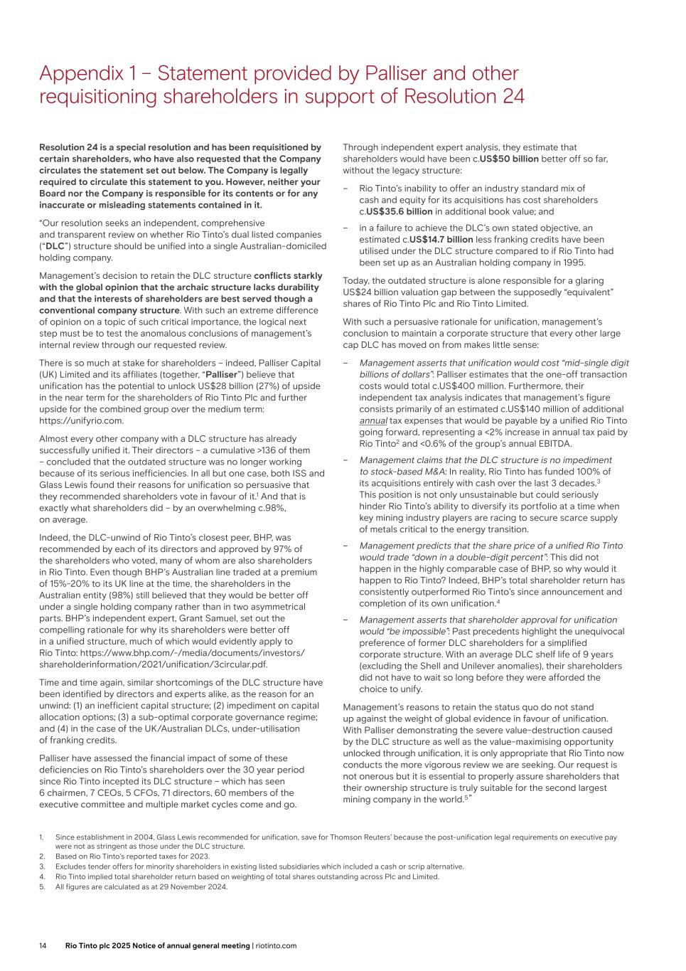 Explanatory notes to the resolutions (ii) The DLC structure provides flexibility to raise capital, pursue strategic M&A and deliver shareholder returns. The DLC structure provides optionality for the Group to offer equity in either Rio Tinto plc or Rio Tinto Limited to raise capital or use as share consideration in acquisitions. The DLC structure fully supports the Group’s shareholder returns policy with Rio Tinto plc being one of the top five dividend payers in the FTSE-100. (iii) The DLC structure enables a more efficient utilisation of franking credits. Since the DLC structure was established, Rio Tinto Limited has always paid fully franked dividends to its shareholders and it is anticipated that Rio Tinto Limited will continue to do so in the longer term. Under a unified Rio Tinto, franking credits would need to be attached to all dividends paid, even though shareholders not tax-resident in Australia could not utilise them. It is anticipated that the Group would not be able to pay fully franked dividends in the longer term under a unified structure. A unification under Rio Tinto Limited would be value destructive for the Group (i) Unification is expected to result in tax costs in the mid-single digit billions of US dollars. This would reduce the Group’s net asset value per share. These tax costs were subject to detailed analysis by professional services firm EY. The nature and scope of these tax costs are specific to Rio Tinto, taking into account its structure, with significant operations outside Australia being held by Rio Tinto plc, and the tax positions across the large number of jurisdictions in which it operates. It is therefore misleading to compare the costs of unification for Rio Tinto to other companies. (ii) Unification is not expected to result in a unified Rio Tinto trading at or above the Rio Tinto Limited share price. There is unlikely to be sufficient incremental demand from Australian tax-resident shareholders to absorb the very significant number of new Rio Tinto Limited shares that would be issued on unification and therefore to support a higher unified Rio Tinto share price. As such, it is more likely that a re-rated unified Rio Tinto share price would trend towards the weighted average of the Rio Tinto plc and Rio Tinto Limited share prices. The Board firmly rejects Palliser’s claim that the DLC structure has resulted in value destruction of c.US$50 billion The Board believes that the assertions made by Palliser Capital Master Fund Ltd and its affiliates (together Palliser) are unfounded and misleading. They are based on flawed and highly selective assumptions. As set out in further detail in Appendix 2, Palliser attributes c.US$35.6 billion of this value to the “inability to issue stock for M&A” based on hypothetical assumptions for historical acquisitions by Rio Tinto. Palliser has failed to consider the matrix of factors that would have been considered by Rio Tinto at the time of each acquisition including, but not limited to, Rio Tinto’s capital allocation framework, the expectation of shareholder returns under different funding sources, and each acquisition counterparty’s willingness to accept Rio Tinto shares. Palliser attributes c.US$14.7 billion of value to franking credits that would have been utilised without the DLC in place. This is based on an unreasonable assumption that there would have been sufficient incremental demand for unified Rio Tinto shares from Australian tax-residents to utilise these franking credits and does not account for the resulting depletion of franking credits to facilitate fully-franked dividends in the longer term. The Board firmly rejects the notion that the DLC structure has resulted in value destruction of c.US$50 billion, and reiterates its strong focus on sustainable shareholder value creation and effective capital management. Resolution 24 is therefore against the best interests of shareholders and Rio Tinto as a whole Given the comprehensive review conducted in 2024 and the conclusive findings from that review in support of retaining the DLC structure, the Board unanimously believes that the proposal as set out in Resolution 24 is highly duplicative and unnecessary. There is no basis for expecting that an additional review including an independent expert report would lead to a different conclusion. In addition, there would be limited information that could be reasonably disclosed publicly given the confidential and highly commercially sensitive nature of the information, including detailed analysis of tax costs and forecast financial information. Publication of the full findings would be materially prejudicial to shareholders’ interests. Your Directors therefore unanimously recommend that you vote AGAINST Resolution 24, as the Directors intend to do so in respect of their own beneficial holdings. Appendix 2 on pages 15-17 contains further details setting out the reasons for the Board’s recommendation. Further information in relation to Resolution 24 may be published on the Rio Tinto website at riotinto.com/agm. 13Rio Tinto plc 2025 Notice of annual general meeting | riotinto.com