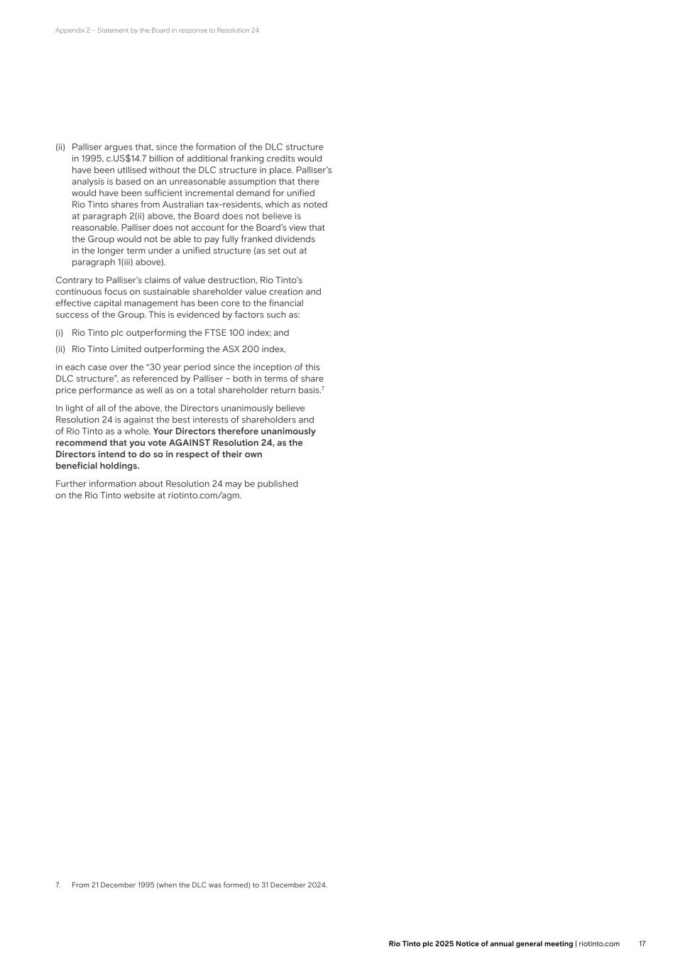 Appendix 2 – Statement by the Board in response to Resolution 24 (ii) Palliser argues that, since the formation of the DLC structure in 1995, c.US$14.7 billion of additional franking credits would have been utilised without the DLC structure in place. Palliser’s analysis is based on an unreasonable assumption that there would have been sufficient incremental demand for unified Rio Tinto shares from Australian tax-residents, which as noted at paragraph 2(ii) above, the Board does not believe is reasonable. Palliser does not account for the Board’s view that the Group would not be able to pay fully franked dividends in the longer term under a unified structure (as set out at paragraph 1(iii) above). Contrary to Palliser’s claims of value destruction, Rio Tinto’s continuous focus on sustainable shareholder value creation and effective capital management has been core to the financial success of the Group. This is evidenced by factors such as: (i) Rio Tinto plc outperforming the FTSE 100 index; and (ii) Rio Tinto Limited outperforming the ASX 200 index, in each case over the “30 year period since the inception of this DLC structure”, as referenced by Palliser – both in terms of share price performance as well as on a total shareholder return basis.7 In light of all of the above, the Directors unanimously believe Resolution 24 is against the best interests of shareholders and of Rio Tinto as a whole. Your Directors therefore unanimously recommend that you vote AGAINST Resolution 24, as the Directors intend to do so in respect of their own beneficial holdings. Further information about Resolution 24 may be published on the Rio Tinto website at riotinto.com/agm. 7. From 21 December 1995 (when the DLC was formed) to 31 December 2024. 17Rio Tinto plc 2025 Notice of annual general meeting | riotinto.com