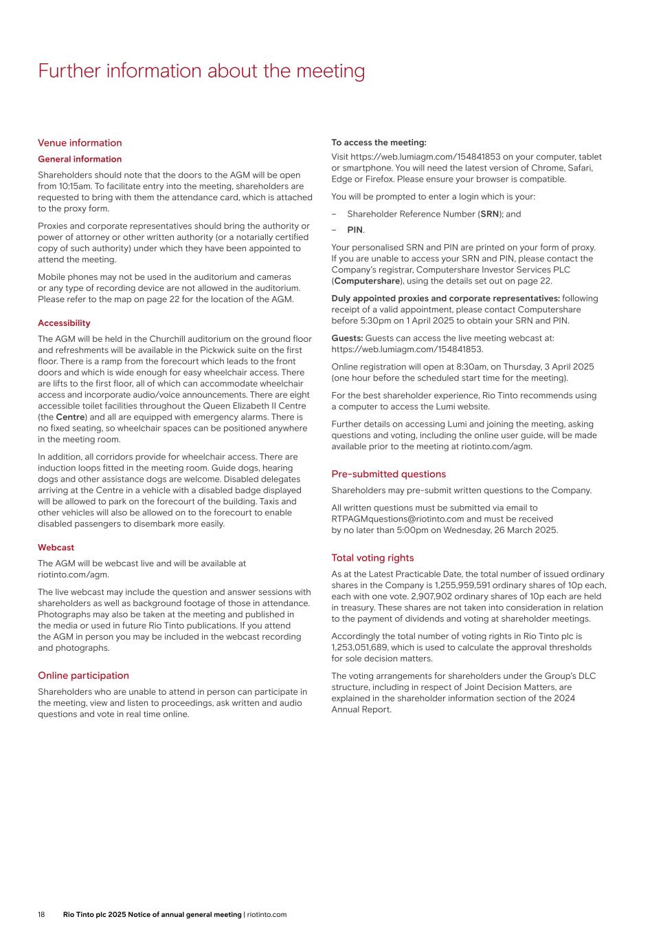 Further information about the meeting Venue information General information Shareholders should note that the doors to the AGM will be open from 10:15am. To facilitate entry into the meeting, shareholders are requested to bring with them the attendance card, which is attached to the proxy form. Proxies and corporate representatives should bring the authority or power of attorney or other written authority (or a notarially certified copy of such authority) under which they have been appointed to attend the meeting. Mobile phones may not be used in the auditorium and cameras or any type of recording device are not allowed in the auditorium. Please refer to the map on page 22 for the location of the AGM. Accessibility The AGM will be held in the Churchill auditorium on the ground floor and refreshments will be available in the Pickwick suite on the first floor. There is a ramp from the forecourt which leads to the front doors and which is wide enough for easy wheelchair access. There are lifts to the first floor, all of which can accommodate wheelchair access and incorporate audio/voice announcements. There are eight accessible toilet facilities throughout the Queen Elizabeth II Centre (the Centre) and all are equipped with emergency alarms. There is no fixed seating, so wheelchair spaces can be positioned anywhere in the meeting room. In addition, all corridors provide for wheelchair access. There are induction loops fitted in the meeting room. Guide dogs, hearing dogs and other assistance dogs are welcome. Disabled delegates arriving at the Centre in a vehicle with a disabled badge displayed will be allowed to park on the forecourt of the building. Taxis and other vehicles will also be allowed on to the forecourt to enable disabled passengers to disembark more easily. Webcast The AGM will be webcast live and will be available at riotinto.com/agm. The live webcast may include the question and answer sessions with shareholders as well as background footage of those in attendance. Photographs may also be taken at the meeting and published in the media or used in future Rio Tinto publications. If you attend the AGM in person you may be included in the webcast recording and photographs. Online participation Shareholders who are unable to attend in person can participate in the meeting, view and listen to proceedings, ask written and audio questions and vote in real time online. To access the meeting: Visit https://web.lumiagm.com/154841853 on your computer, tablet or smartphone. You will need the latest version of Chrome, Safari, Edge or Firefox. Please ensure your browser is compatible. You will be prompted to enter a login which is your: – Shareholder Reference Number (SRN); and – PIN. Your personalised SRN and PIN are printed on your form of proxy. If you are unable to access your SRN and PIN, please contact the Company’s registrar, Computershare Investor Services PLC (Computershare), using the details set out on page 22. Duly appointed proxies and corporate representatives: following receipt of a valid appointment, please contact Computershare before 5:30pm on 1 April 2025 to obtain your SRN and PIN. Guests: Guests can access the live meeting webcast at: https://web.lumiagm.com/154841853. Online registration will open at 8:30am, on Thursday, 3 April 2025 (one hour before the scheduled start time for the meeting). For the best shareholder experience, Rio Tinto recommends using a computer to access the Lumi website. Further details on accessing Lumi and joining the meeting, asking questions and voting, including the online user guide, will be made available prior to the meeting at riotinto.com/agm. Pre-submitted questions Shareholders may pre-submit written questions to the Company. All written questions must be submitted via email to RTPAGMquestions@riotinto.com and must be received by no later than 5:00pm on Wednesday, 26 March 2025. Total voting rights As at the Latest Practicable Date, the total number of issued ordinary shares in the Company is 1,255,959,591 ordinary shares of 10p each, each with one vote. 2,907,902 ordinary shares of 10p each are held in treasury. These shares are not taken into consideration in relation to the payment of dividends and voting at shareholder meetings. Accordingly the total number of voting rights in Rio Tinto plc is 1,253,051,689, which is used to calculate the approval thresholds for sole decision matters. The voting arrangements for shareholders under the Group’s DLC structure, including in respect of Joint Decision Matters, are explained in the shareholder information section of the 2024 Annual Report. 18 Rio Tinto plc 2025 Notice of annual general meeting | riotinto.com
