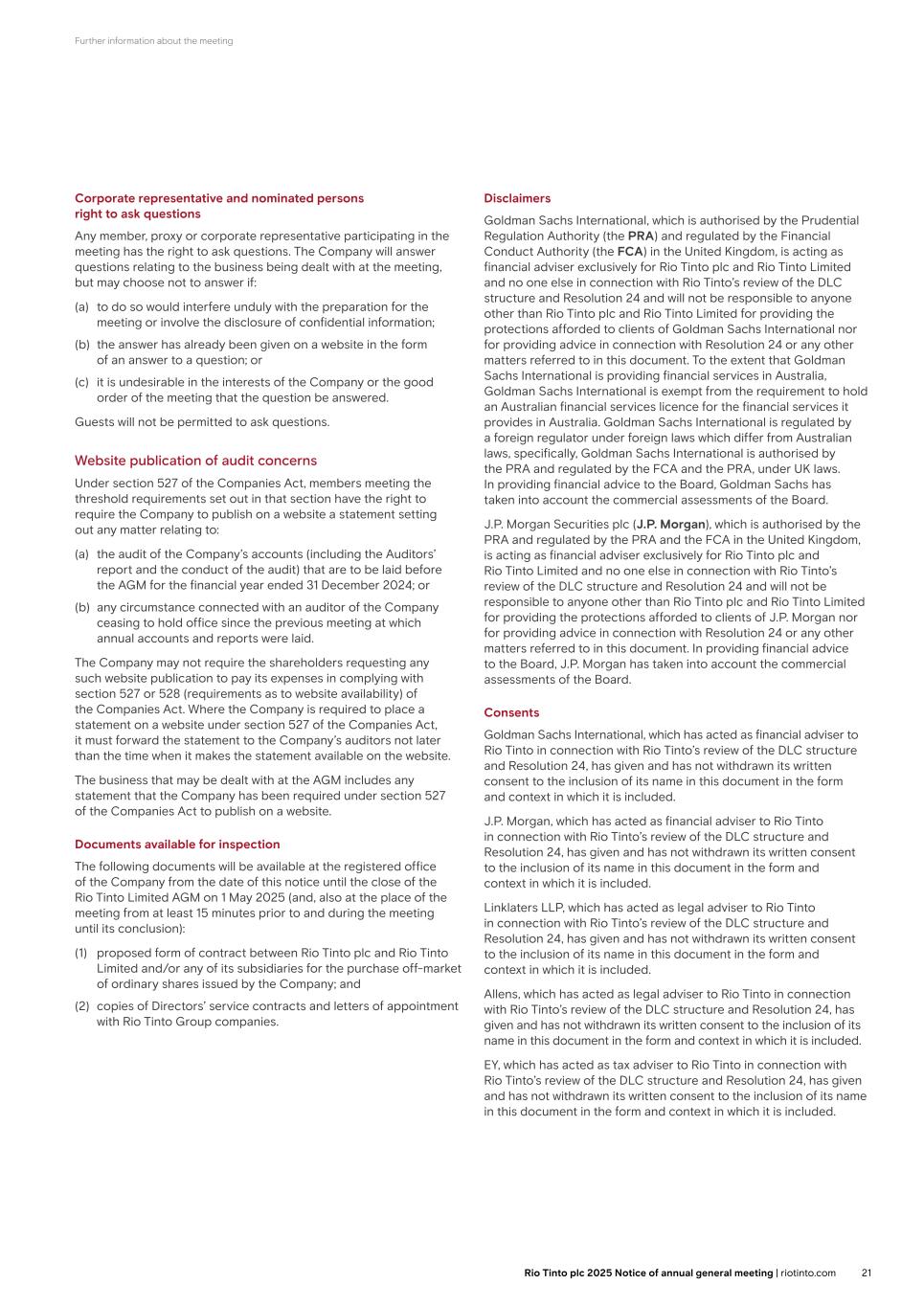 Further information about the meeting Corporate representative and nominated persons right to ask questions Any member, proxy or corporate representative participating in the meeting has the right to ask questions. The Company will answer questions relating to the business being dealt with at the meeting, but may choose not to answer if: (a) to do so would interfere unduly with the preparation for the meeting or involve the disclosure of confidential information; (b) the answer has already been given on a website in the form of an answer to a question; or (c) it is undesirable in the interests of the Company or the good order of the meeting that the question be answered. Guests will not be permitted to ask questions. Website publication of audit concerns Under section 527 of the Companies Act, members meeting the threshold requirements set out in that section have the right to require the Company to publish on a website a statement setting out any matter relating to: (a) the audit of the Company’s accounts (including the Auditors’ report and the conduct of the audit) that are to be laid before the AGM for the financial year ended 31 December 2024; or (b) any circumstance connected with an auditor of the Company ceasing to hold office since the previous meeting at which annual accounts and reports were laid. The Company may not require the shareholders requesting any such website publication to pay its expenses in complying with section 527 or 528 (requirements as to website availability) of the Companies Act. Where the Company is required to place a statement on a website under section 527 of the Companies Act, it must forward the statement to the Company’s auditors not later than the time when it makes the statement available on the website. The business that may be dealt with at the AGM includes any statement that the Company has been required under section 527 of the Companies Act to publish on a website. Documents available for inspection The following documents will be available at the registered office of the Company from the date of this notice until the close of the Rio Tinto Limited AGM on 1 May 2025 (and, also at the place of the meeting from at least 15 minutes prior to and during the meeting until its conclusion): (1) proposed form of contract between Rio Tinto plc and Rio Tinto Limited and/or any of its subsidiaries for the purchase off-market of ordinary shares issued by the Company; and (2) copies of Directors’ service contracts and letters of appointment with Rio Tinto Group companies. Disclaimers Goldman Sachs International, which is authorised by the Prudential Regulation Authority (the PRA) and regulated by the Financial Conduct Authority (the FCA) in the United Kingdom, is acting as financial adviser exclusively for Rio Tinto plc and Rio Tinto Limited and no one else in connection with Rio Tinto’s review of the DLC structure and Resolution 24 and will not be responsible to anyone other than Rio Tinto plc and Rio Tinto Limited for providing the protections afforded to clients of Goldman Sachs International nor for providing advice in connection with Resolution 24 or any other matters referred to in this document. To the extent that Goldman Sachs International is providing financial services in Australia, Goldman Sachs International is exempt from the requirement to hold an Australian financial services licence for the financial services it provides in Australia. Goldman Sachs International is regulated by a foreign regulator under foreign laws which differ from Australian laws, specifically, Goldman Sachs International is authorised by the PRA and regulated by the FCA and the PRA, under UK laws. In providing financial advice to the Board, Goldman Sachs has taken into account the commercial assessments of the Board. J.P. Morgan Securities plc (J.P. Morgan), which is authorised by the PRA and regulated by the PRA and the FCA in the United Kingdom, is acting as financial adviser exclusively for Rio Tinto plc and Rio Tinto Limited and no one else in connection with Rio Tinto’s review of the DLC structure and Resolution 24 and will not be responsible to anyone other than Rio Tinto plc and Rio Tinto Limited for providing the protections afforded to clients of J.P. Morgan nor for providing advice in connection with Resolution 24 or any other matters referred to in this document. In providing financial advice to the Board, J.P. Morgan has taken into account the commercial assessments of the Board. Consents Goldman Sachs International, which has acted as financial adviser to Rio Tinto in connection with Rio Tinto’s review of the DLC structure and Resolution 24, has given and has not withdrawn its written consent to the inclusion of its name in this document in the form and context in which it is included. J.P. Morgan, which has acted as financial adviser to Rio Tinto in connection with Rio Tinto’s review of the DLC structure and Resolution 24, has given and has not withdrawn its written consent to the inclusion of its name in this document in the form and context in which it is included. Linklaters LLP, which has acted as legal adviser to Rio Tinto in connection with Rio Tinto’s review of the DLC structure and Resolution 24, has given and has not withdrawn its written consent to the inclusion of its name in this document in the form and context in which it is included. Allens, which has acted as legal adviser to Rio Tinto in connection with Rio Tinto’s review of the DLC structure and Resolution 24, has given and has not withdrawn its written consent to the inclusion of its name in this document in the form and context in which it is included. EY, which has acted as tax adviser to Rio Tinto in connection with Rio Tinto’s review of the DLC structure and Resolution 24, has given and has not withdrawn its written consent to the inclusion of its name in this document in the form and context in which it is included. 21Rio Tinto plc 2025 Notice of annual general 