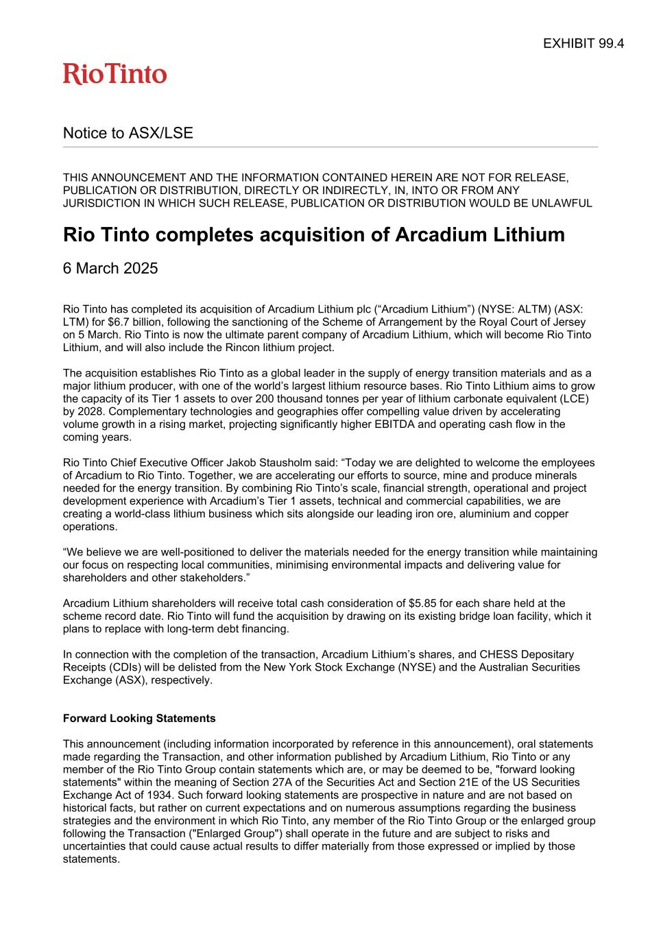 Notice to ASX/LSE THIS ANNOUNCEMENT AND THE INFORMATION CONTAINED HEREIN ARE NOT FOR RELEASE, PUBLICATION OR DISTRIBUTION, DIRECTLY OR INDIRECTLY, IN, INTO OR FROM ANY JURISDICTION IN WHICH SUCH RELEASE, PUBLICATION OR DISTRIBUTION WOULD BE UNLAWFUL Rio Tinto completes acquisition of Arcadium Lithium 6 March 2025 Rio Tinto has completed its acquisition of Arcadium Lithium plc (“Arcadium Lithium”) (NYSE: ALTM) (ASX: LTM) for $6.7 billion, following the sanctioning of the Scheme of Arrangement by the Royal Court of Jersey on 5 March. Rio Tinto is now the ultimate parent company of Arcadium Lithium, which will become Rio Tinto Lithium, and will also include the Rincon lithium project. The acquisition establishes Rio Tinto as a global leader in the supply of energy transition materials and as a major lithium producer, with one of the world’s largest lithium resource bases. Rio Tinto Lithium aims to grow the capacity of its Tier 1 assets to over 200 thousand tonnes per year of lithium carbonate equivalent (LCE) by 2028. Complementary technologies and geographies offer compelling value driven by accelerating volume growth in a rising market, projecting significantly higher EBITDA and operating cash flow in the coming years. Rio Tinto Chief Executive Officer Jakob Stausholm said: “Today we are delighted to welcome the employees of Arcadium to Rio Tinto. Together, we are accelerating our efforts to source, mine and produce minerals needed for the energy transition. By combining Rio Tinto’s scale, financial strength, operational and project development experience with Arcadium’s Tier 1 assets, technical and commercial capabilities, we are creating a world-class lithium business which sits alongside our leading iron ore, aluminium and copper operations. “We believe we are well-positioned to deliver the materials needed for the energy transition while maintaining our focus on respecting local communities, minimising environmental impacts and delivering value for shareholders and other stakeholders.” Arcadium Lithium shareholders will receive total cash consideration of $5.85 for each share held at the scheme record date. Rio Tinto will fund the acquisition by drawing on its existing bridge loan facility, which it plans to replace with long-term debt financing. In connection with the completion of the transaction, Arcadium Lithium’s shares, and CHESS Depositary Receipts (CDIs) will be delisted from the New York Stock Exchange (NYSE) and the Australian Securities Exchange (ASX), respectively. Forward Looking Statements This announcement (including information incorporated by reference in this announcement), oral statements made regarding the Transaction, and other information published by Arcadium Lithium, Rio Tinto or any member of the Rio Tinto Group contain statements which are, or may be deemed to be, "forward looking statements" within the meaning of Section 27A of the Securities Act and Section 21E of the US Securities Exchange Act of 1934. Such forward looking statements are prospective in nature and are not based on historical facts, but rather on current expectations and on numerous assumptions regarding the business strategies and the environment in which Rio Tinto, any member of the Rio Tinto Group or the enlarged group following the Transaction ("Enlarged Group") shall operate in the future and are subject to risks and uncertainties that could cause actual results to differ materially from those expressed or implied by those statements. EXHIBIT 99.4