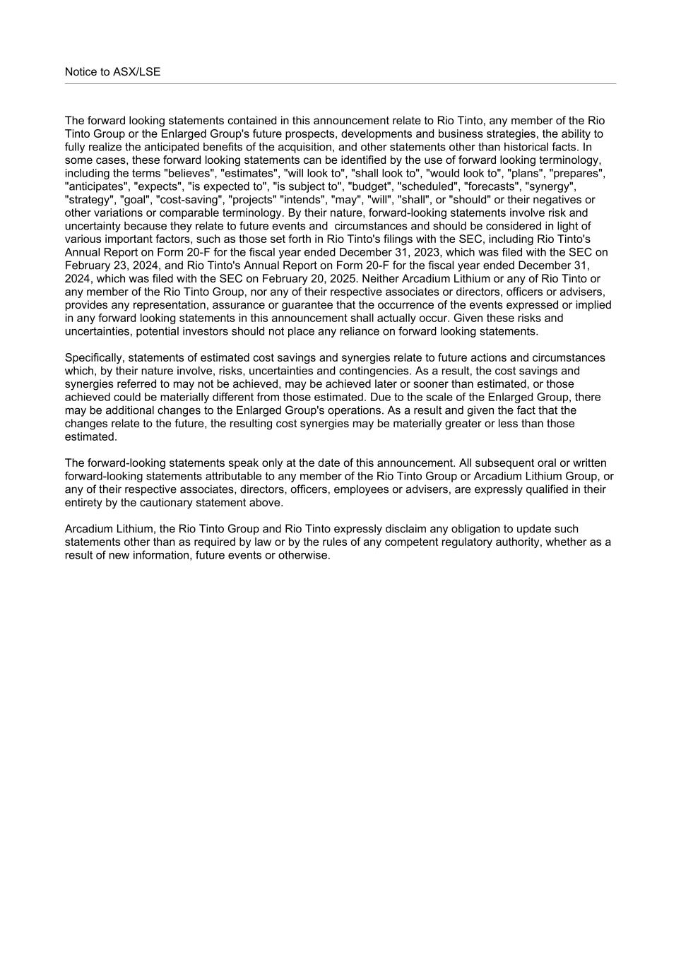 Notice to ASX/LSE The forward looking statements contained in this announcement relate to Rio Tinto, any member of the Rio Tinto Group or the Enlarged Group's future prospects, developments and business strategies, the ability to fully realize the anticipated benefits of the acquisition, and other statements other than historical facts. In some cases, these forward looking statements can be identified by the use of forward looking terminology, including the terms "believes", "estimates", "will look to", "shall look to", "would look to", "plans", "prepares", "anticipates", "expects", "is expected to", "is subject to", "budget", "scheduled", "forecasts", "synergy", "strategy", "goal", "cost-saving", "projects" "intends", "may", "will", "shall", or "should" or their negatives or other variations or comparable terminology. By their nature, forward-looking statements involve risk and uncertainty because they relate to future events and circumstances and should be considered in light of various important factors, such as those set forth in Rio Tinto's filings with the SEC, including Rio Tinto's Annual Report on Form 20-F for the fiscal year ended December 31, 2023, which was filed with the SEC on February 23, 2024, and Rio Tinto's Annual Report on Form 20-F for the fiscal year ended December 31, 2024, which was filed with the SEC on February 20, 2025. Neither Arcadium Lithium or any of Rio Tinto or any member of the Rio Tinto Group, nor any of their respective associates or directors, officers or advisers, provides any representation, assurance or guarantee that the occurrence of the events expressed or implied in any forward looking statements in this announcement shall actually occur. Given these risks and uncertainties, potential investors should not place any reliance on forward looking statements. Specifically, statements of estimated cost savings and synergies relate to future actions and circumstances which, by their nature involve, risks, uncertainties and contingencies. As a result, the cost savings and synergies referred to may not be achieved, may be achieved later or sooner than estimated, or those achieved could be materially different from those estimated. Due to the scale of the Enlarged Group, there may be additional changes to the Enlarged Group's operations. As a result and given the fact that the changes relate to the future, the resulting cost synergies may be materially greater or less than those estimated. The forward-looking statements speak only at the date of this announcement. All subsequent oral or written forward-looking statements attributable to any member of the Rio Tinto Group or Arcadium Lithium Group, or any of their respective associates, directors, officers, employees or advisers, are expressly qualified in their entirety by the cautionary statement above. Arcadium Lithium, the Rio Tinto Group and Rio Tinto expressly disclaim any obligation to update such statements other than as required by law or by the rules of any competent regulatory authority, whether as a result of new information, future events or otherwise.