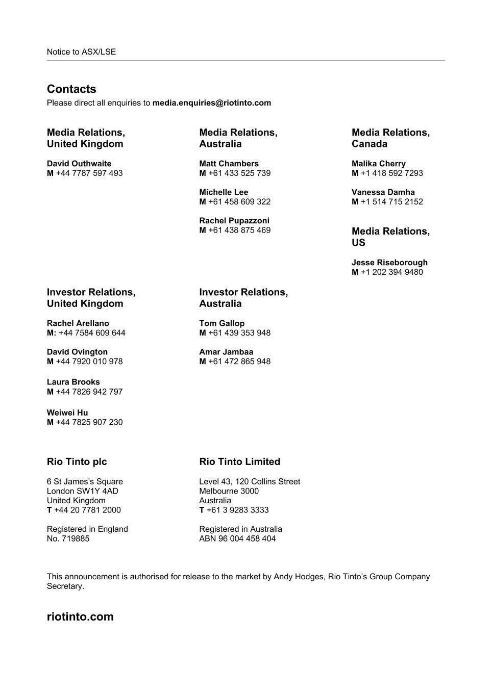Notice to ASX/LSE Contacts Please direct all enquiries to media.enquiries@riotinto.com Media Relations, United Kingdom David Outhwaite M +44 7787 597 493 Media Relations, Australia Matt Chambers M +61 433 525 739 Michelle Lee M +61 458 609 322 Rachel Pupazzoni M +61 438 875 469 Media Relations, Canada Malika Cherry M +1 418 592 7293 Vanessa Damha M +1 514 715 2152 Media Relations, US Jesse Riseborough M +1 202 394 9480 Investor Relations, United Kingdom Rachel Arellano M: +44 7584 609 644 David Ovington M +44 7920 010 978 Laura Brooks M +44 7826 942 797 Weiwei Hu M +44 7825 907 230 Investor Relations, Australia Tom Gallop M +61 439 353 948 Amar Jambaa M +61 472 865 948 Rio Tinto plc 6 St James’s Square London SW1Y 4AD United Kingdom T +44 20 7781 2000 Registered in England No. 719885 Rio Tinto Limited Level 43, 120 Collins Street Melbourne 3000 Australia T +61 3 9283 3333 Registered in Australia ABN 96 004 458 404 This announcement is authorised for release to the market by Andy Hodges, Rio Tinto’s Group Company Secretary. riotinto.com