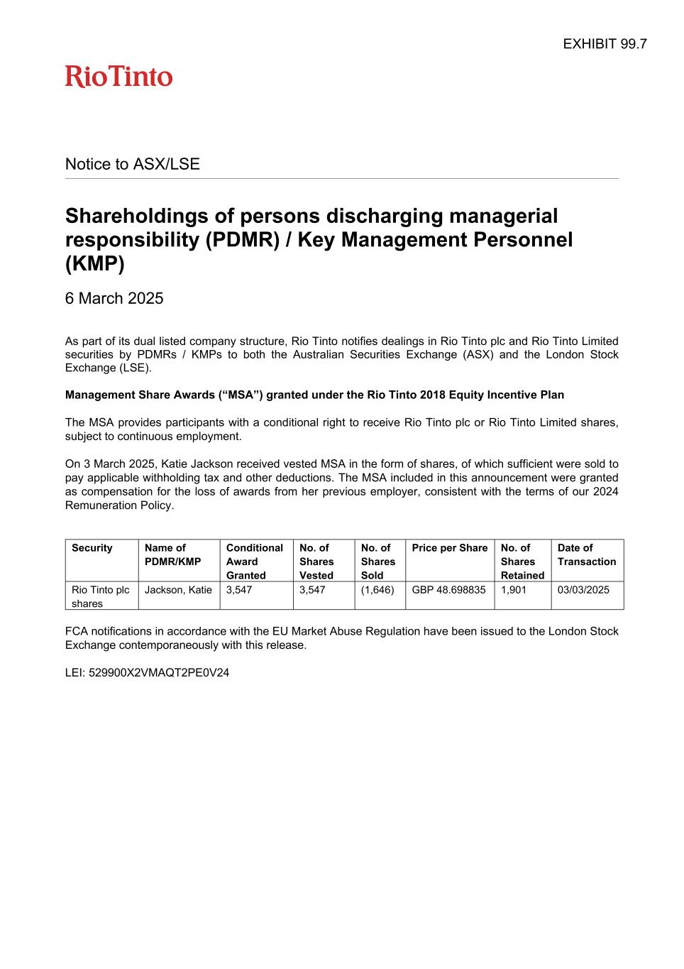 Notice to ASX/LSE Shareholdings of persons discharging managerial responsibility (PDMR) / Key Management Personnel (KMP) 6 March 2025 As part of its dual listed company structure, Rio Tinto notifies dealings in Rio Tinto plc and Rio Tinto Limited securities by PDMRs / KMPs to both the Australian Securities Exchange (ASX) and the London Stock Exchange (LSE). Management Share Awards (“MSA”) granted under the Rio Tinto 2018 Equity Incentive Plan The MSA provides participants with a conditional right to receive Rio Tinto plc or Rio Tinto Limited shares, subject to continuous employment. On 3 March 2025, Katie Jackson received vested MSA in the form of shares, of which sufficient were sold to pay applicable withholding tax and other deductions. The MSA included in this announcement were granted as compensation for the loss of awards from her previous employer, consistent with the terms of our 2024 Remuneration Policy. Security Name of PDMR/KMP Conditional Award Granted No. of Shares Vested No. of Shares Sold Price per Share No. of Shares Retained Date of Transaction Rio Tinto plc shares Jackson, Katie 3,547 3,547 (1,646) GBP 48.698835 1,901 03/03/2025 FCA notifications in accordance with the EU Market Abuse Regulation have been issued to the London Stock Exchange contemporaneously with this release. LEI: 529900X2VMAQT2PE0V24 EXHIBIT 99.7