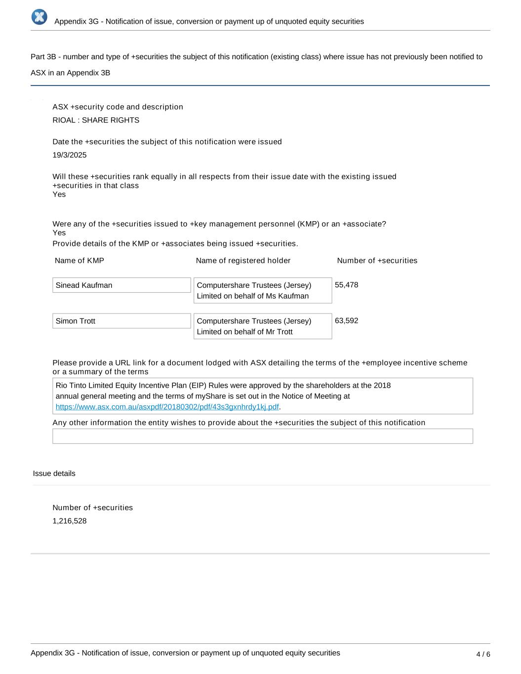Appendix 3G - Notification of issue, conversion or payment up of unquoted equity securities Appendix 3G - Notification of issue, conversion or payment up of unquoted equity securities 4 / 6 Part 3B - number and type of +securities the subject of this notification (existing class) where issue has not previously been notified to ASX in an Appendix 3B ASX +security code and description RIOAL : SHARE RIGHTS Date the +securities the subject of this notification were issued 19/3/2025 Will these +securities rank equally in all respects from their issue date with the existing issued +securities in that class Were any of the +securities issued to +key management personnel (KMP) or an +associate? Provide details of the KMP or +associates being issued +securities. Name of KMP Name of registered holder Number of +securities Sinead Kaufman Computershare Trustees (Jersey) Limited on behalf of Ms Kaufman 55,478 Simon Trott Computershare Trustees (Jersey) Limited on behalf of Mr Trott 63,592 Please provide a URL link for a document lodged with ASX detailing the terms of the +employee incentive scheme or a summary of the terms Rio Tinto Limited Equity Incentive Plan (EIP) Rules were approved by the shareholders at the 2018 annual general meeting and the terms of myShare is set out in the Notice of Meeting at .https://www.asx.com.au/asxpdf/20180302/pdf/43s3gxnhrdy1kj.pdf Any other information the entity wishes to provide about the +securities the subject of this notification Issue details Number of +securities 1,216,528 Yes Yes