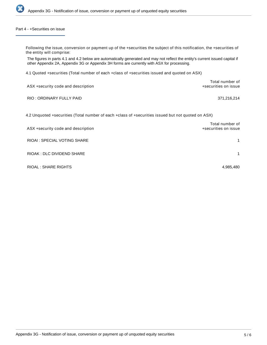 Appendix 3G - Notification of issue, conversion or payment up of unquoted equity securities Appendix 3G - Notification of issue, conversion or payment up of unquoted equity securities 5 / 6 Part 4 - +Securities on issue Following the issue, conversion or payment up of the +securities the subject of this notification, the +securities of the entity will comprise: The figures in parts 4.1 and 4.2 below are automatically generated and may not reflect the entity's current issued capital if other Appendix 2A, Appendix 3G or Appendix 3H forms are currently with ASX for processing. 4.1 Quoted +securities (Total number of each +class of +securities issued and quoted on ASX) ASX +security code and description Total number of +securities on issue RIO : ORDINARY FULLY PAID 371,216,214 4.2 Unquoted +securities (Total number of each +class of +securities issued but not quoted on ASX) ASX +security code and description Total number of +securities on issue RIOAI : SPECIAL VOTING SHARE 1 RIOAK : DLC DIVIDEND SHARE 1 RIOAL : SHARE RIGHTS 4,985,480