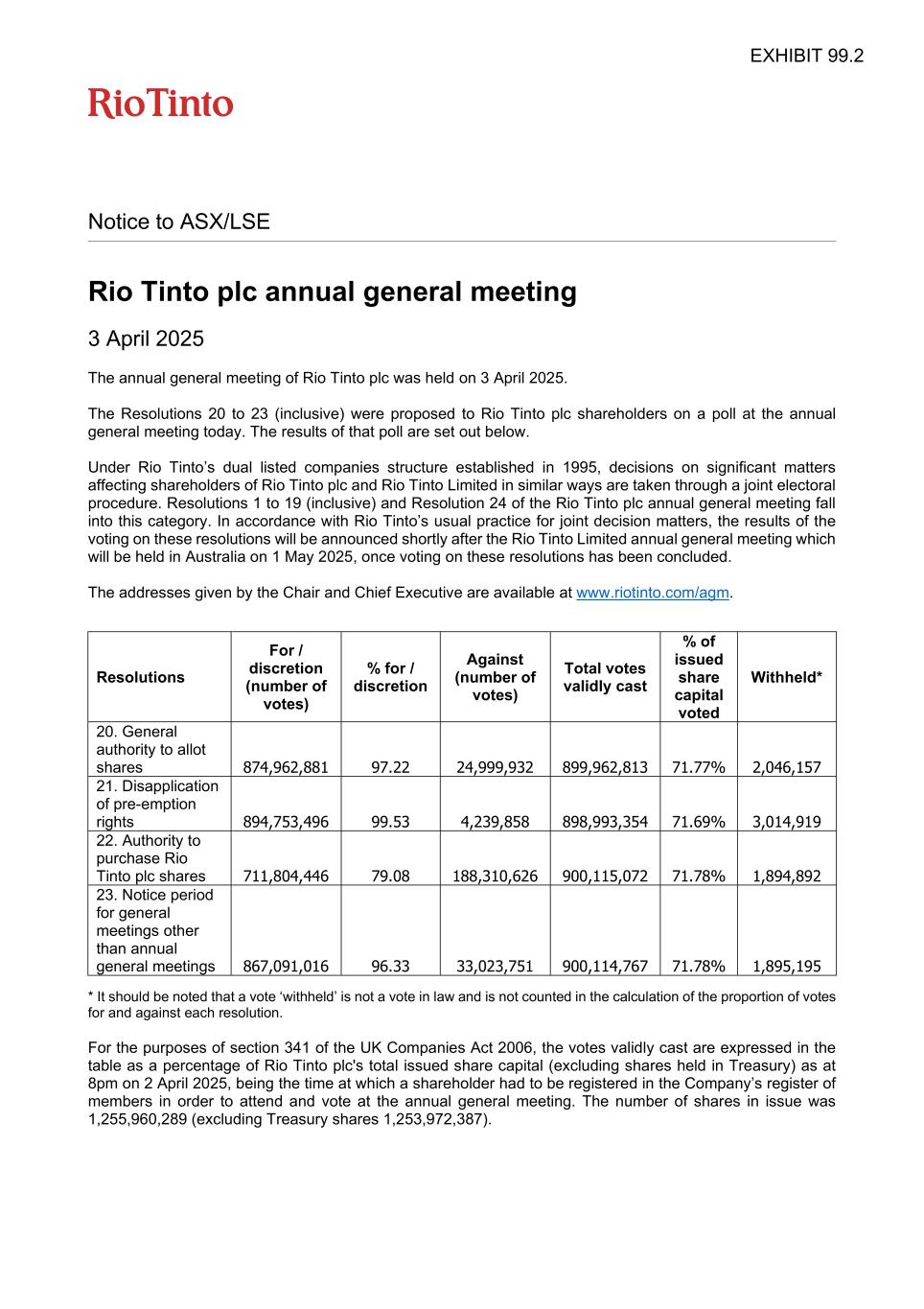 Notice to ASX/LSE Rio Tinto plc annual general meeting 3 April 2025 The annual general meeting of Rio Tinto plc was held on 3 April 2025. The Resolutions 20 to 23 (inclusive) were proposed to Rio Tinto plc shareholders on a poll at the annual general meeting today. The results of that poll are set out below. Under Rio Tinto’s dual listed companies structure established in 1995, decisions on significant matters affecting shareholders of Rio Tinto plc and Rio Tinto Limited in similar ways are taken through a joint electoral procedure. Resolutions 1 to 19 (inclusive) and Resolution 24 of the Rio Tinto plc annual general meeting fall into this category. In accordance with Rio Tinto’s usual practice for joint decision matters, the results of the voting on these resolutions will be announced shortly after the Rio Tinto Limited annual general meeting which will be held in Australia on 1 May 2025, once voting on these resolutions has been concluded. The addresses given by the Chair and Chief Executive are available at www.riotinto.com/agm. Resolutions For / discretion (number of votes) % for / discretion Against (number of votes) Total votes validly cast % of issued share capital voted Withheld* 20. General authority to allot shares 874,962,881 97.22 24,999,932 899,962,813 71.77% 2,046,157 21. Disapplication of pre-emption rights 894,753,496 99.53 4,239,858 898,993,354 71.69% 3,014,919 22. Authority to purchase Rio Tinto plc shares 711,804,446 79.08 188,310,626 900,115,072 71.78% 1,894,892 23. Notice period for general meetings other than annual general meetings 867,091,016 96.33 33,023,751 900,114,767 71.78% 1,895,195 * It should be noted that a vote ‘withheld’ is not a vote in law and is not counted in the calculation of the proportion of votes for and against each resolution. For the purposes of section 341 of the UK Companies Act 2006, the votes validly cast are expressed in the table as a percentage of Rio Tinto plc's total issued share capital (excluding shares held in Treasury) as at 8pm on 2 April 2025, being the time at which a shareholder had to be registered in the Company’s register of members in order to attend and vote at the annual general meeting. The number of shares in issue was 1,255,960,289 (excluding Treasury shares 1,253,972,387). EXHIBIT 99.2