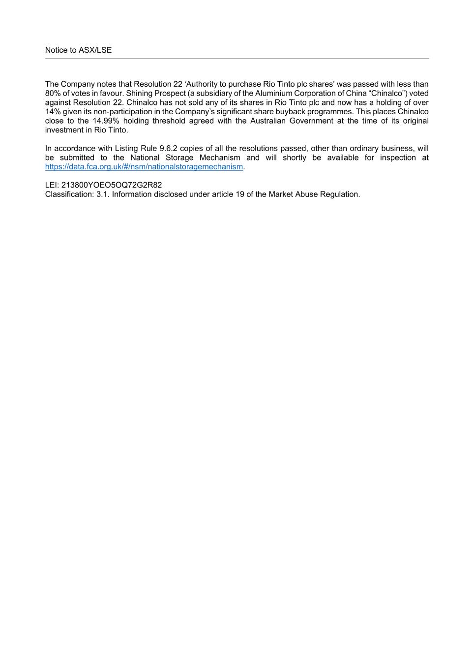 Notice to ASX/LSE The Company notes that Resolution 22 ‘Authority to purchase Rio Tinto plc shares’ was passed with less than 80% of votes in favour. Shining Prospect (a subsidiary of the Aluminium Corporation of China “Chinalco”) voted against Resolution 22. Chinalco has not sold any of its shares in Rio Tinto plc and now has a holding of over 14% given its non-participation in the Company’s significant share buyback programmes. This places Chinalco close to the 14.99% holding threshold agreed with the Australian Government at the time of its original investment in Rio Tinto. In accordance with Listing Rule 9.6.2 copies of all the resolutions passed, other than ordinary business, will be submitted to the National Storage Mechanism and will shortly be available for inspection at https://data.fca.org.uk/#/nsm/nationalstoragemechanism. LEI: 213800YOEO5OQ72G2R82 Classification: 3.1. Information disclosed under article 19 of the Market Abuse Regulation.