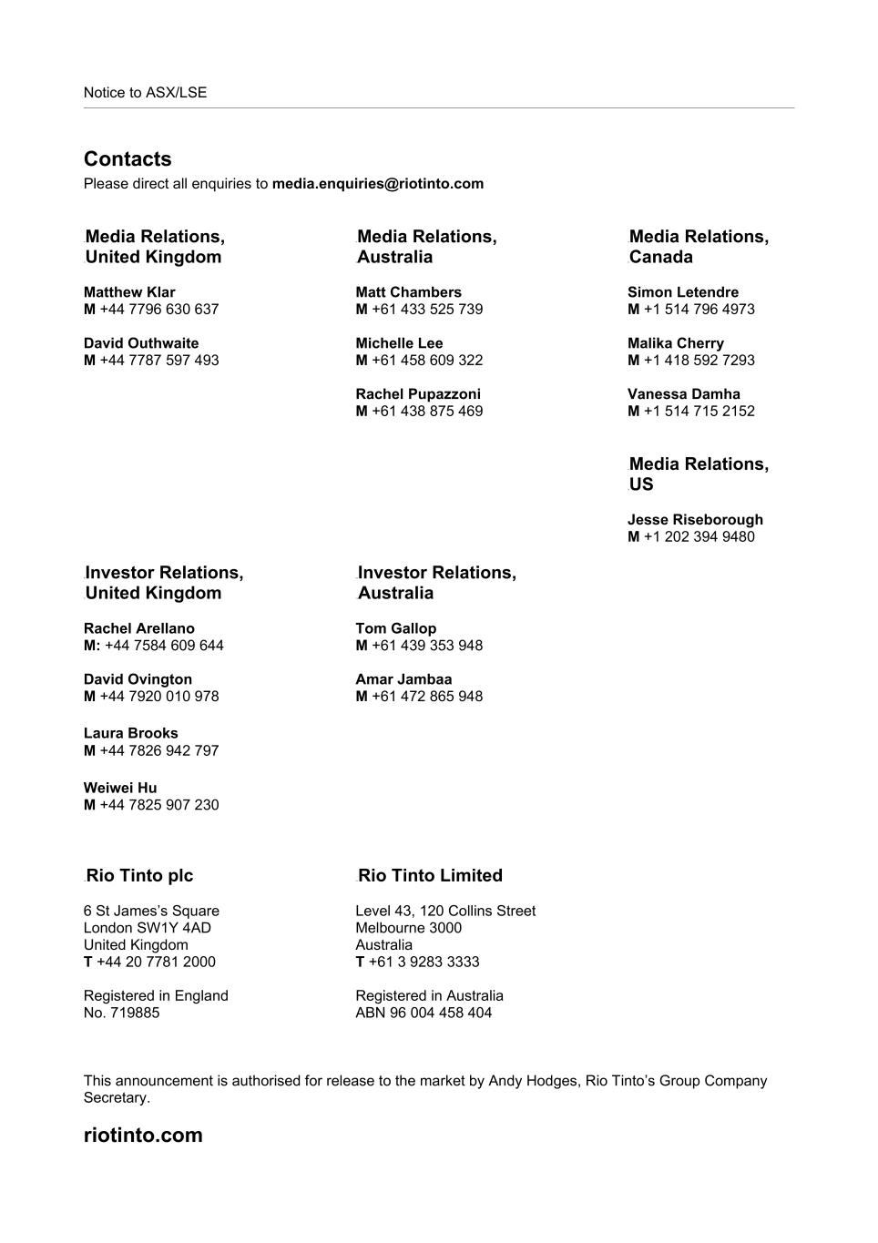 Notice to ASX/LSE Contacts Please direct all enquiries to media.enquiries@riotinto.com 0BMedia Relations, 1BUnited Kingdom Matthew Klar M +44 7796 630 637 David Outhwaite M +44 7787 597 493 2BMedia Relations, 3BAustralia Matt Chambers M +61 433 525 739 Michelle Lee M +61 458 609 322 Rachel Pupazzoni M +61 438 875 469 4BMedia Relations, 5BCanada Simon Letendre M +1 514 796 4973 Malika Cherry M +1 418 592 7293 Vanessa Damha M +1 514 715 2152 6BMedia Relations, 7BUS Jesse Riseborough M +1 202 394 9480 8BInvestor Relations, 9BUnited Kingdom Rachel Arellano M: +44 7584 609 644 David Ovington M +44 7920 010 978 Laura Brooks M +44 7826 942 797 Weiwei Hu M +44 7825 907 230 10BInvestor Relations, 11BAustralia Tom Gallop M +61 439 353 948 Amar Jambaa M +61 472 865 948 12BRio Tinto plc 6 St James’s Square London SW1Y 4AD United Kingdom T +44 20 7781 2000 Registered in England No. 719885 13BRio Tinto Limited Level 43, 120 Collins Street Melbourne 3000 Australia T +61 3 9283 3333 Registered in Australia ABN 96 004 458 404 This announcement is authorised for release to the market by Andy Hodges, Rio Tinto’s Group Company Secretary. riotinto.com